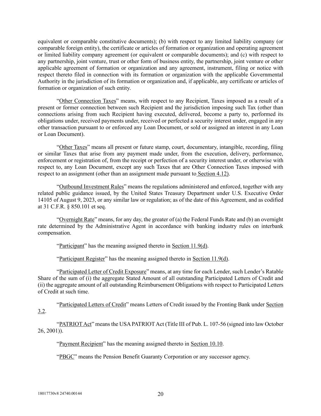 18017730v8 24740.00144 20 equivalent or comparable constitutive documents); (b) with respect to any limited liability company (or comparable foreign entity), the certificate or articles of formation or organization and operating agreement or limited liability company agreement (or equivalent or comparable documents); and (c) with respect to any partnership, joint venture, trust or other form of business entity, the partnership, joint venture or other applicable agreement of formation or organization and any agreement, instrument, filing or notice with respect thereto filed in connection with its formation or organization with the applicable Governmental Authority in the jurisdiction of its formation or organization and, if applicable, any certificate or articles of formation or organization of such entity. “Other Connection Taxes” means, with respect to any Recipient, Taxes imposed as a result of a present or former connection between such Recipient and the jurisdiction imposing such Tax (other than connections arising from such Recipient having executed, delivered, become a party to, performed its obligations under, received payments under, received or perfected a security interest under, engaged in any other transaction pursuant to or enforced any Loan Document, or sold or assigned an interest in any Loan or Loan Document). “Other Taxes” means all present or future stamp, court, documentary, intangible, recording, filing or similar Taxes that arise from any payment made under, from the execution, delivery, performance, enforcement or registration of, from the receipt or perfection of a security interest under, or otherwise with respect to, any Loan Document, except any such Taxes that are Other Connection Taxes imposed with respect to an assignment (other than an assignment made pursuant to Section 4.12). “Outbound Investment Rules” means the regulations administered and enforced, together with any related public guidance issued, by the United States Treasury Department under U.S. Executive Order 14105 of August 9, 2023, or any similar law or regulation; as of the date of this Agreement, and as codified at 31 C.F.R. § 850.101 et seq. “Overnight Rate” means, for any day, the greater of (a) the Federal Funds Rate and (b) an overnight rate determined by the Administrative Agent in accordance with banking industry rules on interbank compensation. “Participant” has the meaning assigned thereto in Section 11.9(d). “Participant Register” has the meaning assigned thereto in Section 11.9(d). “Participated Letter of Credit Exposure” means, at any time for each Lender, such Lender’s Ratable Share of the sum of (i) the aggregate Stated Amount of all outstanding Participated Letters of Credit and (ii) the aggregate amount of all outstanding Reimbursement Obligations with respect to Participated Letters of Credit at such time. “Participated Letters of Credit” means Letters of Credit issued by the Fronting Bank under Section 3.2. “PATRIOT Act” means the USA PATRIOT Act (Title III of Pub. L. 107-56 (signed into law October 26, 2001)). “Payment Recipient” has the meaning assigned thereto in Section 10.10. “PBGC” means the Pension Benefit Guaranty Corporation or any successor agency.