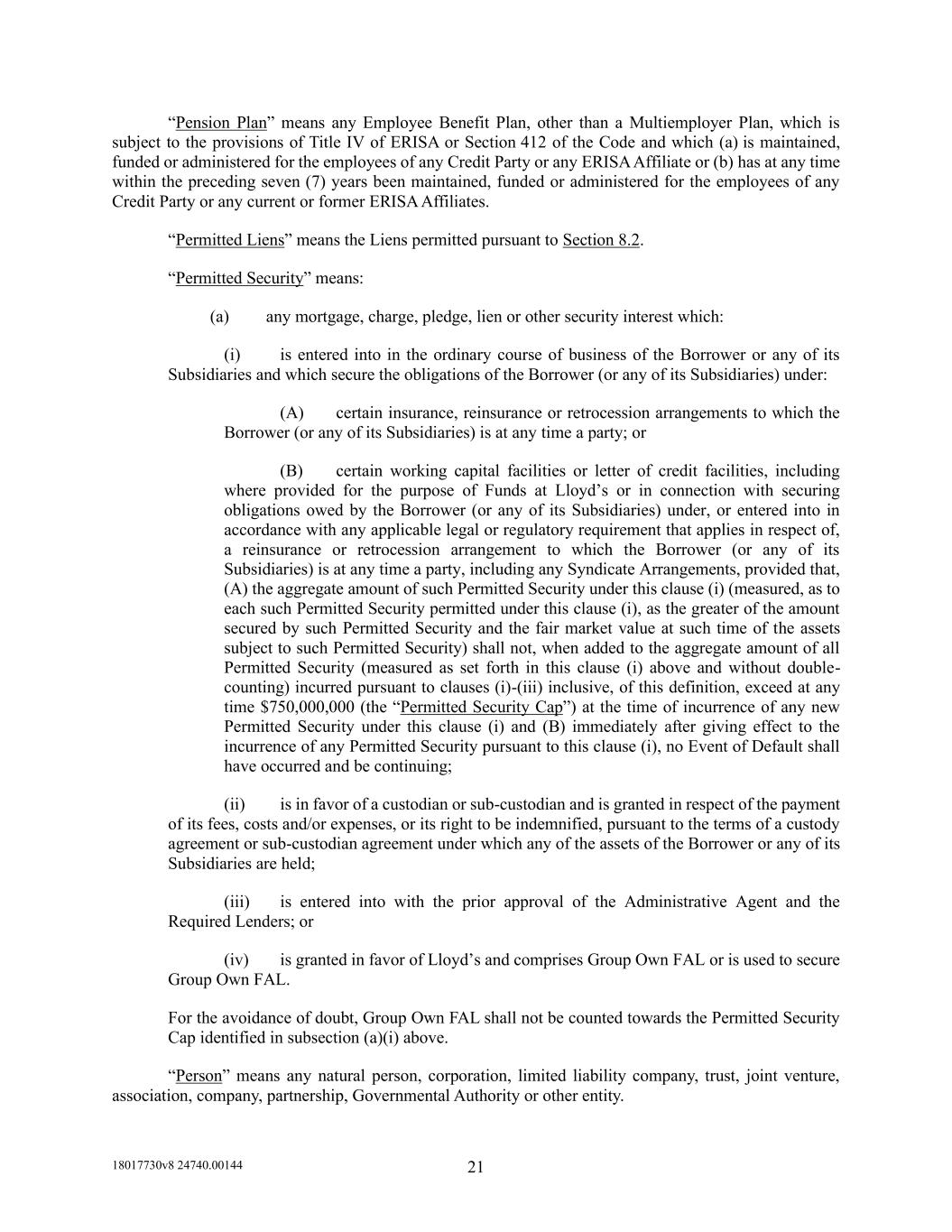18017730v8 24740.00144 21 “Pension Plan” means any Employee Benefit Plan, other than a Multiemployer Plan, which is subject to the provisions of Title IV of ERISA or Section 412 of the Code and which (a) is maintained, funded or administered for the employees of any Credit Party or any ERISA Affiliate or (b) has at any time within the preceding seven (7) years been maintained, funded or administered for the employees of any Credit Party or any current or former ERISA Affiliates. “Permitted Liens” means the Liens permitted pursuant to Section 8.2. “Permitted Security” means: (a) any mortgage, charge, pledge, lien or other security interest which: (i) is entered into in the ordinary course of business of the Borrower or any of its Subsidiaries and which secure the obligations of the Borrower (or any of its Subsidiaries) under: (A) certain insurance, reinsurance or retrocession arrangements to which the Borrower (or any of its Subsidiaries) is at any time a party; or (B) certain working capital facilities or letter of credit facilities, including where provided for the purpose of Funds at Lloyd’s or in connection with securing obligations owed by the Borrower (or any of its Subsidiaries) under, or entered into in accordance with any applicable legal or regulatory requirement that applies in respect of, a reinsurance or retrocession arrangement to which the Borrower (or any of its Subsidiaries) is at any time a party, including any Syndicate Arrangements, provided that, (A) the aggregate amount of such Permitted Security under this clause (i) (measured, as to each such Permitted Security permitted under this clause (i), as the greater of the amount secured by such Permitted Security and the fair market value at such time of the assets subject to such Permitted Security) shall not, when added to the aggregate amount of all Permitted Security (measured as set forth in this clause (i) above and without double- counting) incurred pursuant to clauses (i)-(iii) inclusive, of this definition, exceed at any time $750,000,000 (the “Permitted Security Cap”) at the time of incurrence of any new Permitted Security under this clause (i) and (B) immediately after giving effect to the incurrence of any Permitted Security pursuant to this clause (i), no Event of Default shall have occurred and be continuing; (ii) is in favor of a custodian or sub-custodian and is granted in respect of the payment of its fees, costs and/or expenses, or its right to be indemnified, pursuant to the terms of a custody agreement or sub-custodian agreement under which any of the assets of the Borrower or any of its Subsidiaries are held; (iii) is entered into with the prior approval of the Administrative Agent and the Required Lenders; or (iv) is granted in favor of Lloyd’s and comprises Group Own FAL or is used to secure Group Own FAL. For the avoidance of doubt, Group Own FAL shall not be counted towards the Permitted Security Cap identified in subsection (a)(i) above. “Person” means any natural person, corporation, limited liability company, trust, joint venture, association, company, partnership, Governmental Authority or other entity.