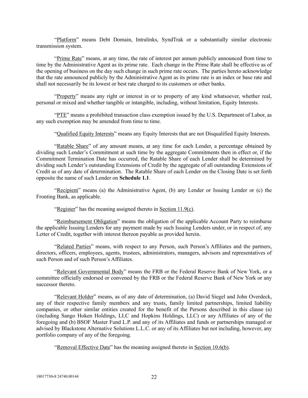 18017730v8 24740.00144 22 “Platform” means Debt Domain, Intralinks, SyndTrak or a substantially similar electronic transmission system. “Prime Rate” means, at any time, the rate of interest per annum publicly announced from time to time by the Administrative Agent as its prime rate. Each change in the Prime Rate shall be effective as of the opening of business on the day such change in such prime rate occurs. The parties hereto acknowledge that the rate announced publicly by the Administrative Agent as its prime rate is an index or base rate and shall not necessarily be its lowest or best rate charged to its customers or other banks. “Property” means any right or interest in or to property of any kind whatsoever, whether real, personal or mixed and whether tangible or intangible, including, without limitation, Equity Interests. “PTE” means a prohibited transaction class exemption issued by the U.S. Department of Labor, as any such exemption may be amended from time to time. “Qualified Equity Interests” means any Equity Interests that are not Disqualified Equity Interests. “Ratable Share” of any amount means, at any time for each Lender, a percentage obtained by dividing such Lender’s Commitment at such time by the aggregate Commitments then in effect or, if the Commitment Termination Date has occurred, the Ratable Share of each Lender shall be determined by dividing such Lender’s outstanding Extensions of Credit by the aggregate of all outstanding Extensions of Credit as of any date of determination. The Ratable Share of each Lender on the Closing Date is set forth opposite the name of such Lender on Schedule 1.1. “Recipient” means (a) the Administrative Agent, (b) any Lender or Issuing Lender or (c) the Fronting Bank, as applicable. “Register” has the meaning assigned thereto in Section 11.9(c). “Reimbursement Obligation” means the obligation of the applicable Account Party to reimburse the applicable Issuing Lenders for any payment made by such Issuing Lenders under, or in respect of, any Letter of Credit, together with interest thereon payable as provided herein. “Related Parties” means, with respect to any Person, such Person’s Affiliates and the partners, directors, officers, employees, agents, trustees, administrators, managers, advisors and representatives of such Person and of such Person’s Affiliates. “Relevant Governmental Body” means the FRB or the Federal Reserve Bank of New York, or a committee officially endorsed or convened by the FRB or the Federal Reserve Bank of New York or any successor thereto. “Relevant Holder” means, as of any date of determination, (a) David Siegel and John Overdeck, any of their respective family members and any trusts, family limited partnerships, limited liability companies, or other similar entities created for the benefit of the Persons described in this clause (a) (including Sango Hoken Holdings, LLC and Hopkins Holdings, LLC) or any Affiliates of any of the foregoing and (b) BSOF Master Fund L.P. and any of its Affiliates and funds or partnerships managed or advised by Blackstone Alternative Solutions L.L.C. or any of its Affiliates but not including, however, any portfolio company of any of the foregoing. “Removal Effective Date” has the meaning assigned thereto in Section 10.6(b).