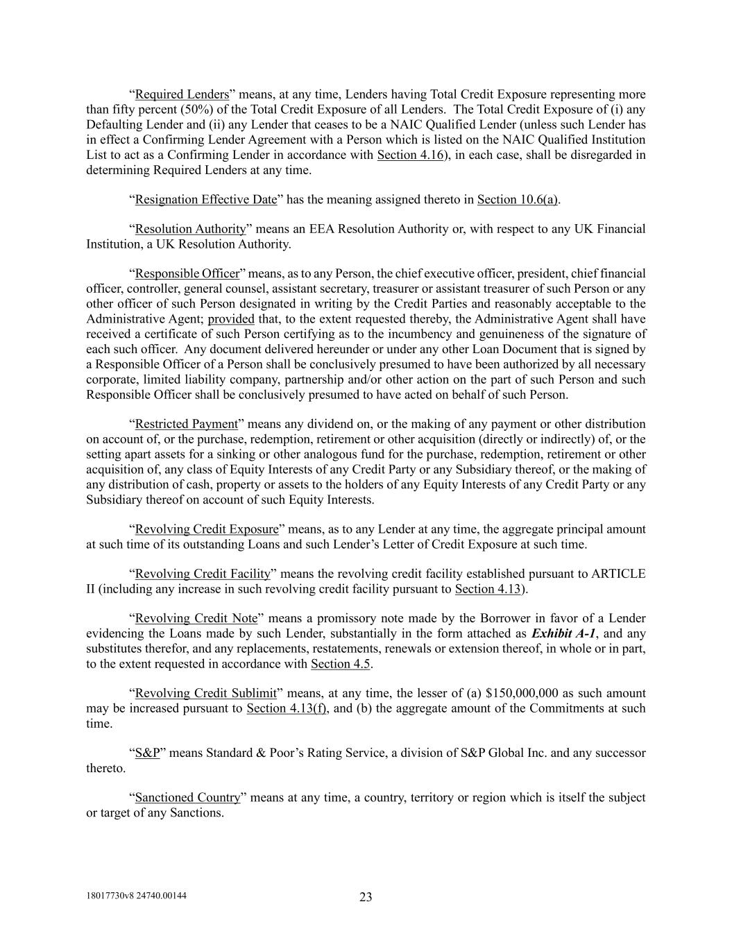 18017730v8 24740.00144 23 “Required Lenders” means, at any time, Lenders having Total Credit Exposure representing more than fifty percent (50%) of the Total Credit Exposure of all Lenders. The Total Credit Exposure of (i) any Defaulting Lender and (ii) any Lender that ceases to be a NAIC Qualified Lender (unless such Lender has in effect a Confirming Lender Agreement with a Person which is listed on the NAIC Qualified Institution List to act as a Confirming Lender in accordance with Section 4.16), in each case, shall be disregarded in determining Required Lenders at any time. “Resignation Effective Date” has the meaning assigned thereto in Section 10.6(a). “Resolution Authority” means an EEA Resolution Authority or, with respect to any UK Financial Institution, a UK Resolution Authority. “Responsible Officer” means, as to any Person, the chief executive officer, president, chief financial officer, controller, general counsel, assistant secretary, treasurer or assistant treasurer of such Person or any other officer of such Person designated in writing by the Credit Parties and reasonably acceptable to the Administrative Agent; provided that, to the extent requested thereby, the Administrative Agent shall have received a certificate of such Person certifying as to the incumbency and genuineness of the signature of each such officer. Any document delivered hereunder or under any other Loan Document that is signed by a Responsible Officer of a Person shall be conclusively presumed to have been authorized by all necessary corporate, limited liability company, partnership and/or other action on the part of such Person and such Responsible Officer shall be conclusively presumed to have acted on behalf of such Person. “Restricted Payment” means any dividend on, or the making of any payment or other distribution on account of, or the purchase, redemption, retirement or other acquisition (directly or indirectly) of, or the setting apart assets for a sinking or other analogous fund for the purchase, redemption, retirement or other acquisition of, any class of Equity Interests of any Credit Party or any Subsidiary thereof, or the making of any distribution of cash, property or assets to the holders of any Equity Interests of any Credit Party or any Subsidiary thereof on account of such Equity Interests. “Revolving Credit Exposure” means, as to any Lender at any time, the aggregate principal amount at such time of its outstanding Loans and such Lender’s Letter of Credit Exposure at such time. “Revolving Credit Facility” means the revolving credit facility established pursuant to ARTICLE II (including any increase in such revolving credit facility pursuant to Section 4.13). “Revolving Credit Note” means a promissory note made by the Borrower in favor of a Lender evidencing the Loans made by such Lender, substantially in the form attached as Exhibit A-1, and any substitutes therefor, and any replacements, restatements, renewals or extension thereof, in whole or in part, to the extent requested in accordance with Section 4.5. “Revolving Credit Sublimit” means, at any time, the lesser of (a) $150,000,000 as such amount may be increased pursuant to Section 4.13(f), and (b) the aggregate amount of the Commitments at such time. “S&P” means Standard & Poor’s Rating Service, a division of S&P Global Inc. and any successor thereto. “Sanctioned Country” means at any time, a country, territory or region which is itself the subject or target of any Sanctions.