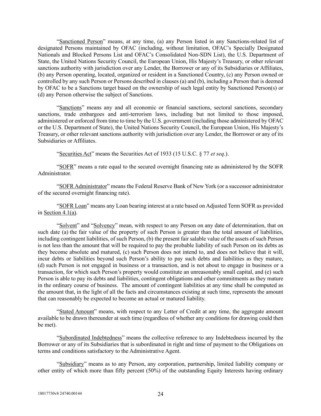18017730v8 24740.00144 24 “Sanctioned Person” means, at any time, (a) any Person listed in any Sanctions-related list of designated Persons maintained by OFAC (including, without limitation, OFAC’s Specially Designated Nationals and Blocked Persons List and OFAC’s Consolidated Non-SDN List), the U.S. Department of State, the United Nations Security Council, the European Union, His Majesty’s Treasury, or other relevant sanctions authority with jurisdiction over any Lender, the Borrower or any of its Subsidiaries or Affiliates, (b) any Person operating, located, organized or resident in a Sanctioned Country, (c) any Person owned or controlled by any such Person or Persons described in clauses (a) and (b), including a Person that is deemed by OFAC to be a Sanctions target based on the ownership of such legal entity by Sanctioned Person(s) or (d) any Person otherwise the subject of Sanctions. “Sanctions” means any and all economic or financial sanctions, sectoral sanctions, secondary sanctions, trade embargoes and anti-terrorism laws, including but not limited to those imposed, administered or enforced from time to time by the U.S. government (including those administered by OFAC or the U.S. Department of State), the United Nations Security Council, the European Union, His Majesty’s Treasury, or other relevant sanctions authority with jurisdiction over any Lender, the Borrower or any of its Subsidiaries or Affiliates. “Securities Act” means the Securities Act of 1933 (15 U.S.C. § 77 et seq.). “SOFR” means a rate equal to the secured overnight financing rate as administered by the SOFR Administrator. “SOFR Administrator” means the Federal Reserve Bank of New York (or a successor administrator of the secured overnight financing rate). “SOFR Loan” means any Loan bearing interest at a rate based on Adjusted Term SOFR as provided in Section 4.1(a). “Solvent” and “Solvency” mean, with respect to any Person on any date of determination, that on such date (a) the fair value of the property of such Person is greater than the total amount of liabilities, including contingent liabilities, of such Person, (b) the present fair salable value of the assets of such Person is not less than the amount that will be required to pay the probable liability of such Person on its debts as they become absolute and matured, (c) such Person does not intend to, and does not believe that it will, incur debts or liabilities beyond such Person’s ability to pay such debts and liabilities as they mature, (d) such Person is not engaged in business or a transaction, and is not about to engage in business or a transaction, for which such Person’s property would constitute an unreasonably small capital, and (e) such Person is able to pay its debts and liabilities, contingent obligations and other commitments as they mature in the ordinary course of business. The amount of contingent liabilities at any time shall be computed as the amount that, in the light of all the facts and circumstances existing at such time, represents the amount that can reasonably be expected to become an actual or matured liability. “Stated Amount” means, with respect to any Letter of Credit at any time, the aggregate amount available to be drawn thereunder at such time (regardless of whether any conditions for drawing could then be met). “Subordinated Indebtedness” means the collective reference to any Indebtedness incurred by the Borrower or any of its Subsidiaries that is subordinated in right and time of payment to the Obligations on terms and conditions satisfactory to the Administrative Agent. “Subsidiary” means as to any Person, any corporation, partnership, limited liability company or other entity of which more than fifty percent (50%) of the outstanding Equity Interests having ordinary