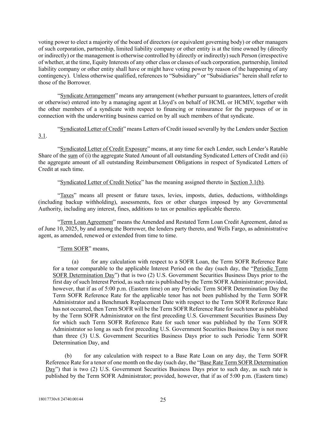 18017730v8 24740.00144 25 voting power to elect a majority of the board of directors (or equivalent governing body) or other managers of such corporation, partnership, limited liability company or other entity is at the time owned by (directly or indirectly) or the management is otherwise controlled by (directly or indirectly) such Person (irrespective of whether, at the time, Equity Interests of any other class or classes of such corporation, partnership, limited liability company or other entity shall have or might have voting power by reason of the happening of any contingency). Unless otherwise qualified, references to “Subsidiary” or “Subsidiaries” herein shall refer to those of the Borrower. “Syndicate Arrangement” means any arrangement (whether pursuant to guarantees, letters of credit or otherwise) entered into by a managing agent at Lloyd’s on behalf of HCML or HCMIV, together with the other members of a syndicate with respect to financing or reinsurance for the purposes of or in connection with the underwriting business carried on by all such members of that syndicate. “Syndicated Letter of Credit” means Letters of Credit issued severally by the Lenders under Section 3.1. “Syndicated Letter of Credit Exposure” means, at any time for each Lender, such Lender’s Ratable Share of the sum of (i) the aggregate Stated Amount of all outstanding Syndicated Letters of Credit and (ii) the aggregate amount of all outstanding Reimbursement Obligations in respect of Syndicated Letters of Credit at such time. “Syndicated Letter of Credit Notice” has the meaning assigned thereto in Section 3.1(b). “Taxes” means all present or future taxes, levies, imposts, duties, deductions, withholdings (including backup withholding), assessments, fees or other charges imposed by any Governmental Authority, including any interest, fines, additions to tax or penalties applicable thereto. “Term Loan Agreement” means the Amended and Restated Term Loan Credit Agreement, dated as of June 10, 2025, by and among the Borrower, the lenders party thereto, and Wells Fargo, as administrative agent, as amended, renewed or extended from time to time. “Term SOFR” means, (a) for any calculation with respect to a SOFR Loan, the Term SOFR Reference Rate for a tenor comparable to the applicable Interest Period on the day (such day, the “Periodic Term SOFR Determination Day”) that is two (2) U.S. Government Securities Business Days prior to the first day of such Interest Period, as such rate is published by the Term SOFR Administrator; provided, however, that if as of 5:00 p.m. (Eastern time) on any Periodic Term SOFR Determination Day the Term SOFR Reference Rate for the applicable tenor has not been published by the Term SOFR Administrator and a Benchmark Replacement Date with respect to the Term SOFR Reference Rate has not occurred, then Term SOFR will be the Term SOFR Reference Rate for such tenor as published by the Term SOFR Administrator on the first preceding U.S. Government Securities Business Day for which such Term SOFR Reference Rate for such tenor was published by the Term SOFR Administrator so long as such first preceding U.S. Government Securities Business Day is not more than three (3) U.S. Government Securities Business Days prior to such Periodic Term SOFR Determination Day, and (b) for any calculation with respect to a Base Rate Loan on any day, the Term SOFR Reference Rate for a tenor of one month on the day (such day, the “Base Rate Term SOFR Determination Day”) that is two (2) U.S. Government Securities Business Days prior to such day, as such rate is published by the Term SOFR Administrator; provided, however, that if as of 5:00 p.m. (Eastern time)