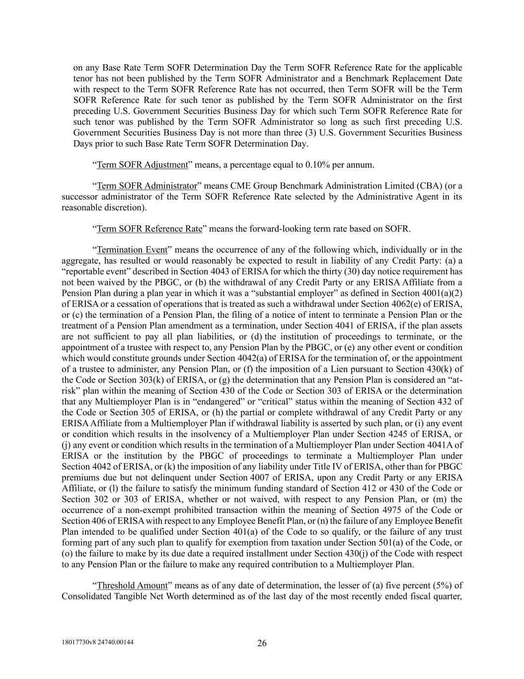 18017730v8 24740.00144 26 on any Base Rate Term SOFR Determination Day the Term SOFR Reference Rate for the applicable tenor has not been published by the Term SOFR Administrator and a Benchmark Replacement Date with respect to the Term SOFR Reference Rate has not occurred, then Term SOFR will be the Term SOFR Reference Rate for such tenor as published by the Term SOFR Administrator on the first preceding U.S. Government Securities Business Day for which such Term SOFR Reference Rate for such tenor was published by the Term SOFR Administrator so long as such first preceding U.S. Government Securities Business Day is not more than three (3) U.S. Government Securities Business Days prior to such Base Rate Term SOFR Determination Day. “Term SOFR Adjustment” means, a percentage equal to 0.10% per annum. “Term SOFR Administrator” means CME Group Benchmark Administration Limited (CBA) (or a successor administrator of the Term SOFR Reference Rate selected by the Administrative Agent in its reasonable discretion). “Term SOFR Reference Rate” means the forward-looking term rate based on SOFR. “Termination Event” means the occurrence of any of the following which, individually or in the aggregate, has resulted or would reasonably be expected to result in liability of any Credit Party: (a) a “reportable event” described in Section 4043 of ERISA for which the thirty (30) day notice requirement has not been waived by the PBGC, or (b) the withdrawal of any Credit Party or any ERISA Affiliate from a Pension Plan during a plan year in which it was a “substantial employer” as defined in Section 4001(a)(2) of ERISA or a cessation of operations that is treated as such a withdrawal under Section 4062(e) of ERISA, or (c) the termination of a Pension Plan, the filing of a notice of intent to terminate a Pension Plan or the treatment of a Pension Plan amendment as a termination, under Section 4041 of ERISA, if the plan assets are not sufficient to pay all plan liabilities, or (d) the institution of proceedings to terminate, or the appointment of a trustee with respect to, any Pension Plan by the PBGC, or (e) any other event or condition which would constitute grounds under Section 4042(a) of ERISA for the termination of, or the appointment of a trustee to administer, any Pension Plan, or (f) the imposition of a Lien pursuant to Section 430(k) of the Code or Section 303(k) of ERISA, or (g) the determination that any Pension Plan is considered an “at- risk” plan within the meaning of Section 430 of the Code or Section 303 of ERISA or the determination that any Multiemployer Plan is in “endangered” or “critical” status within the meaning of Section 432 of the Code or Section 305 of ERISA, or (h) the partial or complete withdrawal of any Credit Party or any ERISA Affiliate from a Multiemployer Plan if withdrawal liability is asserted by such plan, or (i) any event or condition which results in the insolvency of a Multiemployer Plan under Section 4245 of ERISA, or (j) any event or condition which results in the termination of a Multiemployer Plan under Section 4041A of ERISA or the institution by the PBGC of proceedings to terminate a Multiemployer Plan under Section 4042 of ERISA, or (k) the imposition of any liability under Title IV of ERISA, other than for PBGC premiums due but not delinquent under Section 4007 of ERISA, upon any Credit Party or any ERISA Affiliate, or (l) the failure to satisfy the minimum funding standard of Section 412 or 430 of the Code or Section 302 or 303 of ERISA, whether or not waived, with respect to any Pension Plan, or (m) the occurrence of a non-exempt prohibited transaction within the meaning of Section 4975 of the Code or Section 406 of ERISA with respect to any Employee Benefit Plan, or (n) the failure of any Employee Benefit Plan intended to be qualified under Section 401(a) of the Code to so qualify, or the failure of any trust forming part of any such plan to qualify for exemption from taxation under Section 501(a) of the Code, or (o) the failure to make by its due date a required installment under Section 430(j) of the Code with respect to any Pension Plan or the failure to make any required contribution to a Multiemployer Plan. “Threshold Amount” means as of any date of determination, the lesser of (a) five percent (5%) of Consolidated Tangible Net Worth determined as of the last day of the most recently ended fiscal quarter,