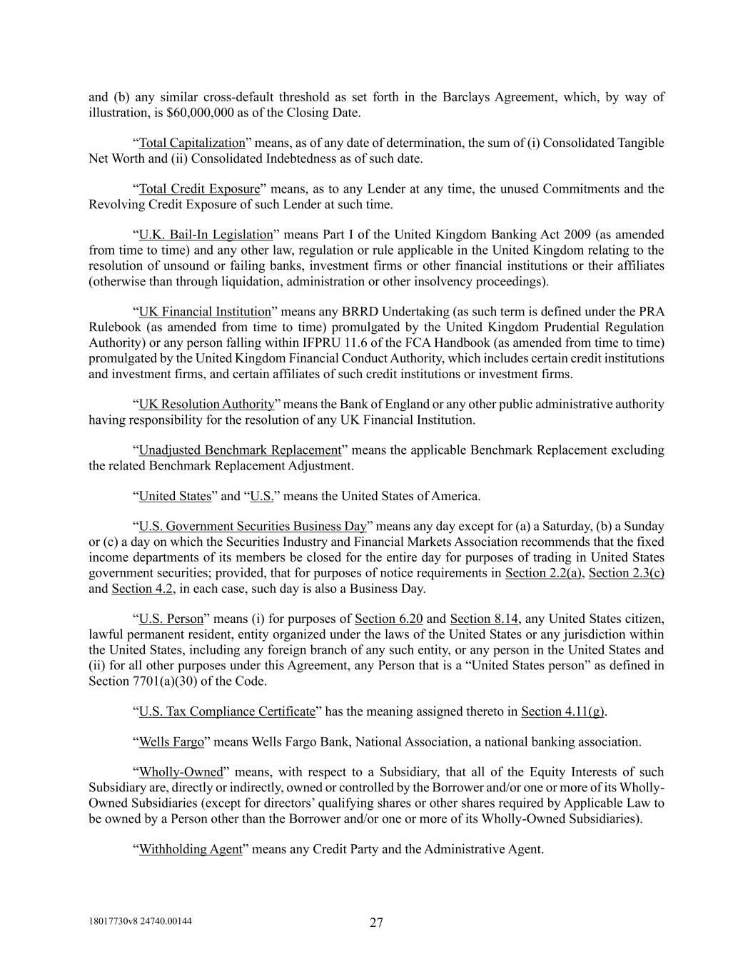 18017730v8 24740.00144 27 and (b) any similar cross-default threshold as set forth in the Barclays Agreement, which, by way of illustration, is $60,000,000 as of the Closing Date. “Total Capitalization” means, as of any date of determination, the sum of (i) Consolidated Tangible Net Worth and (ii) Consolidated Indebtedness as of such date. “Total Credit Exposure” means, as to any Lender at any time, the unused Commitments and the Revolving Credit Exposure of such Lender at such time. “U.K. Bail-In Legislation” means Part I of the United Kingdom Banking Act 2009 (as amended from time to time) and any other law, regulation or rule applicable in the United Kingdom relating to the resolution of unsound or failing banks, investment firms or other financial institutions or their affiliates (otherwise than through liquidation, administration or other insolvency proceedings). “UK Financial Institution” means any BRRD Undertaking (as such term is defined under the PRA Rulebook (as amended from time to time) promulgated by the United Kingdom Prudential Regulation Authority) or any person falling within IFPRU 11.6 of the FCA Handbook (as amended from time to time) promulgated by the United Kingdom Financial Conduct Authority, which includes certain credit institutions and investment firms, and certain affiliates of such credit institutions or investment firms. “UK Resolution Authority” means the Bank of England or any other public administrative authority having responsibility for the resolution of any UK Financial Institution. “Unadjusted Benchmark Replacement” means the applicable Benchmark Replacement excluding the related Benchmark Replacement Adjustment. “United States” and “U.S.” means the United States of America. “U.S. Government Securities Business Day” means any day except for (a) a Saturday, (b) a Sunday or (c) a day on which the Securities Industry and Financial Markets Association recommends that the fixed income departments of its members be closed for the entire day for purposes of trading in United States government securities; provided, that for purposes of notice requirements in Section 2.2(a), Section 2.3(c) and Section 4.2, in each case, such day is also a Business Day. “U.S. Person” means (i) for purposes of Section 6.20 and Section 8.14, any United States citizen, lawful permanent resident, entity organized under the laws of the United States or any jurisdiction within the United States, including any foreign branch of any such entity, or any person in the United States and (ii) for all other purposes under this Agreement, any Person that is a “United States person” as defined in Section 7701(a)(30) of the Code. “U.S. Tax Compliance Certificate” has the meaning assigned thereto in Section 4.11(g). “Wells Fargo” means Wells Fargo Bank, National Association, a national banking association. “Wholly-Owned” means, with respect to a Subsidiary, that all of the Equity Interests of such Subsidiary are, directly or indirectly, owned or controlled by the Borrower and/or one or more of its Wholly- Owned Subsidiaries (except for directors’ qualifying shares or other shares required by Applicable Law to be owned by a Person other than the Borrower and/or one or more of its Wholly-Owned Subsidiaries). “Withholding Agent” means any Credit Party and the Administrative Agent.