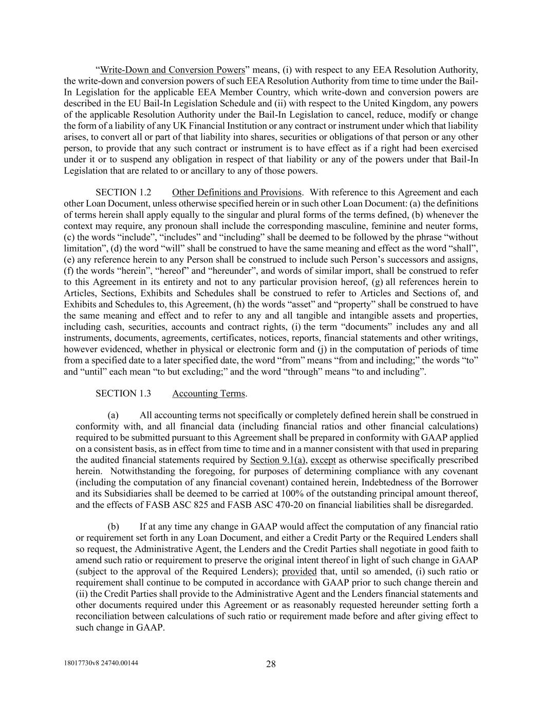 18017730v8 24740.00144 28 “Write-Down and Conversion Powers” means, (i) with respect to any EEA Resolution Authority, the write-down and conversion powers of such EEA Resolution Authority from time to time under the Bail- In Legislation for the applicable EEA Member Country, which write-down and conversion powers are described in the EU Bail-In Legislation Schedule and (ii) with respect to the United Kingdom, any powers of the applicable Resolution Authority under the Bail-In Legislation to cancel, reduce, modify or change the form of a liability of any UK Financial Institution or any contract or instrument under which that liability arises, to convert all or part of that liability into shares, securities or obligations of that person or any other person, to provide that any such contract or instrument is to have effect as if a right had been exercised under it or to suspend any obligation in respect of that liability or any of the powers under that Bail-In Legislation that are related to or ancillary to any of those powers. SECTION 1.2 Other Definitions and Provisions. With reference to this Agreement and each other Loan Document, unless otherwise specified herein or in such other Loan Document: (a) the definitions of terms herein shall apply equally to the singular and plural forms of the terms defined, (b) whenever the context may require, any pronoun shall include the corresponding masculine, feminine and neuter forms, (c) the words “include”, “includes” and “including” shall be deemed to be followed by the phrase “without limitation”, (d) the word “will” shall be construed to have the same meaning and effect as the word “shall”, (e) any reference herein to any Person shall be construed to include such Person’s successors and assigns, (f) the words “herein”, “hereof” and “hereunder”, and words of similar import, shall be construed to refer to this Agreement in its entirety and not to any particular provision hereof, (g) all references herein to Articles, Sections, Exhibits and Schedules shall be construed to refer to Articles and Sections of, and Exhibits and Schedules to, this Agreement, (h) the words “asset” and “property” shall be construed to have the same meaning and effect and to refer to any and all tangible and intangible assets and properties, including cash, securities, accounts and contract rights, (i) the term “documents” includes any and all instruments, documents, agreements, certificates, notices, reports, financial statements and other writings, however evidenced, whether in physical or electronic form and (j) in the computation of periods of time from a specified date to a later specified date, the word “from” means “from and including;” the words “to” and “until” each mean “to but excluding;” and the word “through” means “to and including”. SECTION 1.3 Accounting Terms. (a) All accounting terms not specifically or completely defined herein shall be construed in conformity with, and all financial data (including financial ratios and other financial calculations) required to be submitted pursuant to this Agreement shall be prepared in conformity with GAAP applied on a consistent basis, as in effect from time to time and in a manner consistent with that used in preparing the audited financial statements required by Section 9.1(a), except as otherwise specifically prescribed herein. Notwithstanding the foregoing, for purposes of determining compliance with any covenant (including the computation of any financial covenant) contained herein, Indebtedness of the Borrower and its Subsidiaries shall be deemed to be carried at 100% of the outstanding principal amount thereof, and the effects of FASB ASC 825 and FASB ASC 470-20 on financial liabilities shall be disregarded. (b) If at any time any change in GAAP would affect the computation of any financial ratio or requirement set forth in any Loan Document, and either a Credit Party or the Required Lenders shall so request, the Administrative Agent, the Lenders and the Credit Parties shall negotiate in good faith to amend such ratio or requirement to preserve the original intent thereof in light of such change in GAAP (subject to the approval of the Required Lenders); provided that, until so amended, (i) such ratio or requirement shall continue to be computed in accordance with GAAP prior to such change therein and (ii) the Credit Parties shall provide to the Administrative Agent and the Lenders financial statements and other documents required under this Agreement or as reasonably requested hereunder setting forth a reconciliation between calculations of such ratio or requirement made before and after giving effect to such change in GAAP.