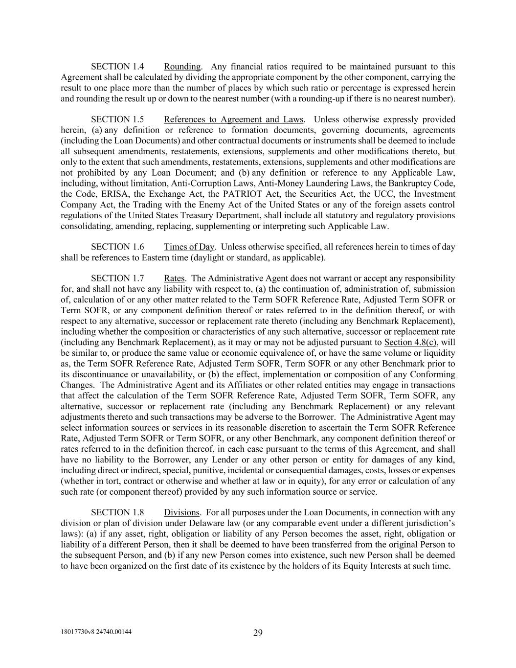 18017730v8 24740.00144 29 SECTION 1.4 Rounding. Any financial ratios required to be maintained pursuant to this Agreement shall be calculated by dividing the appropriate component by the other component, carrying the result to one place more than the number of places by which such ratio or percentage is expressed herein and rounding the result up or down to the nearest number (with a rounding-up if there is no nearest number). SECTION 1.5 References to Agreement and Laws. Unless otherwise expressly provided herein, (a) any definition or reference to formation documents, governing documents, agreements (including the Loan Documents) and other contractual documents or instruments shall be deemed to include all subsequent amendments, restatements, extensions, supplements and other modifications thereto, but only to the extent that such amendments, restatements, extensions, supplements and other modifications are not prohibited by any Loan Document; and (b) any definition or reference to any Applicable Law, including, without limitation, Anti-Corruption Laws, Anti-Money Laundering Laws, the Bankruptcy Code, the Code, ERISA, the Exchange Act, the PATRIOT Act, the Securities Act, the UCC, the Investment Company Act, the Trading with the Enemy Act of the United States or any of the foreign assets control regulations of the United States Treasury Department, shall include all statutory and regulatory provisions consolidating, amending, replacing, supplementing or interpreting such Applicable Law. SECTION 1.6 Times of Day. Unless otherwise specified, all references herein to times of day shall be references to Eastern time (daylight or standard, as applicable). SECTION 1.7 Rates. The Administrative Agent does not warrant or accept any responsibility for, and shall not have any liability with respect to, (a) the continuation of, administration of, submission of, calculation of or any other matter related to the Term SOFR Reference Rate, Adjusted Term SOFR or Term SOFR, or any component definition thereof or rates referred to in the definition thereof, or with respect to any alternative, successor or replacement rate thereto (including any Benchmark Replacement), including whether the composition or characteristics of any such alternative, successor or replacement rate (including any Benchmark Replacement), as it may or may not be adjusted pursuant to Section 4.8(c), will be similar to, or produce the same value or economic equivalence of, or have the same volume or liquidity as, the Term SOFR Reference Rate, Adjusted Term SOFR, Term SOFR or any other Benchmark prior to its discontinuance or unavailability, or (b) the effect, implementation or composition of any Conforming Changes. The Administrative Agent and its Affiliates or other related entities may engage in transactions that affect the calculation of the Term SOFR Reference Rate, Adjusted Term SOFR, Term SOFR, any alternative, successor or replacement rate (including any Benchmark Replacement) or any relevant adjustments thereto and such transactions may be adverse to the Borrower. The Administrative Agent may select information sources or services in its reasonable discretion to ascertain the Term SOFR Reference Rate, Adjusted Term SOFR or Term SOFR, or any other Benchmark, any component definition thereof or rates referred to in the definition thereof, in each case pursuant to the terms of this Agreement, and shall have no liability to the Borrower, any Lender or any other person or entity for damages of any kind, including direct or indirect, special, punitive, incidental or consequential damages, costs, losses or expenses (whether in tort, contract or otherwise and whether at law or in equity), for any error or calculation of any such rate (or component thereof) provided by any such information source or service. SECTION 1.8 Divisions. For all purposes under the Loan Documents, in connection with any division or plan of division under Delaware law (or any comparable event under a different jurisdiction’s laws): (a) if any asset, right, obligation or liability of any Person becomes the asset, right, obligation or liability of a different Person, then it shall be deemed to have been transferred from the original Person to the subsequent Person, and (b) if any new Person comes into existence, such new Person shall be deemed to have been organized on the first date of its existence by the holders of its Equity Interests at such time.