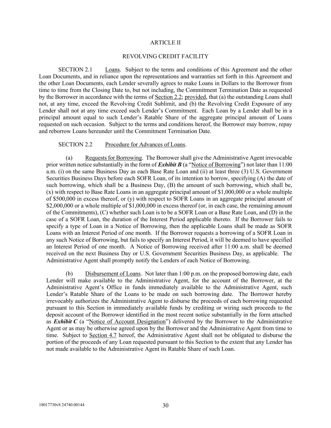 18017730v8 24740.00144 30 ARTICLE II REVOLVING CREDIT FACILITY SECTION 2.1 Loans. Subject to the terms and conditions of this Agreement and the other Loan Documents, and in reliance upon the representations and warranties set forth in this Agreement and the other Loan Documents, each Lender severally agrees to make Loans in Dollars to the Borrower from time to time from the Closing Date to, but not including, the Commitment Termination Date as requested by the Borrower in accordance with the terms of Section 2.2; provided, that (a) the outstanding Loans shall not, at any time, exceed the Revolving Credit Sublimit, and (b) the Revolving Credit Exposure of any Lender shall not at any time exceed such Lender’s Commitment. Each Loan by a Lender shall be in a principal amount equal to such Lender’s Ratable Share of the aggregate principal amount of Loans requested on such occasion. Subject to the terms and conditions hereof, the Borrower may borrow, repay and reborrow Loans hereunder until the Commitment Termination Date. SECTION 2.2 Procedure for Advances of Loans. (a) Requests for Borrowing. The Borrower shall give the Administrative Agent irrevocable prior written notice substantially in the form of Exhibit B (a “Notice of Borrowing”) not later than 11:00 a.m. (i) on the same Business Day as each Base Rate Loan and (ii) at least three (3) U.S. Government Securities Business Days before each SOFR Loan, of its intention to borrow, specifying (A) the date of such borrowing, which shall be a Business Day, (B) the amount of such borrowing, which shall be, (x) with respect to Base Rate Loans in an aggregate principal amount of $1,000,000 or a whole multiple of $500,000 in excess thereof, or (y) with respect to SOFR Loans in an aggregate principal amount of $2,000,000 or a whole multiple of $1,000,000 in excess thereof (or, in each case, the remaining amount of the Commitments), (C) whether such Loan is to be a SOFR Loan or a Base Rate Loan, and (D) in the case of a SOFR Loan, the duration of the Interest Period applicable thereto. If the Borrower fails to specify a type of Loan in a Notice of Borrowing, then the applicable Loans shall be made as SOFR Loans with an Interest Period of one month. If the Borrower requests a borrowing of a SOFR Loan in any such Notice of Borrowing, but fails to specify an Interest Period, it will be deemed to have specified an Interest Period of one month. A Notice of Borrowing received after 11:00 a.m. shall be deemed received on the next Business Day or U.S. Government Securities Business Day, as applicable. The Administrative Agent shall promptly notify the Lenders of each Notice of Borrowing. (b) Disbursement of Loans. Not later than 1:00 p.m. on the proposed borrowing date, each Lender will make available to the Administrative Agent, for the account of the Borrower, at the Administrative Agent’s Office in funds immediately available to the Administrative Agent, such Lender’s Ratable Share of the Loans to be made on such borrowing date. The Borrower hereby irrevocably authorizes the Administrative Agent to disburse the proceeds of each borrowing requested pursuant to this Section in immediately available funds by crediting or wiring such proceeds to the deposit account of the Borrower identified in the most recent notice substantially in the form attached as Exhibit C (a “Notice of Account Designation”) delivered by the Borrower to the Administrative Agent or as may be otherwise agreed upon by the Borrower and the Administrative Agent from time to time. Subject to Section 4.7 hereof, the Administrative Agent shall not be obligated to disburse the portion of the proceeds of any Loan requested pursuant to this Section to the extent that any Lender has not made available to the Administrative Agent its Ratable Share of such Loan.