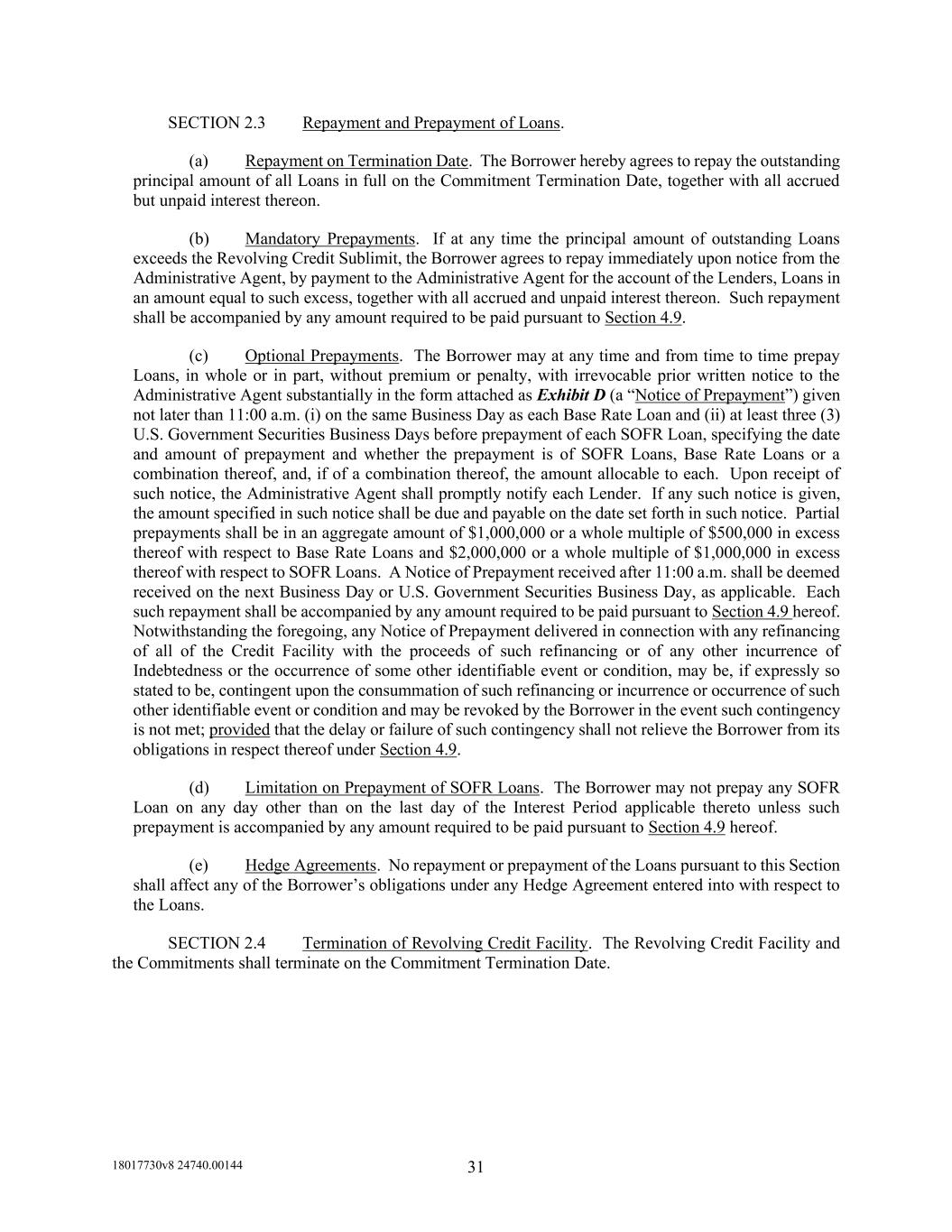 18017730v8 24740.00144 31 SECTION 2.3 Repayment and Prepayment of Loans. (a) Repayment on Termination Date. The Borrower hereby agrees to repay the outstanding principal amount of all Loans in full on the Commitment Termination Date, together with all accrued but unpaid interest thereon. (b) Mandatory Prepayments. If at any time the principal amount of outstanding Loans exceeds the Revolving Credit Sublimit, the Borrower agrees to repay immediately upon notice from the Administrative Agent, by payment to the Administrative Agent for the account of the Lenders, Loans in an amount equal to such excess, together with all accrued and unpaid interest thereon. Such repayment shall be accompanied by any amount required to be paid pursuant to Section 4.9. (c) Optional Prepayments. The Borrower may at any time and from time to time prepay Loans, in whole or in part, without premium or penalty, with irrevocable prior written notice to the Administrative Agent substantially in the form attached as Exhibit D (a “Notice of Prepayment”) given not later than 11:00 a.m. (i) on the same Business Day as each Base Rate Loan and (ii) at least three (3) U.S. Government Securities Business Days before prepayment of each SOFR Loan, specifying the date and amount of prepayment and whether the prepayment is of SOFR Loans, Base Rate Loans or a combination thereof, and, if of a combination thereof, the amount allocable to each. Upon receipt of such notice, the Administrative Agent shall promptly notify each Lender. If any such notice is given, the amount specified in such notice shall be due and payable on the date set forth in such notice. Partial prepayments shall be in an aggregate amount of $1,000,000 or a whole multiple of $500,000 in excess thereof with respect to Base Rate Loans and $2,000,000 or a whole multiple of $1,000,000 in excess thereof with respect to SOFR Loans. A Notice of Prepayment received after 11:00 a.m. shall be deemed received on the next Business Day or U.S. Government Securities Business Day, as applicable. Each such repayment shall be accompanied by any amount required to be paid pursuant to Section 4.9 hereof. Notwithstanding the foregoing, any Notice of Prepayment delivered in connection with any refinancing of all of the Credit Facility with the proceeds of such refinancing or of any other incurrence of Indebtedness or the occurrence of some other identifiable event or condition, may be, if expressly so stated to be, contingent upon the consummation of such refinancing or incurrence or occurrence of such other identifiable event or condition and may be revoked by the Borrower in the event such contingency is not met; provided that the delay or failure of such contingency shall not relieve the Borrower from its obligations in respect thereof under Section 4.9. (d) Limitation on Prepayment of SOFR Loans. The Borrower may not prepay any SOFR Loan on any day other than on the last day of the Interest Period applicable thereto unless such prepayment is accompanied by any amount required to be paid pursuant to Section 4.9 hereof. (e) Hedge Agreements. No repayment or prepayment of the Loans pursuant to this Section shall affect any of the Borrower’s obligations under any Hedge Agreement entered into with respect to the Loans. SECTION 2.4 Termination of Revolving Credit Facility. The Revolving Credit Facility and the Commitments shall terminate on the Commitment Termination Date.