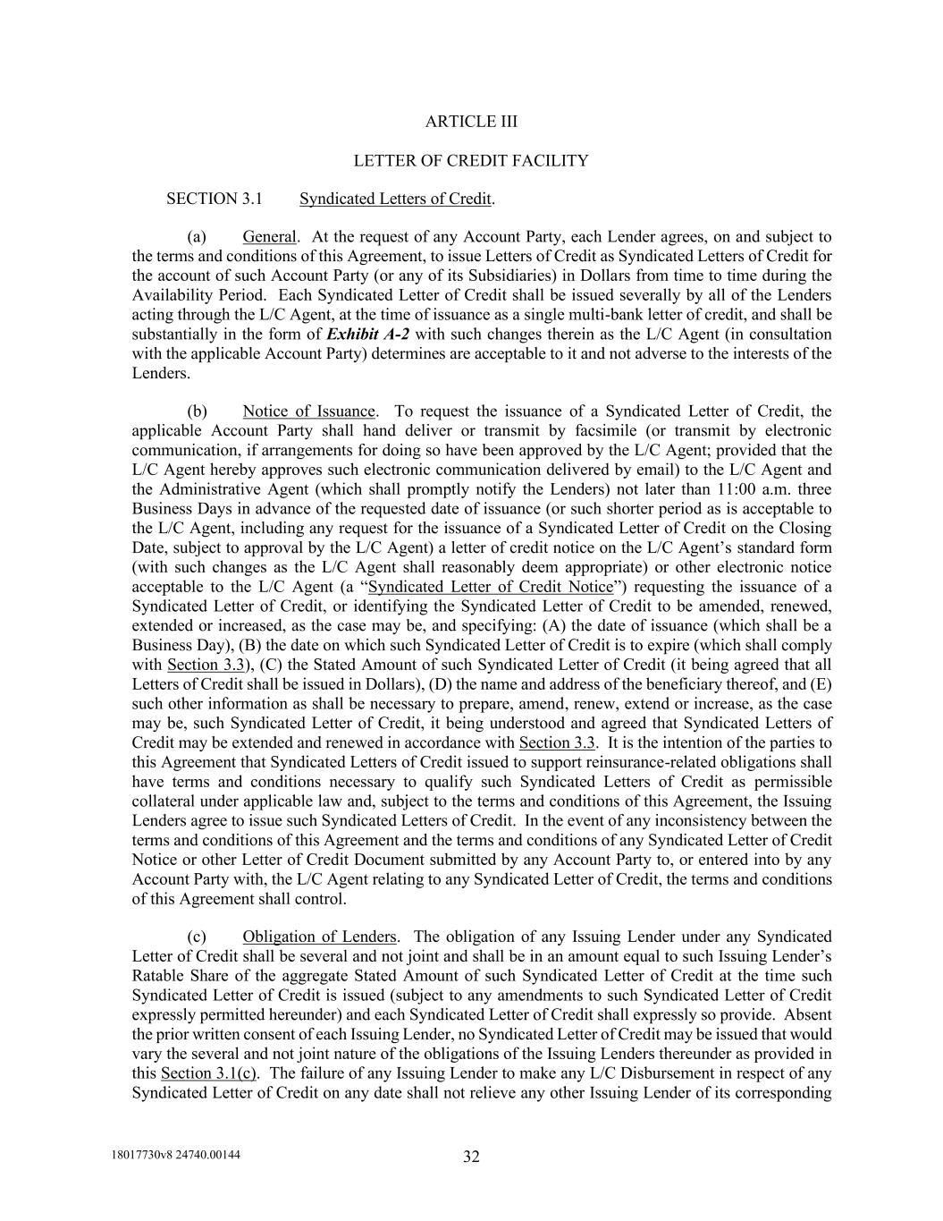 18017730v8 24740.00144 32 ARTICLE III LETTER OF CREDIT FACILITY SECTION 3.1 Syndicated Letters of Credit. (a) General. At the request of any Account Party, each Lender agrees, on and subject to the terms and conditions of this Agreement, to issue Letters of Credit as Syndicated Letters of Credit for the account of such Account Party (or any of its Subsidiaries) in Dollars from time to time during the Availability Period. Each Syndicated Letter of Credit shall be issued severally by all of the Lenders acting through the L/C Agent, at the time of issuance as a single multi-bank letter of credit, and shall be substantially in the form of Exhibit A-2 with such changes therein as the L/C Agent (in consultation with the applicable Account Party) determines are acceptable to it and not adverse to the interests of the Lenders. (b) Notice of Issuance. To request the issuance of a Syndicated Letter of Credit, the applicable Account Party shall hand deliver or transmit by facsimile (or transmit by electronic communication, if arrangements for doing so have been approved by the L/C Agent; provided that the L/C Agent hereby approves such electronic communication delivered by email) to the L/C Agent and the Administrative Agent (which shall promptly notify the Lenders) not later than 11:00 a.m. three Business Days in advance of the requested date of issuance (or such shorter period as is acceptable to the L/C Agent, including any request for the issuance of a Syndicated Letter of Credit on the Closing Date, subject to approval by the L/C Agent) a letter of credit notice on the L/C Agent’s standard form (with such changes as the L/C Agent shall reasonably deem appropriate) or other electronic notice acceptable to the L/C Agent (a “Syndicated Letter of Credit Notice”) requesting the issuance of a Syndicated Letter of Credit, or identifying the Syndicated Letter of Credit to be amended, renewed, extended or increased, as the case may be, and specifying: (A) the date of issuance (which shall be a Business Day), (B) the date on which such Syndicated Letter of Credit is to expire (which shall comply with Section 3.3), (C) the Stated Amount of such Syndicated Letter of Credit (it being agreed that all Letters of Credit shall be issued in Dollars), (D) the name and address of the beneficiary thereof, and (E) such other information as shall be necessary to prepare, amend, renew, extend or increase, as the case may be, such Syndicated Letter of Credit, it being understood and agreed that Syndicated Letters of Credit may be extended and renewed in accordance with Section 3.3. It is the intention of the parties to this Agreement that Syndicated Letters of Credit issued to support reinsurance-related obligations shall have terms and conditions necessary to qualify such Syndicated Letters of Credit as permissible collateral under applicable law and, subject to the terms and conditions of this Agreement, the Issuing Lenders agree to issue such Syndicated Letters of Credit. In the event of any inconsistency between the terms and conditions of this Agreement and the terms and conditions of any Syndicated Letter of Credit Notice or other Letter of Credit Document submitted by any Account Party to, or entered into by any Account Party with, the L/C Agent relating to any Syndicated Letter of Credit, the terms and conditions of this Agreement shall control. (c) Obligation of Lenders. The obligation of any Issuing Lender under any Syndicated Letter of Credit shall be several and not joint and shall be in an amount equal to such Issuing Lender’s Ratable Share of the aggregate Stated Amount of such Syndicated Letter of Credit at the time such Syndicated Letter of Credit is issued (subject to any amendments to such Syndicated Letter of Credit expressly permitted hereunder) and each Syndicated Letter of Credit shall expressly so provide. Absent the prior written consent of each Issuing Lender, no Syndicated Letter of Credit may be issued that would vary the several and not joint nature of the obligations of the Issuing Lenders thereunder as provided in this Section 3.1(c). The failure of any Issuing Lender to make any L/C Disbursement in respect of any Syndicated Letter of Credit on any date shall not relieve any other Issuing Lender of its corresponding
