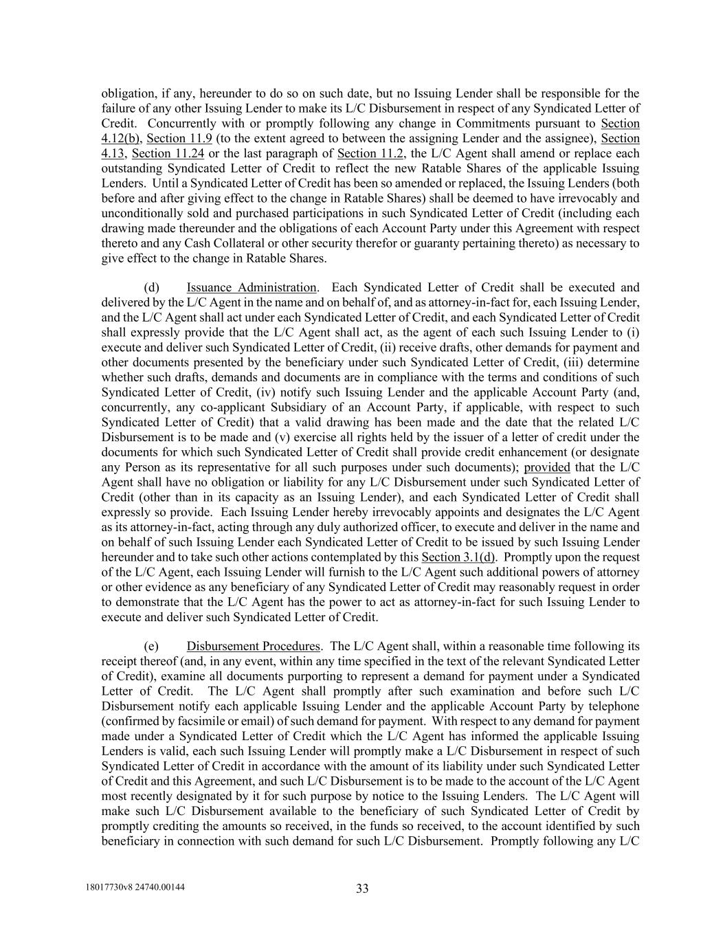 18017730v8 24740.00144 33 obligation, if any, hereunder to do so on such date, but no Issuing Lender shall be responsible for the failure of any other Issuing Lender to make its L/C Disbursement in respect of any Syndicated Letter of Credit. Concurrently with or promptly following any change in Commitments pursuant to Section 4.12(b), Section 11.9 (to the extent agreed to between the assigning Lender and the assignee), Section 4.13, Section 11.24 or the last paragraph of Section 11.2, the L/C Agent shall amend or replace each outstanding Syndicated Letter of Credit to reflect the new Ratable Shares of the applicable Issuing Lenders. Until a Syndicated Letter of Credit has been so amended or replaced, the Issuing Lenders (both before and after giving effect to the change in Ratable Shares) shall be deemed to have irrevocably and unconditionally sold and purchased participations in such Syndicated Letter of Credit (including each drawing made thereunder and the obligations of each Account Party under this Agreement with respect thereto and any Cash Collateral or other security therefor or guaranty pertaining thereto) as necessary to give effect to the change in Ratable Shares. (d) Issuance Administration. Each Syndicated Letter of Credit shall be executed and delivered by the L/C Agent in the name and on behalf of, and as attorney-in-fact for, each Issuing Lender, and the L/C Agent shall act under each Syndicated Letter of Credit, and each Syndicated Letter of Credit shall expressly provide that the L/C Agent shall act, as the agent of each such Issuing Lender to (i) execute and deliver such Syndicated Letter of Credit, (ii) receive drafts, other demands for payment and other documents presented by the beneficiary under such Syndicated Letter of Credit, (iii) determine whether such drafts, demands and documents are in compliance with the terms and conditions of such Syndicated Letter of Credit, (iv) notify such Issuing Lender and the applicable Account Party (and, concurrently, any co-applicant Subsidiary of an Account Party, if applicable, with respect to such Syndicated Letter of Credit) that a valid drawing has been made and the date that the related L/C Disbursement is to be made and (v) exercise all rights held by the issuer of a letter of credit under the documents for which such Syndicated Letter of Credit shall provide credit enhancement (or designate any Person as its representative for all such purposes under such documents); provided that the L/C Agent shall have no obligation or liability for any L/C Disbursement under such Syndicated Letter of Credit (other than in its capacity as an Issuing Lender), and each Syndicated Letter of Credit shall expressly so provide. Each Issuing Lender hereby irrevocably appoints and designates the L/C Agent as its attorney-in-fact, acting through any duly authorized officer, to execute and deliver in the name and on behalf of such Issuing Lender each Syndicated Letter of Credit to be issued by such Issuing Lender hereunder and to take such other actions contemplated by this Section 3.1(d). Promptly upon the request of the L/C Agent, each Issuing Lender will furnish to the L/C Agent such additional powers of attorney or other evidence as any beneficiary of any Syndicated Letter of Credit may reasonably request in order to demonstrate that the L/C Agent has the power to act as attorney-in-fact for such Issuing Lender to execute and deliver such Syndicated Letter of Credit. (e) Disbursement Procedures. The L/C Agent shall, within a reasonable time following its receipt thereof (and, in any event, within any time specified in the text of the relevant Syndicated Letter of Credit), examine all documents purporting to represent a demand for payment under a Syndicated Letter of Credit. The L/C Agent shall promptly after such examination and before such L/C Disbursement notify each applicable Issuing Lender and the applicable Account Party by telephone (confirmed by facsimile or email) of such demand for payment. With respect to any demand for payment made under a Syndicated Letter of Credit which the L/C Agent has informed the applicable Issuing Lenders is valid, each such Issuing Lender will promptly make a L/C Disbursement in respect of such Syndicated Letter of Credit in accordance with the amount of its liability under such Syndicated Letter of Credit and this Agreement, and such L/C Disbursement is to be made to the account of the L/C Agent most recently designated by it for such purpose by notice to the Issuing Lenders. The L/C Agent will make such L/C Disbursement available to the beneficiary of such Syndicated Letter of Credit by promptly crediting the amounts so received, in the funds so received, to the account identified by such beneficiary in connection with such demand for such L/C Disbursement. Promptly following any L/C