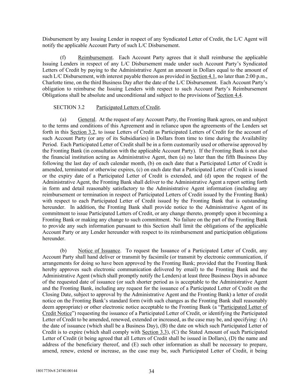 18017730v8 24740.00144 34 Disbursement by any Issuing Lender in respect of any Syndicated Letter of Credit, the L/C Agent will notify the applicable Account Party of such L/C Disbursement. (f) Reimbursement. Each Account Party agrees that it shall reimburse the applicable Issuing Lenders in respect of any L/C Disbursement made under such Account Party’s Syndicated Letters of Credit by paying to the Administrative Agent an amount in Dollars equal to the amount of such L/C Disbursement, with interest payable thereon as provided in Section 4.1, no later than 2:00 p.m., Charlotte time, on the third Business Day after the date of the L/C Disbursement. Each Account Party’s obligation to reimburse the Issuing Lenders with respect to such Account Party’s Reimbursement Obligations shall be absolute and unconditional and subject to the provisions of Section 4.4. SECTION 3.2 Participated Letters of Credit. (a) General. At the request of any Account Party, the Fronting Bank agrees, on and subject to the terms and conditions of this Agreement and in reliance upon the agreements of the Lenders set forth in this Section 3.2, to issue Letters of Credit as Participated Letters of Credit for the account of such Account Party (or any of its Subsidiaries) in Dollars from time to time during the Availability Period. Each Participated Letter of Credit shall be in a form customarily used or otherwise approved by the Fronting Bank (in consultation with the applicable Account Party). If the Fronting Bank is not also the financial institution acting as Administrative Agent, then (a) no later than the fifth Business Day following the last day of each calendar month, (b) on each date that a Participated Letter of Credit is amended, terminated or otherwise expires, (c) on each date that a Participated Letter of Credit is issued or the expiry date of a Participated Letter of Credit is extended, and (d) upon the request of the Administrative Agent, the Fronting Bank shall deliver to the Administrative Agent a report setting forth in form and detail reasonably satisfactory to the Administrative Agent information (including any reimbursement or termination in respect of Participated Letters of Credit issued by the Fronting Bank) with respect to each Participated Letter of Credit issued by the Fronting Bank that is outstanding hereunder. In addition, the Fronting Bank shall provide notice to the Administrative Agent of its commitment to issue Participated Letters of Credit, or any change thereto, promptly upon it becoming a Fronting Bank or making any change to such commitment. No failure on the part of the Fronting Bank to provide any such information pursuant to this Section shall limit the obligations of the applicable Account Party or any Lender hereunder with respect to its reimbursement and participation obligations hereunder. (b) Notice of Issuance. To request the Issuance of a Participated Letter of Credit, any Account Party shall hand deliver or transmit by facsimile (or transmit by electronic communication, if arrangements for doing so have been approved by the Fronting Bank; provided that the Fronting Bank hereby approves such electronic communication delivered by email) to the Fronting Bank and the Administrative Agent (which shall promptly notify the Lenders) at least three Business Days in advance of the requested date of issuance (or such shorter period as is acceptable to the Administrative Agent and the Fronting Bank, including any request for the issuance of a Participated Letter of Credit on the Closing Date, subject to approval by the Administrative Agent and the Fronting Bank) a letter of credit notice on the Fronting Bank’s standard form (with such changes as the Fronting Bank shall reasonably deem appropriate) or other electronic notice acceptable to the Fronting Bank (a “Participated Letter of Credit Notice”) requesting the issuance of a Participated Letter of Credit, or identifying the Participated Letter of Credit to be amended, renewed, extended or increased, as the case may be, and specifying: (A) the date of issuance (which shall be a Business Day), (B) the date on which such Participated Letter of Credit is to expire (which shall comply with Section 3.3), (C) the Stated Amount of such Participated Letter of Credit (it being agreed that all Letters of Credit shall be issued in Dollars), (D) the name and address of the beneficiary thereof, and (E) such other information as shall be necessary to prepare, amend, renew, extend or increase, as the case may be, such Participated Letter of Credit, it being