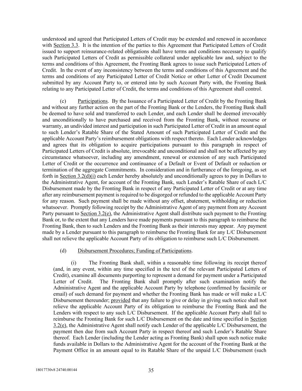 18017730v8 24740.00144 35 understood and agreed that Participated Letters of Credit may be extended and renewed in accordance with Section 3.3. It is the intention of the parties to this Agreement that Participated Letters of Credit issued to support reinsurance-related obligations shall have terms and conditions necessary to qualify such Participated Letters of Credit as permissible collateral under applicable law and, subject to the terms and conditions of this Agreement, the Fronting Bank agrees to issue such Participated Letters of Credit. In the event of any inconsistency between the terms and conditions of this Agreement and the terms and conditions of any Participated Letter of Credit Notice or other Letter of Credit Document submitted by any Account Party to, or entered into by such Account Party with, the Fronting Bank relating to any Participated Letter of Credit, the terms and conditions of this Agreement shall control. (c) Participations. By the Issuance of a Participated Letter of Credit by the Fronting Bank and without any further action on the part of the Fronting Bank or the Lenders, the Fronting Bank shall be deemed to have sold and transferred to each Lender, and each Lender shall be deemed irrevocably and unconditionally to have purchased and received from the Fronting Bank, without recourse or warranty, an undivided interest and participation in such Participated Letter of Credit in an amount equal to such Lender’s Ratable Share of the Stated Amount of such Participated Letter of Credit and the applicable Account Party’s reimbursement obligations with respect thereto. Each Lender acknowledges and agrees that its obligation to acquire participations pursuant to this paragraph in respect of Participated Letters of Credit is absolute, irrevocable and unconditional and shall not be affected by any circumstance whatsoever, including any amendment, renewal or extension of any such Participated Letter of Credit or the occurrence and continuance of a Default or Event of Default or reduction or termination of the aggregate Commitments. In consideration and in furtherance of the foregoing, as set forth in Section 3.2(d)(i) each Lender hereby absolutely and unconditionally agrees to pay in Dollars to the Administrative Agent, for account of the Fronting Bank, such Lender’s Ratable Share of each L/C Disbursement made by the Fronting Bank in respect of any Participated Letter of Credit or at any time after any reimbursement payment is required to be disgorged or refunded to the applicable Account Party for any reason. Such payment shall be made without any offset, abatement, withholding or reduction whatsoever. Promptly following receipt by the Administrative Agent of any payment from any Account Party pursuant to Section 3.2(e), the Administrative Agent shall distribute such payment to the Fronting Bank or, to the extent that any Lenders have made payments pursuant to this paragraph to reimburse the Fronting Bank, then to such Lenders and the Fronting Bank as their interests may appear. Any payment made by a Lender pursuant to this paragraph to reimburse the Fronting Bank for any L/C Disbursement shall not relieve the applicable Account Party of its obligation to reimburse such L/C Disbursement. (d) Disbursement Procedures; Funding of Participations. (i) The Fronting Bank shall, within a reasonable time following its receipt thereof (and, in any event, within any time specified in the text of the relevant Participated Letters of Credit), examine all documents purporting to represent a demand for payment under a Participated Letter of Credit. The Fronting Bank shall promptly after such examination notify the Administrative Agent and the applicable Account Party by telephone (confirmed by facsimile or email) of such demand for payment and whether the Fronting Bank has made or will make a L/C Disbursement thereunder; provided that any failure to give or delay in giving such notice shall not relieve the applicable Account Party of its obligation to reimburse the Fronting Bank and the Lenders with respect to any such L/C Disbursement. If the applicable Account Party shall fail to reimburse the Fronting Bank for such L/C Disbursement on the date and time specified in Section 3.2(e), the Administrative Agent shall notify each Lender of the applicable L/C Disbursement, the payment then due from such Account Party in respect thereof and such Lender’s Ratable Share thereof. Each Lender (including the Lender acting as Fronting Bank) shall upon such notice make funds available in Dollars to the Administrative Agent for the account of the Fronting Bank at the Payment Office in an amount equal to its Ratable Share of the unpaid L/C Disbursement (such