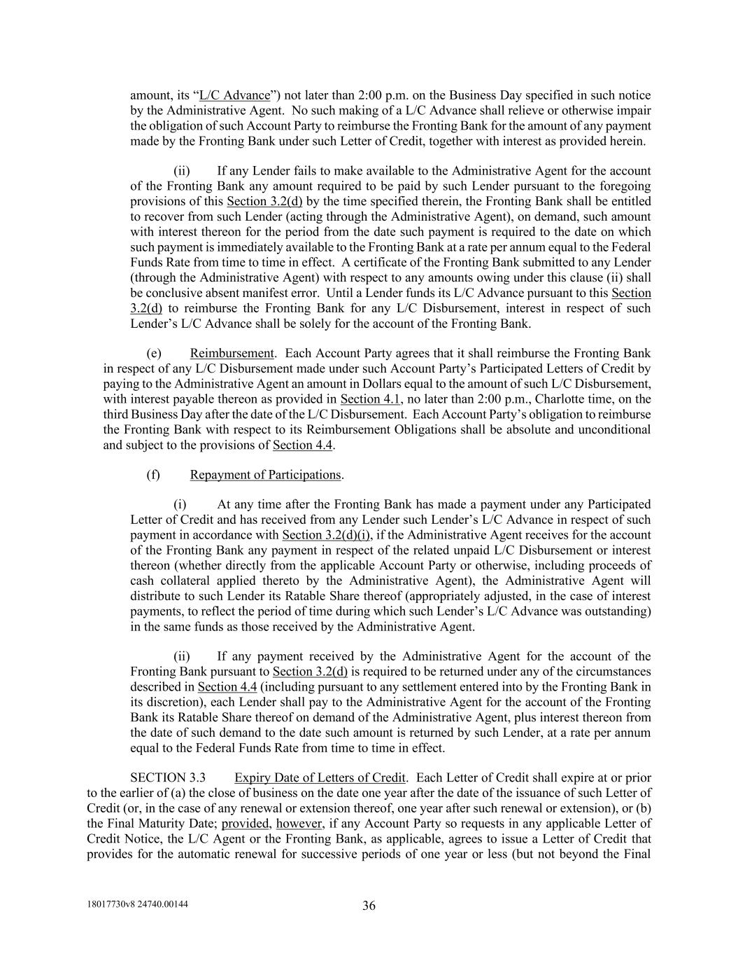 18017730v8 24740.00144 36 amount, its “L/C Advance”) not later than 2:00 p.m. on the Business Day specified in such notice by the Administrative Agent. No such making of a L/C Advance shall relieve or otherwise impair the obligation of such Account Party to reimburse the Fronting Bank for the amount of any payment made by the Fronting Bank under such Letter of Credit, together with interest as provided herein. (ii) If any Lender fails to make available to the Administrative Agent for the account of the Fronting Bank any amount required to be paid by such Lender pursuant to the foregoing provisions of this Section 3.2(d) by the time specified therein, the Fronting Bank shall be entitled to recover from such Lender (acting through the Administrative Agent), on demand, such amount with interest thereon for the period from the date such payment is required to the date on which such payment is immediately available to the Fronting Bank at a rate per annum equal to the Federal Funds Rate from time to time in effect. A certificate of the Fronting Bank submitted to any Lender (through the Administrative Agent) with respect to any amounts owing under this clause (ii) shall be conclusive absent manifest error. Until a Lender funds its L/C Advance pursuant to this Section 3.2(d) to reimburse the Fronting Bank for any L/C Disbursement, interest in respect of such Lender’s L/C Advance shall be solely for the account of the Fronting Bank. (e) Reimbursement. Each Account Party agrees that it shall reimburse the Fronting Bank in respect of any L/C Disbursement made under such Account Party’s Participated Letters of Credit by paying to the Administrative Agent an amount in Dollars equal to the amount of such L/C Disbursement, with interest payable thereon as provided in Section 4.1, no later than 2:00 p.m., Charlotte time, on the third Business Day after the date of the L/C Disbursement. Each Account Party’s obligation to reimburse the Fronting Bank with respect to its Reimbursement Obligations shall be absolute and unconditional and subject to the provisions of Section 4.4. (f) Repayment of Participations. (i) At any time after the Fronting Bank has made a payment under any Participated Letter of Credit and has received from any Lender such Lender’s L/C Advance in respect of such payment in accordance with Section 3.2(d)(i), if the Administrative Agent receives for the account of the Fronting Bank any payment in respect of the related unpaid L/C Disbursement or interest thereon (whether directly from the applicable Account Party or otherwise, including proceeds of cash collateral applied thereto by the Administrative Agent), the Administrative Agent will distribute to such Lender its Ratable Share thereof (appropriately adjusted, in the case of interest payments, to reflect the period of time during which such Lender’s L/C Advance was outstanding) in the same funds as those received by the Administrative Agent. (ii) If any payment received by the Administrative Agent for the account of the Fronting Bank pursuant to Section 3.2(d) is required to be returned under any of the circumstances described in Section 4.4 (including pursuant to any settlement entered into by the Fronting Bank in its discretion), each Lender shall pay to the Administrative Agent for the account of the Fronting Bank its Ratable Share thereof on demand of the Administrative Agent, plus interest thereon from the date of such demand to the date such amount is returned by such Lender, at a rate per annum equal to the Federal Funds Rate from time to time in effect. SECTION 3.3 Expiry Date of Letters of Credit. Each Letter of Credit shall expire at or prior to the earlier of (a) the close of business on the date one year after the date of the issuance of such Letter of Credit (or, in the case of any renewal or extension thereof, one year after such renewal or extension), or (b) the Final Maturity Date; provided, however, if any Account Party so requests in any applicable Letter of Credit Notice, the L/C Agent or the Fronting Bank, as applicable, agrees to issue a Letter of Credit that provides for the automatic renewal for successive periods of one year or less (but not beyond the Final