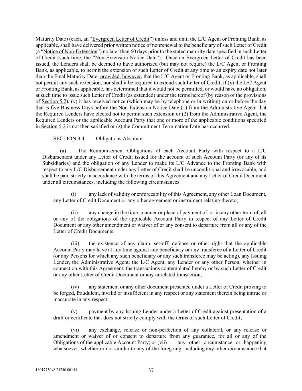 18017730v8 24740.00144 37 Maturity Date) (each, an “Evergreen Letter of Credit”) unless and until the L/C Agent or Fronting Bank, as applicable, shall have delivered prior written notice of nonrenewal to the beneficiary of such Letter of Credit (a “Notice of Non-Extension”) no later than 60 days prior to the stated maturity date specified in such Letter of Credit (such time, the “Non-Extension Notice Date”). Once an Evergreen Letter of Credit has been issued, the Lenders shall be deemed to have authorized (but may not require) the L/C Agent or Fronting Bank, as applicable, to permit the extension of such Letter of Credit at any time to an expiry date not later than the Final Maturity Date; provided, however, that the L/C Agent or Fronting Bank, as applicable, shall not permit any such extension, nor shall it be required to extend such Letter of Credit, if (x) the L/C Agent or Fronting Bank, as applicable, has determined that it would not be permitted, or would have no obligation, at such time to issue such Letter of Credit (as extended) under the terms hereof (by reason of the provisions of Section 5.2), (y) it has received notice (which may be by telephone or in writing) on or before the day that is five Business Days before the Non-Extension Notice Date (1) from the Administrative Agent that the Required Lenders have elected not to permit such extension or (2) from the Administrative Agent, the Required Lenders or the applicable Account Party that one or more of the applicable conditions specified in Section 5.2 is not then satisfied or (z) the Commitment Termination Date has occurred. SECTION 3.4 Obligations Absolute. (a) The Reimbursement Obligations of each Account Party with respect to a L/C Disbursement under any Letter of Credit issued for the account of such Account Party (or any of its Subsidiaries) and the obligation of any Lender to make its L/C Advance to the Fronting Bank with respect to any L/C Disbursement under any Letter of Credit shall be unconditional and irrevocable, and shall be paid strictly in accordance with the terms of this Agreement and any Letter of Credit Document under all circumstances, including the following circumstances: (i) any lack of validity or enforceability of this Agreement, any other Loan Document, any Letter of Credit Document or any other agreement or instrument relating thereto; (ii) any change in the time, manner or place of payment of, or in any other term of, all or any of the obligations of the applicable Account Party in respect of any Letter of Credit Document or any other amendment or waiver of or any consent to departure from all or any of the Letter of Credit Documents; (iii) the existence of any claim, set-off, defense or other right that the applicable Account Party may have at any time against any beneficiary or any transferee of a Letter of Credit (or any Persons for which any such beneficiary or any such transferee may be acting), any Issuing Lender, the Administrative Agent, the L/C Agent, any Lender or any other Person, whether in connection with this Agreement, the transactions contemplated hereby or by such Letter of Credit or any other Letter of Credit Document or any unrelated transaction; (iv) any statement or any other document presented under a Letter of Credit proving to be forged, fraudulent, invalid or insufficient in any respect or any statement therein being untrue or inaccurate in any respect; (v) payment by any Issuing Lender under a Letter of Credit against presentation of a draft or certificate that does not strictly comply with the terms of such Letter of Credit; (vi) any exchange, release or non-perfection of any collateral, or any release or amendment or waiver of or consent to departure from any guarantee, for all or any of the Obligations of the applicable Account Party; or (vii) any other circumstance or happening whatsoever, whether or not similar to any of the foregoing, including any other circumstance that