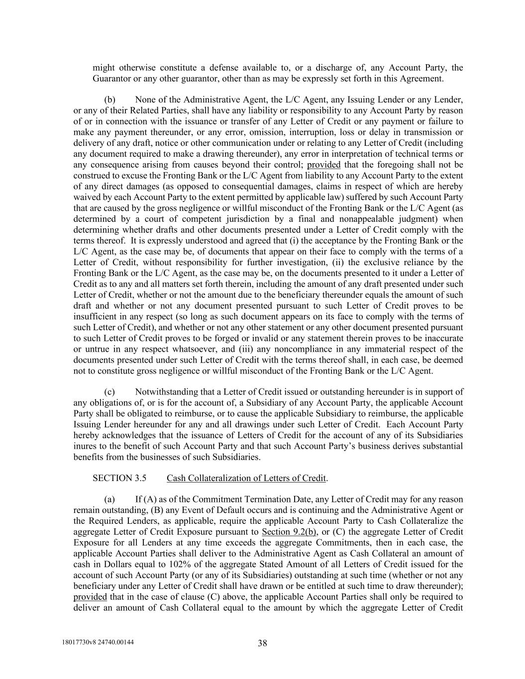 18017730v8 24740.00144 38 might otherwise constitute a defense available to, or a discharge of, any Account Party, the Guarantor or any other guarantor, other than as may be expressly set forth in this Agreement. (b) None of the Administrative Agent, the L/C Agent, any Issuing Lender or any Lender, or any of their Related Parties, shall have any liability or responsibility to any Account Party by reason of or in connection with the issuance or transfer of any Letter of Credit or any payment or failure to make any payment thereunder, or any error, omission, interruption, loss or delay in transmission or delivery of any draft, notice or other communication under or relating to any Letter of Credit (including any document required to make a drawing thereunder), any error in interpretation of technical terms or any consequence arising from causes beyond their control; provided that the foregoing shall not be construed to excuse the Fronting Bank or the L/C Agent from liability to any Account Party to the extent of any direct damages (as opposed to consequential damages, claims in respect of which are hereby waived by each Account Party to the extent permitted by applicable law) suffered by such Account Party that are caused by the gross negligence or willful misconduct of the Fronting Bank or the L/C Agent (as determined by a court of competent jurisdiction by a final and nonappealable judgment) when determining whether drafts and other documents presented under a Letter of Credit comply with the terms thereof. It is expressly understood and agreed that (i) the acceptance by the Fronting Bank or the L/C Agent, as the case may be, of documents that appear on their face to comply with the terms of a Letter of Credit, without responsibility for further investigation, (ii) the exclusive reliance by the Fronting Bank or the L/C Agent, as the case may be, on the documents presented to it under a Letter of Credit as to any and all matters set forth therein, including the amount of any draft presented under such Letter of Credit, whether or not the amount due to the beneficiary thereunder equals the amount of such draft and whether or not any document presented pursuant to such Letter of Credit proves to be insufficient in any respect (so long as such document appears on its face to comply with the terms of such Letter of Credit), and whether or not any other statement or any other document presented pursuant to such Letter of Credit proves to be forged or invalid or any statement therein proves to be inaccurate or untrue in any respect whatsoever, and (iii) any noncompliance in any immaterial respect of the documents presented under such Letter of Credit with the terms thereof shall, in each case, be deemed not to constitute gross negligence or willful misconduct of the Fronting Bank or the L/C Agent. (c) Notwithstanding that a Letter of Credit issued or outstanding hereunder is in support of any obligations of, or is for the account of, a Subsidiary of any Account Party, the applicable Account Party shall be obligated to reimburse, or to cause the applicable Subsidiary to reimburse, the applicable Issuing Lender hereunder for any and all drawings under such Letter of Credit. Each Account Party hereby acknowledges that the issuance of Letters of Credit for the account of any of its Subsidiaries inures to the benefit of such Account Party and that such Account Party’s business derives substantial benefits from the businesses of such Subsidiaries. SECTION 3.5 Cash Collateralization of Letters of Credit. (a) If (A) as of the Commitment Termination Date, any Letter of Credit may for any reason remain outstanding, (B) any Event of Default occurs and is continuing and the Administrative Agent or the Required Lenders, as applicable, require the applicable Account Party to Cash Collateralize the aggregate Letter of Credit Exposure pursuant to Section 9.2(b), or (C) the aggregate Letter of Credit Exposure for all Lenders at any time exceeds the aggregate Commitments, then in each case, the applicable Account Parties shall deliver to the Administrative Agent as Cash Collateral an amount of cash in Dollars equal to 102% of the aggregate Stated Amount of all Letters of Credit issued for the account of such Account Party (or any of its Subsidiaries) outstanding at such time (whether or not any beneficiary under any Letter of Credit shall have drawn or be entitled at such time to draw thereunder); provided that in the case of clause (C) above, the applicable Account Parties shall only be required to deliver an amount of Cash Collateral equal to the amount by which the aggregate Letter of Credit