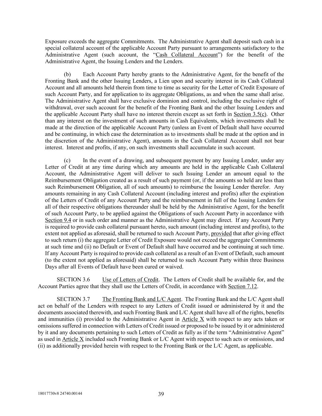 18017730v8 24740.00144 39 Exposure exceeds the aggregate Commitments. The Administrative Agent shall deposit such cash in a special collateral account of the applicable Account Party pursuant to arrangements satisfactory to the Administrative Agent (such account, the “Cash Collateral Account”) for the benefit of the Administrative Agent, the Issuing Lenders and the Lenders. (b) Each Account Party hereby grants to the Administrative Agent, for the benefit of the Fronting Bank and the other Issuing Lenders, a Lien upon and security interest in its Cash Collateral Account and all amounts held therein from time to time as security for the Letter of Credit Exposure of such Account Party, and for application to its aggregate Obligations, as and when the same shall arise. The Administrative Agent shall have exclusive dominion and control, including the exclusive right of withdrawal, over such account for the benefit of the Fronting Bank and the other Issuing Lenders and the applicable Account Party shall have no interest therein except as set forth in Section 3.5(c). Other than any interest on the investment of such amounts in Cash Equivalents, which investments shall be made at the direction of the applicable Account Party (unless an Event of Default shall have occurred and be continuing, in which case the determination as to investments shall be made at the option and in the discretion of the Administrative Agent), amounts in the Cash Collateral Account shall not bear interest. Interest and profits, if any, on such investments shall accumulate in such account. (c) In the event of a drawing, and subsequent payment by any Issuing Lender, under any Letter of Credit at any time during which any amounts are held in the applicable Cash Collateral Account, the Administrative Agent will deliver to such Issuing Lender an amount equal to the Reimbursement Obligation created as a result of such payment (or, if the amounts so held are less than such Reimbursement Obligation, all of such amounts) to reimburse the Issuing Lender therefor. Any amounts remaining in any Cash Collateral Account (including interest and profits) after the expiration of the Letters of Credit of any Account Party and the reimbursement in full of the Issuing Lenders for all of their respective obligations thereunder shall be held by the Administrative Agent, for the benefit of such Account Party, to be applied against the Obligations of such Account Party in accordance with Section 9.4 or in such order and manner as the Administrative Agent may direct. If any Account Party is required to provide cash collateral pursuant hereto, such amount (including interest and profits), to the extent not applied as aforesaid, shall be returned to such Account Party, provided that after giving effect to such return (i) the aggregate Letter of Credit Exposure would not exceed the aggregate Commitments at such time and (ii) no Default or Event of Default shall have occurred and be continuing at such time. If any Account Party is required to provide cash collateral as a result of an Event of Default, such amount (to the extent not applied as aforesaid) shall be returned to such Account Party within three Business Days after all Events of Default have been cured or waived. SECTION 3.6 Use of Letters of Credit. The Letters of Credit shall be available for, and the Account Parties agree that they shall use the Letters of Credit, in accordance with Section 7.12. SECTION 3.7 The Fronting Bank and L/C Agent. The Fronting Bank and the L/C Agent shall act on behalf of the Lenders with respect to any Letters of Credit issued or administered by it and the documents associated therewith, and such Fronting Bank and L/C Agent shall have all of the rights, benefits and immunities (i) provided to the Administrative Agent in Article X with respect to any acts taken or omissions suffered in connection with Letters of Credit issued or proposed to be issued by it or administered by it and any documents pertaining to such Letters of Credit as fully as if the term “Administrative Agent” as used in Article X included such Fronting Bank or L/C Agent with respect to such acts or omissions, and (ii) as additionally provided herein with respect to the Fronting Bank or the L/C Agent, as applicable.