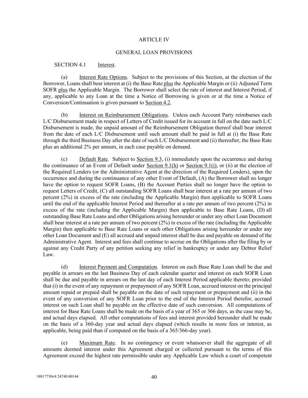 18017730v8 24740.00144 40 ARTICLE IV GENERAL LOAN PROVISIONS SECTION 4.1 Interest. (a) Interest Rate Options. Subject to the provisions of this Section, at the election of the Borrower, Loans shall bear interest at (i) the Base Rate plus the Applicable Margin or (ii) Adjusted Term SOFR plus the Applicable Margin. The Borrower shall select the rate of interest and Interest Period, if any, applicable to any Loan at the time a Notice of Borrowing is given or at the time a Notice of Conversion/Continuation is given pursuant to Section 4.2. (b) Interest on Reimbursement Obligations. Unless each Account Party reimburses each L/C Disbursement made in respect of Letters of Credit issued for its account in full on the date such L/C Disbursement is made, the unpaid amount of the Reimbursement Obligation thereof shall bear interest from the date of each L/C Disbursement until such amount shall be paid in full at (i) the Base Rate through the third Business Day after the date of such L/C Disbursement and (ii) thereafter, the Base Rate plus an additional 2% per annum, in each case payable on demand. (c) Default Rate. Subject to Section 9.3, (i) immediately upon the occurrence and during the continuance of an Event of Default under Section 9.1(h) or Section 9.1(i), or (ii) at the election of the Required Lenders (or the Administrative Agent at the direction of the Required Lenders), upon the occurrence and during the continuance of any other Event of Default, (A) the Borrower shall no longer have the option to request SOFR Loans, (B) the Account Parties shall no longer have the option to request Letters of Credit, (C) all outstanding SOFR Loans shall bear interest at a rate per annum of two percent (2%) in excess of the rate (including the Applicable Margin) then applicable to SOFR Loans until the end of the applicable Interest Period and thereafter at a rate per annum of two percent (2%) in excess of the rate (including the Applicable Margin) then applicable to Base Rate Loans, (D) all outstanding Base Rate Loans and other Obligations arising hereunder or under any other Loan Document shall bear interest at a rate per annum of two percent (2%) in excess of the rate (including the Applicable Margin) then applicable to Base Rate Loans or such other Obligations arising hereunder or under any other Loan Document and (E) all accrued and unpaid interest shall be due and payable on demand of the Administrative Agent. Interest and fees shall continue to accrue on the Obligations after the filing by or against any Credit Party of any petition seeking any relief in bankruptcy or under any Debtor Relief Law. (d) Interest Payment and Computation. Interest on each Base Rate Loan shall be due and payable in arrears on the last Business Day of each calendar quarter and interest on each SOFR Loan shall be due and payable in arrears on the last day of each Interest Period applicable thereto; provided that (i) in the event of any repayment or prepayment of any SOFR Loan, accrued interest on the principal amount repaid or prepaid shall be payable on the date of such repayment or prepayment and (ii) in the event of any conversion of any SOFR Loan prior to the end of the Interest Period therefor, accrued interest on such Loan shall be payable on the effective date of such conversion. All computations of interest for Base Rate Loans shall be made on the basis of a year of 365 or 366 days, as the case may be, and actual days elapsed. All other computations of fees and interest provided hereunder shall be made on the basis of a 360-day year and actual days elapsed (which results in more fees or interest, as applicable, being paid than if computed on the basis of a 365/366-day year). (e) Maximum Rate. In no contingency or event whatsoever shall the aggregate of all amounts deemed interest under this Agreement charged or collected pursuant to the terms of this Agreement exceed the highest rate permissible under any Applicable Law which a court of competent