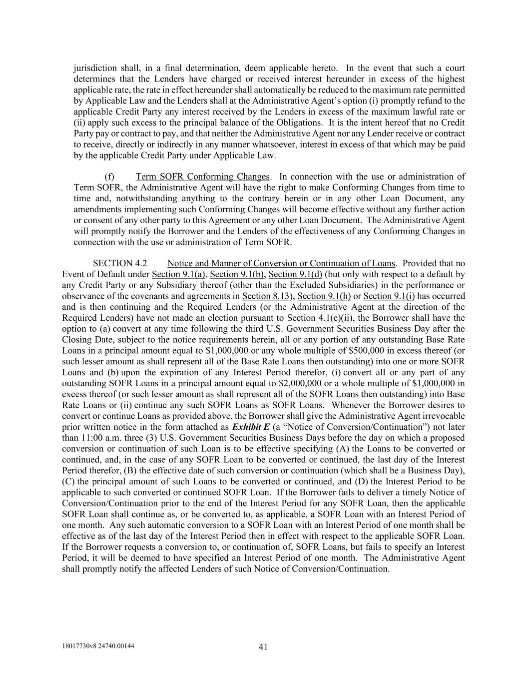 18017730v8 24740.00144 41 jurisdiction shall, in a final determination, deem applicable hereto. In the event that such a court determines that the Lenders have charged or received interest hereunder in excess of the highest applicable rate, the rate in effect hereunder shall automatically be reduced to the maximum rate permitted by Applicable Law and the Lenders shall at the Administrative Agent’s option (i) promptly refund to the applicable Credit Party any interest received by the Lenders in excess of the maximum lawful rate or (ii) apply such excess to the principal balance of the Obligations. It is the intent hereof that no Credit Party pay or contract to pay, and that neither the Administrative Agent nor any Lender receive or contract to receive, directly or indirectly in any manner whatsoever, interest in excess of that which may be paid by the applicable Credit Party under Applicable Law. (f) Term SOFR Conforming Changes. In connection with the use or administration of Term SOFR, the Administrative Agent will have the right to make Conforming Changes from time to time and, notwithstanding anything to the contrary herein or in any other Loan Document, any amendments implementing such Conforming Changes will become effective without any further action or consent of any other party to this Agreement or any other Loan Document. The Administrative Agent will promptly notify the Borrower and the Lenders of the effectiveness of any Conforming Changes in connection with the use or administration of Term SOFR. SECTION 4.2 Notice and Manner of Conversion or Continuation of Loans. Provided that no Event of Default under Section 9.1(a), Section 9.1(b), Section 9.1(d) (but only with respect to a default by any Credit Party or any Subsidiary thereof (other than the Excluded Subsidiaries) in the performance or observance of the covenants and agreements in Section 8.13), Section 9.1(h) or Section 9.1(i) has occurred and is then continuing and the Required Lenders (or the Administrative Agent at the direction of the Required Lenders) have not made an election pursuant to Section 4.1(c)(ii), the Borrower shall have the option to (a) convert at any time following the third U.S. Government Securities Business Day after the Closing Date, subject to the notice requirements herein, all or any portion of any outstanding Base Rate Loans in a principal amount equal to $1,000,000 or any whole multiple of $500,000 in excess thereof (or such lesser amount as shall represent all of the Base Rate Loans then outstanding) into one or more SOFR Loans and (b) upon the expiration of any Interest Period therefor, (i) convert all or any part of any outstanding SOFR Loans in a principal amount equal to $2,000,000 or a whole multiple of $1,000,000 in excess thereof (or such lesser amount as shall represent all of the SOFR Loans then outstanding) into Base Rate Loans or (ii) continue any such SOFR Loans as SOFR Loans. Whenever the Borrower desires to convert or continue Loans as provided above, the Borrower shall give the Administrative Agent irrevocable prior written notice in the form attached as Exhibit E (a “Notice of Conversion/Continuation”) not later than 11:00 a.m. three (3) U.S. Government Securities Business Days before the day on which a proposed conversion or continuation of such Loan is to be effective specifying (A) the Loans to be converted or continued, and, in the case of any SOFR Loan to be converted or continued, the last day of the Interest Period therefor, (B) the effective date of such conversion or continuation (which shall be a Business Day), (C) the principal amount of such Loans to be converted or continued, and (D) the Interest Period to be applicable to such converted or continued SOFR Loan. If the Borrower fails to deliver a timely Notice of Conversion/Continuation prior to the end of the Interest Period for any SOFR Loan, then the applicable SOFR Loan shall continue as, or be converted to, as applicable, a SOFR Loan with an Interest Period of one month. Any such automatic conversion to a SOFR Loan with an Interest Period of one month shall be effective as of the last day of the Interest Period then in effect with respect to the applicable SOFR Loan. If the Borrower requests a conversion to, or continuation of, SOFR Loans, but fails to specify an Interest Period, it will be deemed to have specified an Interest Period of one month. The Administrative Agent shall promptly notify the affected Lenders of such Notice of Conversion/Continuation.