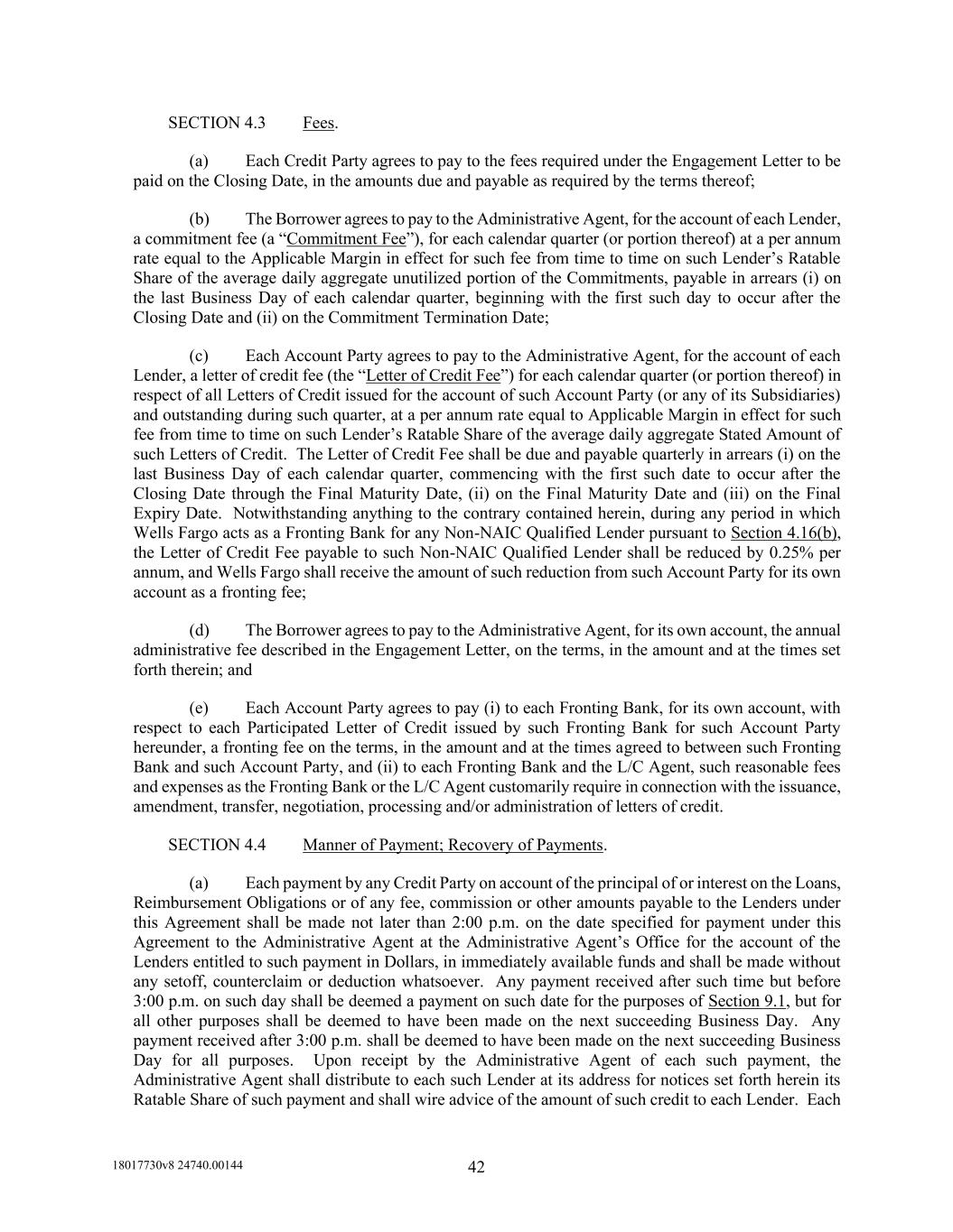 18017730v8 24740.00144 42 SECTION 4.3 Fees. (a) Each Credit Party agrees to pay to the fees required under the Engagement Letter to be paid on the Closing Date, in the amounts due and payable as required by the terms thereof; (b) The Borrower agrees to pay to the Administrative Agent, for the account of each Lender, a commitment fee (a “Commitment Fee”), for each calendar quarter (or portion thereof) at a per annum rate equal to the Applicable Margin in effect for such fee from time to time on such Lender’s Ratable Share of the average daily aggregate unutilized portion of the Commitments, payable in arrears (i) on the last Business Day of each calendar quarter, beginning with the first such day to occur after the Closing Date and (ii) on the Commitment Termination Date; (c) Each Account Party agrees to pay to the Administrative Agent, for the account of each Lender, a letter of credit fee (the “Letter of Credit Fee”) for each calendar quarter (or portion thereof) in respect of all Letters of Credit issued for the account of such Account Party (or any of its Subsidiaries) and outstanding during such quarter, at a per annum rate equal to Applicable Margin in effect for such fee from time to time on such Lender’s Ratable Share of the average daily aggregate Stated Amount of such Letters of Credit. The Letter of Credit Fee shall be due and payable quarterly in arrears (i) on the last Business Day of each calendar quarter, commencing with the first such date to occur after the Closing Date through the Final Maturity Date, (ii) on the Final Maturity Date and (iii) on the Final Expiry Date. Notwithstanding anything to the contrary contained herein, during any period in which Wells Fargo acts as a Fronting Bank for any Non-NAIC Qualified Lender pursuant to Section 4.16(b), the Letter of Credit Fee payable to such Non-NAIC Qualified Lender shall be reduced by 0.25% per annum, and Wells Fargo shall receive the amount of such reduction from such Account Party for its own account as a fronting fee; (d) The Borrower agrees to pay to the Administrative Agent, for its own account, the annual administrative fee described in the Engagement Letter, on the terms, in the amount and at the times set forth therein; and (e) Each Account Party agrees to pay (i) to each Fronting Bank, for its own account, with respect to each Participated Letter of Credit issued by such Fronting Bank for such Account Party hereunder, a fronting fee on the terms, in the amount and at the times agreed to between such Fronting Bank and such Account Party, and (ii) to each Fronting Bank and the L/C Agent, such reasonable fees and expenses as the Fronting Bank or the L/C Agent customarily require in connection with the issuance, amendment, transfer, negotiation, processing and/or administration of letters of credit. SECTION 4.4 Manner of Payment; Recovery of Payments. (a) Each payment by any Credit Party on account of the principal of or interest on the Loans, Reimbursement Obligations or of any fee, commission or other amounts payable to the Lenders under this Agreement shall be made not later than 2:00 p.m. on the date specified for payment under this Agreement to the Administrative Agent at the Administrative Agent’s Office for the account of the Lenders entitled to such payment in Dollars, in immediately available funds and shall be made without any setoff, counterclaim or deduction whatsoever. Any payment received after such time but before 3:00 p.m. on such day shall be deemed a payment on such date for the purposes of Section 9.1, but for all other purposes shall be deemed to have been made on the next succeeding Business Day. Any payment received after 3:00 p.m. shall be deemed to have been made on the next succeeding Business Day for all purposes. Upon receipt by the Administrative Agent of each such payment, the Administrative Agent shall distribute to each such Lender at its address for notices set forth herein its Ratable Share of such payment and shall wire advice of the amount of such credit to each Lender. Each