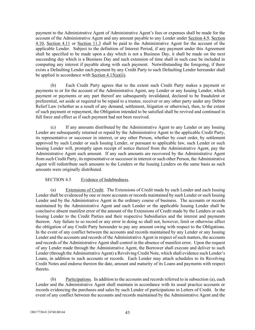 18017730v8 24740.00144 43 payment to the Administrative Agent of Administrative Agent’s fees or expenses shall be made for the account of the Administrative Agent and any amount payable to any Lender under Section 4.9, Section 4.10, Section 4.11 or Section 11.3 shall be paid to the Administrative Agent for the account of the applicable Lender. Subject to the definition of Interest Period, if any payment under this Agreement shall be specified to be made upon a day which is not a Business Day, it shall be made on the next succeeding day which is a Business Day and such extension of time shall in such case be included in computing any interest if payable along with such payment. Notwithstanding the foregoing, if there exists a Defaulting Lender each payment by any Credit Party to such Defaulting Lender hereunder shall be applied in accordance with Section 4.15(a)(ii). (b) Each Credit Party agrees that to the extent such Credit Party makes a payment or payments to or for the account of the Administrative Agent, any Lender or any Issuing Lender, which payment or payments or any part thereof are subsequently invalidated, declared to be fraudulent or preferential, set aside or required to be repaid to a trustee, receiver or any other party under any Debtor Relief Law (whether as a result of any demand, settlement, litigation or otherwise), then, to the extent of such payment or repayment, the Obligation intended to be satisfied shall be revived and continued in full force and effect as if such payment had not been received. (c) If any amounts distributed by the Administrative Agent to any Lender or any Issuing Lender are subsequently returned or repaid by the Administrative Agent to the applicable Credit Party, its representative or successor in interest, or any other Person, whether by court order, by settlement approved by such Lender or such Issuing Lender, or pursuant to applicable law, such Lender or such Issuing Lender will, promptly upon receipt of notice thereof from the Administrative Agent, pay the Administrative Agent such amount. If any such amounts are recovered by the Administrative Agent from such Credit Party, its representative or successor in interest or such other Person, the Administrative Agent will redistribute such amounts to the Lenders or the Issuing Lenders on the same basis as such amounts were originally distributed. SECTION 4.5 Evidence of Indebtedness. (a) Extensions of Credit. The Extensions of Credit made by each Lender and each Issuing Lender shall be evidenced by one or more accounts or records maintained by such Lender or such Issuing Lender and by the Administrative Agent in the ordinary course of business. The accounts or records maintained by the Administrative Agent and each Lender or the applicable Issuing Lender shall be conclusive absent manifest error of the amount of the Extensions of Credit made by the Lenders or such Issuing Lender to the Credit Parties and their respective Subsidiaries and the interest and payments thereon. Any failure to so record or any error in doing so shall not, however, limit or otherwise affect the obligation of any Credit Party hereunder to pay any amount owing with respect to the Obligations. In the event of any conflict between the accounts and records maintained by any Lender or any Issuing Lender and the accounts and records of the Administrative Agent in respect of such matters, the accounts and records of the Administrative Agent shall control in the absence of manifest error. Upon the request of any Lender made through the Administrative Agent, the Borrower shall execute and deliver to such Lender (through the Administrative Agent) a Revolving Credit Note, which shall evidence such Lender’s Loans, in addition to such accounts or records. Each Lender may attach schedules to its Revolving Credit Notes and endorse thereon the date, amount and maturity of its Loans and payments with respect thereto. (b) Participations. In addition to the accounts and records referred to in subsection (a), each Lender and the Administrative Agent shall maintain in accordance with its usual practice accounts or records evidencing the purchases and sales by such Lender of participations in Letters of Credit. In the event of any conflict between the accounts and records maintained by the Administrative Agent and the