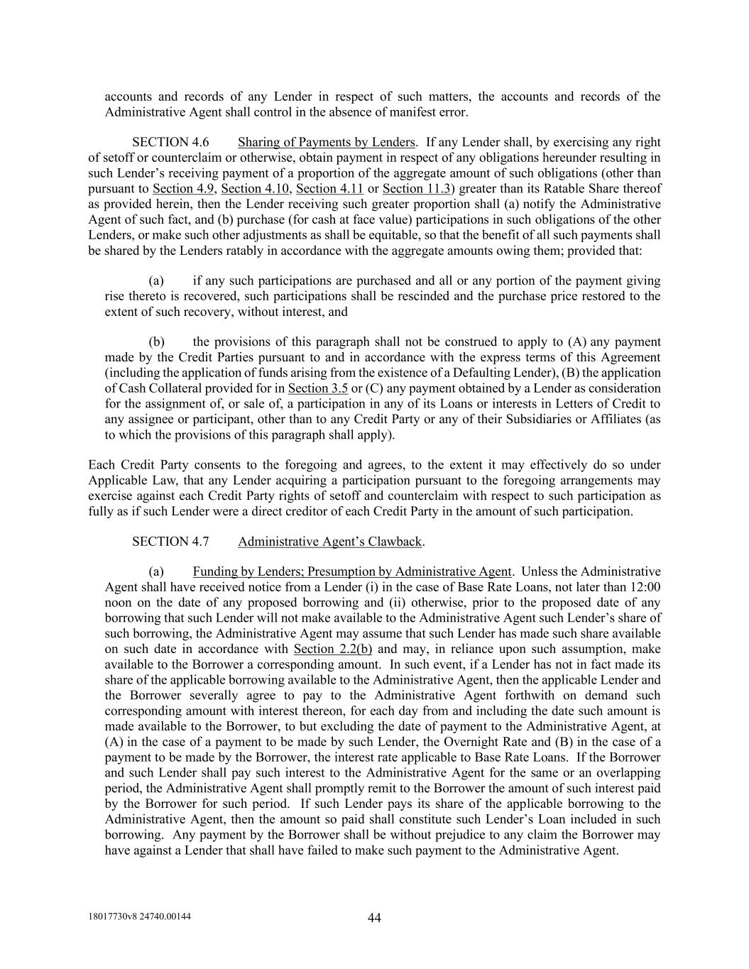 18017730v8 24740.00144 44 accounts and records of any Lender in respect of such matters, the accounts and records of the Administrative Agent shall control in the absence of manifest error. SECTION 4.6 Sharing of Payments by Lenders. If any Lender shall, by exercising any right of setoff or counterclaim or otherwise, obtain payment in respect of any obligations hereunder resulting in such Lender’s receiving payment of a proportion of the aggregate amount of such obligations (other than pursuant to Section 4.9, Section 4.10, Section 4.11 or Section 11.3) greater than its Ratable Share thereof as provided herein, then the Lender receiving such greater proportion shall (a) notify the Administrative Agent of such fact, and (b) purchase (for cash at face value) participations in such obligations of the other Lenders, or make such other adjustments as shall be equitable, so that the benefit of all such payments shall be shared by the Lenders ratably in accordance with the aggregate amounts owing them; provided that: (a) if any such participations are purchased and all or any portion of the payment giving rise thereto is recovered, such participations shall be rescinded and the purchase price restored to the extent of such recovery, without interest, and (b) the provisions of this paragraph shall not be construed to apply to (A) any payment made by the Credit Parties pursuant to and in accordance with the express terms of this Agreement (including the application of funds arising from the existence of a Defaulting Lender), (B) the application of Cash Collateral provided for in Section 3.5 or (C) any payment obtained by a Lender as consideration for the assignment of, or sale of, a participation in any of its Loans or interests in Letters of Credit to any assignee or participant, other than to any Credit Party or any of their Subsidiaries or Affiliates (as to which the provisions of this paragraph shall apply). Each Credit Party consents to the foregoing and agrees, to the extent it may effectively do so under Applicable Law, that any Lender acquiring a participation pursuant to the foregoing arrangements may exercise against each Credit Party rights of setoff and counterclaim with respect to such participation as fully as if such Lender were a direct creditor of each Credit Party in the amount of such participation. SECTION 4.7 Administrative Agent’s Clawback. (a) Funding by Lenders; Presumption by Administrative Agent. Unless the Administrative Agent shall have received notice from a Lender (i) in the case of Base Rate Loans, not later than 12:00 noon on the date of any proposed borrowing and (ii) otherwise, prior to the proposed date of any borrowing that such Lender will not make available to the Administrative Agent such Lender’s share of such borrowing, the Administrative Agent may assume that such Lender has made such share available on such date in accordance with Section 2.2(b) and may, in reliance upon such assumption, make available to the Borrower a corresponding amount. In such event, if a Lender has not in fact made its share of the applicable borrowing available to the Administrative Agent, then the applicable Lender and the Borrower severally agree to pay to the Administrative Agent forthwith on demand such corresponding amount with interest thereon, for each day from and including the date such amount is made available to the Borrower, to but excluding the date of payment to the Administrative Agent, at (A) in the case of a payment to be made by such Lender, the Overnight Rate and (B) in the case of a payment to be made by the Borrower, the interest rate applicable to Base Rate Loans. If the Borrower and such Lender shall pay such interest to the Administrative Agent for the same or an overlapping period, the Administrative Agent shall promptly remit to the Borrower the amount of such interest paid by the Borrower for such period. If such Lender pays its share of the applicable borrowing to the Administrative Agent, then the amount so paid shall constitute such Lender’s Loan included in such borrowing. Any payment by the Borrower shall be without prejudice to any claim the Borrower may have against a Lender that shall have failed to make such payment to the Administrative Agent.