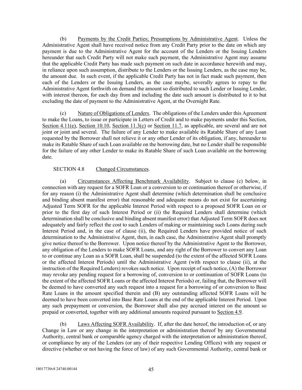 18017730v8 24740.00144 45 (b) Payments by the Credit Parties; Presumptions by Administrative Agent. Unless the Administrative Agent shall have received notice from any Credit Party prior to the date on which any payment is due to the Administrative Agent for the account of the Lenders or the Issuing Lenders hereunder that such Credit Party will not make such payment, the Administrative Agent may assume that the applicable Credit Party has made such payment on such date in accordance herewith and may, in reliance upon such assumption, distribute to the Lenders or the Issuing Lenders, as the case may be, the amount due. In such event, if the applicable Credit Party has not in fact made such payment, then each of the Lenders or the Issuing Lenders, as the case maybe, severally agrees to repay to the Administrative Agent forthwith on demand the amount so distributed to such Lender or Issuing Lender, with interest thereon, for each day from and including the date such amount is distributed to it to but excluding the date of payment to the Administrative Agent, at the Overnight Rate. (c) Nature of Obligations of Lenders. The obligations of the Lenders under this Agreement to make the Loans, to issue or participate in Letters of Credit and to make payments under this Section, Section 4.11(e), Section 10.10, Section 11.3(c) or Section 11.7, as applicable, are several and are not joint or joint and several. The failure of any Lender to make available its Ratable Share of any Loan requested by the Borrower shall not relieve it or any other Lender of its obligation, if any, hereunder to make its Ratable Share of such Loan available on the borrowing date, but no Lender shall be responsible for the failure of any other Lender to make its Ratable Share of such Loan available on the borrowing date. SECTION 4.8 Changed Circumstances. (a) Circumstances Affecting Benchmark Availability. Subject to clause (c) below, in connection with any request for a SOFR Loan or a conversion to or continuation thereof or otherwise, if for any reason (i) the Administrative Agent shall determine (which determination shall be conclusive and binding absent manifest error) that reasonable and adequate means do not exist for ascertaining Adjusted Term SOFR for the applicable Interest Period with respect to a proposed SOFR Loan on or prior to the first day of such Interest Period or (ii) the Required Lenders shall determine (which determination shall be conclusive and binding absent manifest error) that Adjusted Term SOFR does not adequately and fairly reflect the cost to such Lenders of making or maintaining such Loans during such Interest Period and, in the case of clause (ii), the Required Lenders have provided notice of such determination to the Administrative Agent, then, in each case, the Administrative Agent shall promptly give notice thereof to the Borrower. Upon notice thereof by the Administrative Agent to the Borrower, any obligation of the Lenders to make SOFR Loans, and any right of the Borrower to convert any Loan to or continue any Loan as a SOFR Loan, shall be suspended (to the extent of the affected SOFR Loans or the affected Interest Periods) until the Administrative Agent (with respect to clause (ii), at the instruction of the Required Lenders) revokes such notice. Upon receipt of such notice, (A) the Borrower may revoke any pending request for a borrowing of, conversion to or continuation of SOFR Loans (to the extent of the affected SOFR Loans or the affected Interest Periods) or, failing that, the Borrower will be deemed to have converted any such request into a request for a borrowing of or conversion to Base Rate Loans in the amount specified therein and (B) any outstanding affected SOFR Loans will be deemed to have been converted into Base Rate Loans at the end of the applicable Interest Period. Upon any such prepayment or conversion, the Borrower shall also pay accrued interest on the amount so prepaid or converted, together with any additional amounts required pursuant to Section 4.9. (b) Laws Affecting SOFR Availability. If, after the date hereof, the introduction of, or any Change in Law or any change in the interpretation or administration thereof by any Governmental Authority, central bank or comparable agency charged with the interpretation or administration thereof, or compliance by any of the Lenders (or any of their respective Lending Offices) with any request or directive (whether or not having the force of law) of any such Governmental Authority, central bank or