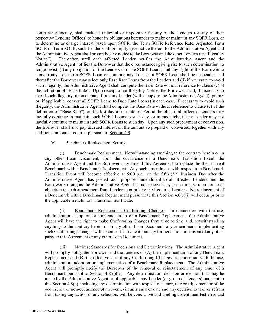 18017730v8 24740.00144 46 comparable agency, shall make it unlawful or impossible for any of the Lenders (or any of their respective Lending Offices) to honor its obligations hereunder to make or maintain any SOFR Loan, or to determine or charge interest based upon SOFR, the Term SOFR Reference Rate, Adjusted Term SOFR or Term SOFR, such Lender shall promptly give notice thereof to the Administrative Agent and the Administrative Agent shall promptly give notice to the Borrower and the other Lenders (an “Illegality Notice”). Thereafter, until each affected Lender notifies the Administrative Agent and the Administrative Agent notifies the Borrower that the circumstances giving rise to such determination no longer exist, (i) any obligation of the Lenders to make SOFR Loans, and any right of the Borrower to convert any Loan to a SOFR Loan or continue any Loan as a SOFR Loan shall be suspended and thereafter the Borrower may select only Base Rate Loans from the Lenders and (ii) if necessary to avoid such illegality, the Administrative Agent shall compute the Base Rate without reference to clause (c) of the definition of “Base Rate”. Upon receipt of an Illegality Notice, the Borrower shall, if necessary to avoid such illegality, upon demand from any Lender (with a copy to the Administrative Agent), prepay or, if applicable, convert all SOFR Loans to Base Rate Loans (in each case, if necessary to avoid such illegality, the Administrative Agent shall compute the Base Rate without reference to clause (c) of the definition of “Base Rate”), on the last day of the Interest Period therefor, if all affected Lenders may lawfully continue to maintain such SOFR Loans to such day, or immediately, if any Lender may not lawfully continue to maintain such SOFR Loans to such day. Upon any such prepayment or conversion, the Borrower shall also pay accrued interest on the amount so prepaid or converted, together with any additional amounts required pursuant to Section 4.9. (c) Benchmark Replacement Setting. (i) Benchmark Replacement. Notwithstanding anything to the contrary herein or in any other Loan Document, upon the occurrence of a Benchmark Transition Event, the Administrative Agent and the Borrower may amend this Agreement to replace the then-current Benchmark with a Benchmark Replacement. Any such amendment with respect to a Benchmark Transition Event will become effective at 5:00 p.m. on the fifth (5th) Business Day after the Administrative Agent has posted such proposed amendment to all affected Lenders and the Borrower so long as the Administrative Agent has not received, by such time, written notice of objection to such amendment from Lenders comprising the Required Lenders. No replacement of a Benchmark with a Benchmark Replacement pursuant to this Section 4.8(c)(i) will occur prior to the applicable Benchmark Transition Start Date. (ii) Benchmark Replacement Conforming Changes. In connection with the use, administration, adoption or implementation of a Benchmark Replacement, the Administrative Agent will have the right to make Conforming Changes from time to time and, notwithstanding anything to the contrary herein or in any other Loan Document, any amendments implementing such Conforming Changes will become effective without any further action or consent of any other party to this Agreement or any other Loan Document. (iii) Notices; Standards for Decisions and Determinations. The Administrative Agent will promptly notify the Borrower and the Lenders of (A) the implementation of any Benchmark Replacement and (B) the effectiveness of any Conforming Changes in connection with the use, administration, adoption or implementation of a Benchmark Replacement. The Administrative Agent will promptly notify the Borrower of the removal or reinstatement of any tenor of a Benchmark pursuant to Section 4.8(c)(iv). Any determination, decision or election that may be made by the Administrative Agent or, if applicable, any Lender (or group of Lenders) pursuant to this Section 4.8(c), including any determination with respect to a tenor, rate or adjustment or of the occurrence or non-occurrence of an event, circumstance or date and any decision to take or refrain from taking any action or any selection, will be conclusive and binding absent manifest error and