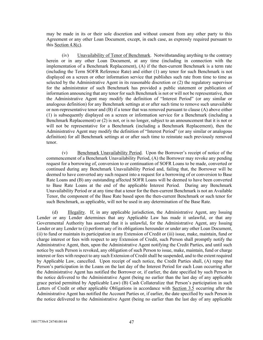 18017730v8 24740.00144 47 may be made in its or their sole discretion and without consent from any other party to this Agreement or any other Loan Document, except, in each case, as expressly required pursuant to this Section 4.8(c). (iv) Unavailability of Tenor of Benchmark. Notwithstanding anything to the contrary herein or in any other Loan Document, at any time (including in connection with the implementation of a Benchmark Replacement), (A) if the then-current Benchmark is a term rate (including the Term SOFR Reference Rate) and either (1) any tenor for such Benchmark is not displayed on a screen or other information service that publishes such rate from time to time as selected by the Administrative Agent in its reasonable discretion or (2) the regulatory supervisor for the administrator of such Benchmark has provided a public statement or publication of information announcing that any tenor for such Benchmark is not or will not be representative, then the Administrative Agent may modify the definition of “Interest Period” (or any similar or analogous definition) for any Benchmark settings at or after such time to remove such unavailable or non-representative tenor and (B) if a tenor that was removed pursuant to clause (A) above either (1) is subsequently displayed on a screen or information service for a Benchmark (including a Benchmark Replacement) or (2) is not, or is no longer, subject to an announcement that it is not or will not be representative for a Benchmark (including a Benchmark Replacement), then the Administrative Agent may modify the definition of “Interest Period” (or any similar or analogous definition) for all Benchmark settings at or after such time to reinstate such previously removed tenor. (v) Benchmark Unavailability Period. Upon the Borrower’s receipt of notice of the commencement of a Benchmark Unavailability Period, (A) the Borrower may revoke any pending request for a borrowing of, conversion to or continuation of SOFR Loans to be made, converted or continued during any Benchmark Unavailability Period and, failing that, the Borrower will be deemed to have converted any such request into a request for a borrowing of or conversion to Base Rate Loans and (B) any outstanding affected SOFR Loans will be deemed to have been converted to Base Rate Loans at the end of the applicable Interest Period. During any Benchmark Unavailability Period or at any time that a tenor for the then-current Benchmark is not an Available Tenor, the component of the Base Rate based upon the then-current Benchmark or such tenor for such Benchmark, as applicable, will not be used in any determination of the Base Rate. (d) Illegality. If, in any applicable jurisdiction, the Administrative Agent, any Issuing Lender or any Lender determines that any Applicable Law has made it unlawful, or that any Governmental Authority has asserted that it is unlawful, for the Administrative Agent, any Issuing Lender or any Lender to (i) perform any of its obligations hereunder or under any other Loan Document, (ii) to fund or maintain its participation in any Extension of Credit or (iii) issue, make, maintain, fund or charge interest or fees with respect to any Extension of Credit, such Person shall promptly notify the Administrative Agent, then, upon the Administrative Agent notifying the Credit Parties, and until such notice by such Person is revoked, any obligation of such Person to issue, make, maintain, fund or charge interest or fees with respect to any such Extension of Credit shall be suspended, and to the extent required by Applicable Law, cancelled. Upon receipt of such notice, the Credit Parties shall, (A) repay that Person’s participation in the Loans on the last day of the Interest Period for each Loan occurring after the Administrative Agent has notified the Borrower or, if earlier, the date specified by such Person in the notice delivered to the Administrative Agent (being no earlier than the last day of any applicable grace period permitted by Applicable Law) (B) Cash Collateralize that Person’s participation in such Letters of Credit or other applicable Obligations in accordance with Section 3.5 occurring after the Administrative Agent has notified the Account Parties or, if earlier, the date specified by such Person in the notice delivered to the Administrative Agent (being no earlier than the last day of any applicable
