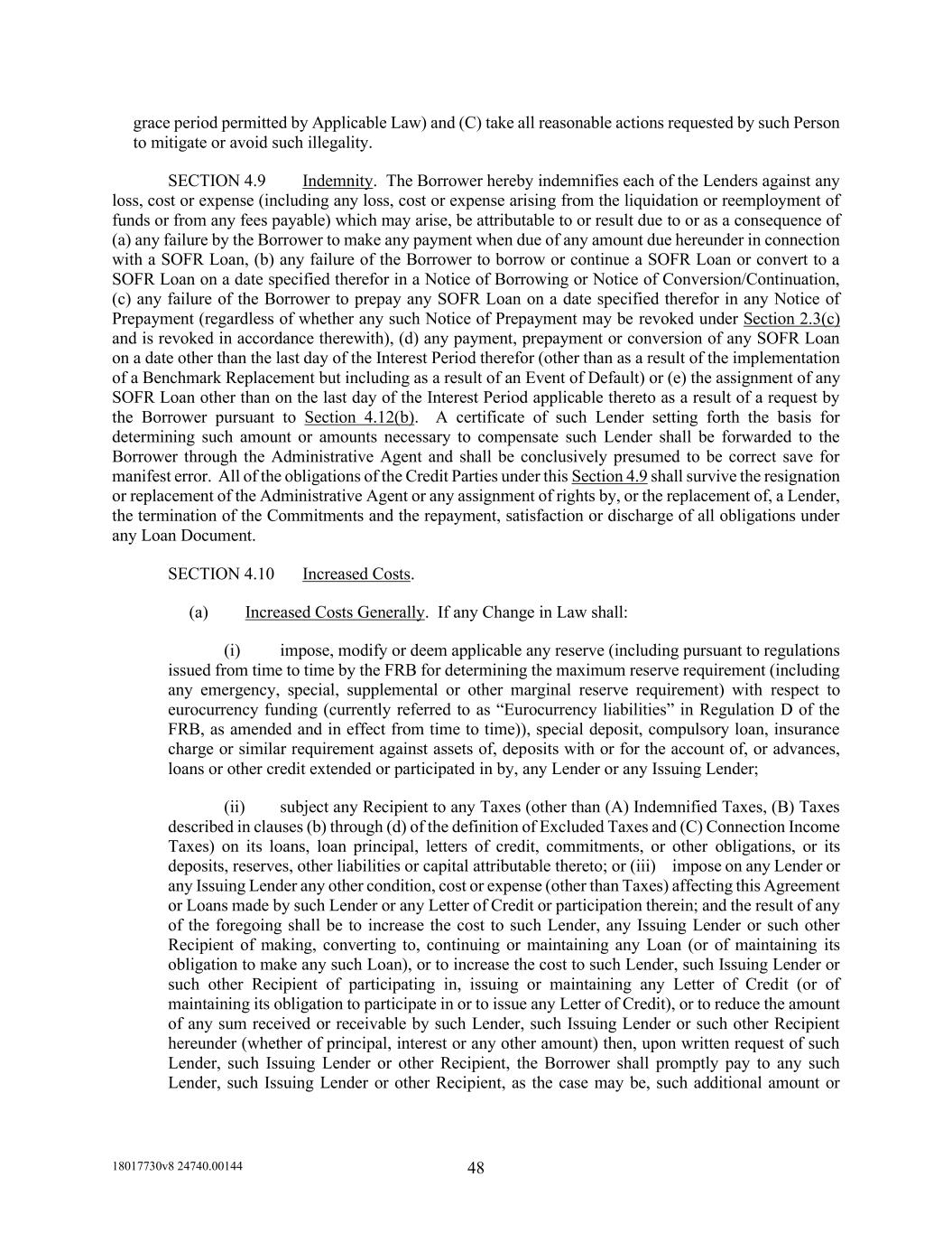 18017730v8 24740.00144 48 grace period permitted by Applicable Law) and (C) take all reasonable actions requested by such Person to mitigate or avoid such illegality. SECTION 4.9 Indemnity. The Borrower hereby indemnifies each of the Lenders against any loss, cost or expense (including any loss, cost or expense arising from the liquidation or reemployment of funds or from any fees payable) which may arise, be attributable to or result due to or as a consequence of (a) any failure by the Borrower to make any payment when due of any amount due hereunder in connection with a SOFR Loan, (b) any failure of the Borrower to borrow or continue a SOFR Loan or convert to a SOFR Loan on a date specified therefor in a Notice of Borrowing or Notice of Conversion/Continuation, (c) any failure of the Borrower to prepay any SOFR Loan on a date specified therefor in any Notice of Prepayment (regardless of whether any such Notice of Prepayment may be revoked under Section 2.3(c) and is revoked in accordance therewith), (d) any payment, prepayment or conversion of any SOFR Loan on a date other than the last day of the Interest Period therefor (other than as a result of the implementation of a Benchmark Replacement but including as a result of an Event of Default) or (e) the assignment of any SOFR Loan other than on the last day of the Interest Period applicable thereto as a result of a request by the Borrower pursuant to Section 4.12(b). A certificate of such Lender setting forth the basis for determining such amount or amounts necessary to compensate such Lender shall be forwarded to the Borrower through the Administrative Agent and shall be conclusively presumed to be correct save for manifest error. All of the obligations of the Credit Parties under this Section 4.9 shall survive the resignation or replacement of the Administrative Agent or any assignment of rights by, or the replacement of, a Lender, the termination of the Commitments and the repayment, satisfaction or discharge of all obligations under any Loan Document. SECTION 4.10 Increased Costs. (a) Increased Costs Generally. If any Change in Law shall: (i) impose, modify or deem applicable any reserve (including pursuant to regulations issued from time to time by the FRB for determining the maximum reserve requirement (including any emergency, special, supplemental or other marginal reserve requirement) with respect to eurocurrency funding (currently referred to as “Eurocurrency liabilities” in Regulation D of the FRB, as amended and in effect from time to time)), special deposit, compulsory loan, insurance charge or similar requirement against assets of, deposits with or for the account of, or advances, loans or other credit extended or participated in by, any Lender or any Issuing Lender; (ii) subject any Recipient to any Taxes (other than (A) Indemnified Taxes, (B) Taxes described in clauses (b) through (d) of the definition of Excluded Taxes and (C) Connection Income Taxes) on its loans, loan principal, letters of credit, commitments, or other obligations, or its deposits, reserves, other liabilities or capital attributable thereto; or (iii) impose on any Lender or any Issuing Lender any other condition, cost or expense (other than Taxes) affecting this Agreement or Loans made by such Lender or any Letter of Credit or participation therein; and the result of any of the foregoing shall be to increase the cost to such Lender, any Issuing Lender or such other Recipient of making, converting to, continuing or maintaining any Loan (or of maintaining its obligation to make any such Loan), or to increase the cost to such Lender, such Issuing Lender or such other Recipient of participating in, issuing or maintaining any Letter of Credit (or of maintaining its obligation to participate in or to issue any Letter of Credit), or to reduce the amount of any sum received or receivable by such Lender, such Issuing Lender or such other Recipient hereunder (whether of principal, interest or any other amount) then, upon written request of such Lender, such Issuing Lender or other Recipient, the Borrower shall promptly pay to any such Lender, such Issuing Lender or other Recipient, as the case may be, such additional amount or