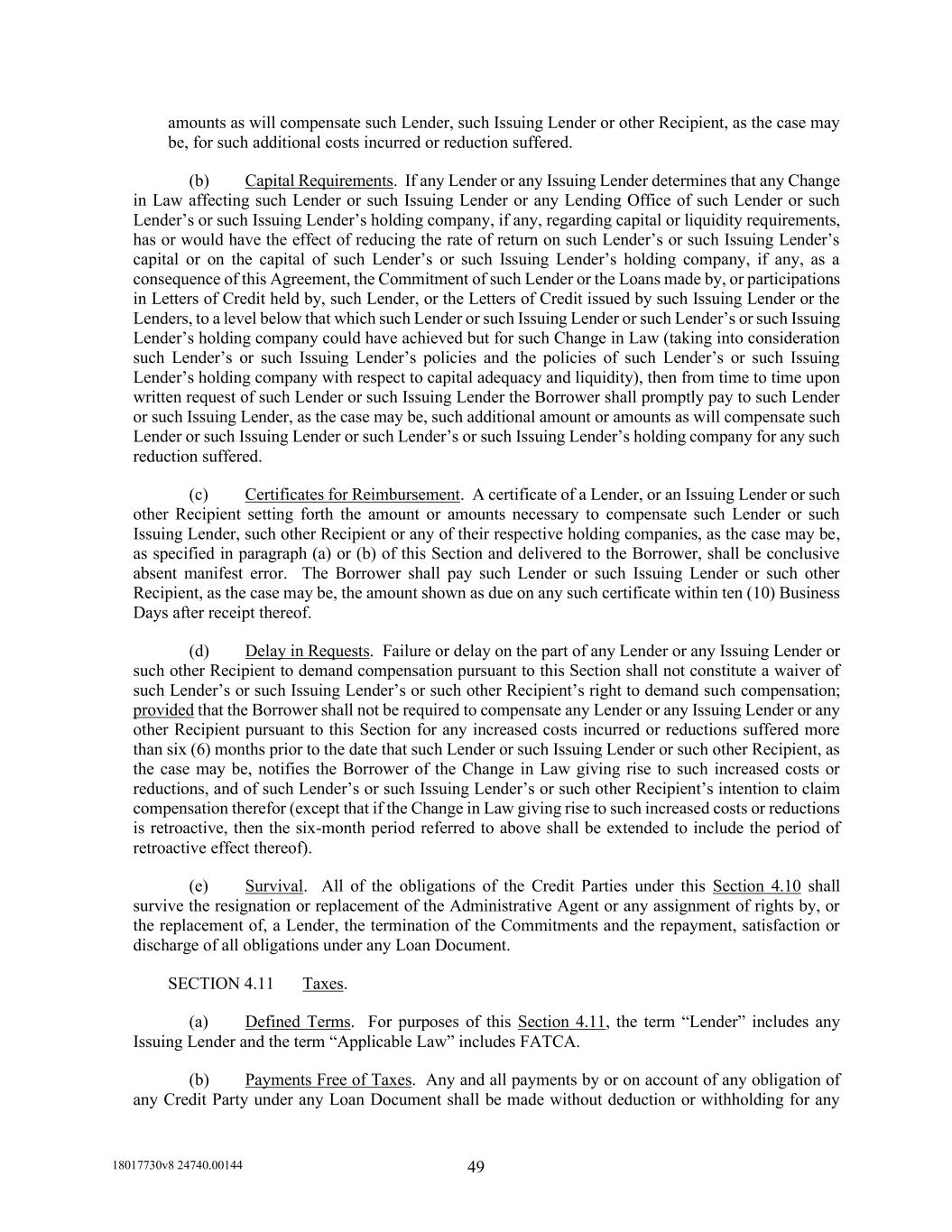 18017730v8 24740.00144 49 amounts as will compensate such Lender, such Issuing Lender or other Recipient, as the case may be, for such additional costs incurred or reduction suffered. (b) Capital Requirements. If any Lender or any Issuing Lender determines that any Change in Law affecting such Lender or such Issuing Lender or any Lending Office of such Lender or such Lender’s or such Issuing Lender’s holding company, if any, regarding capital or liquidity requirements, has or would have the effect of reducing the rate of return on such Lender’s or such Issuing Lender’s capital or on the capital of such Lender’s or such Issuing Lender’s holding company, if any, as a consequence of this Agreement, the Commitment of such Lender or the Loans made by, or participations in Letters of Credit held by, such Lender, or the Letters of Credit issued by such Issuing Lender or the Lenders, to a level below that which such Lender or such Issuing Lender or such Lender’s or such Issuing Lender’s holding company could have achieved but for such Change in Law (taking into consideration such Lender’s or such Issuing Lender’s policies and the policies of such Lender’s or such Issuing Lender’s holding company with respect to capital adequacy and liquidity), then from time to time upon written request of such Lender or such Issuing Lender the Borrower shall promptly pay to such Lender or such Issuing Lender, as the case may be, such additional amount or amounts as will compensate such Lender or such Issuing Lender or such Lender’s or such Issuing Lender’s holding company for any such reduction suffered. (c) Certificates for Reimbursement. A certificate of a Lender, or an Issuing Lender or such other Recipient setting forth the amount or amounts necessary to compensate such Lender or such Issuing Lender, such other Recipient or any of their respective holding companies, as the case may be, as specified in paragraph (a) or (b) of this Section and delivered to the Borrower, shall be conclusive absent manifest error. The Borrower shall pay such Lender or such Issuing Lender or such other Recipient, as the case may be, the amount shown as due on any such certificate within ten (10) Business Days after receipt thereof. (d) Delay in Requests. Failure or delay on the part of any Lender or any Issuing Lender or such other Recipient to demand compensation pursuant to this Section shall not constitute a waiver of such Lender’s or such Issuing Lender’s or such other Recipient’s right to demand such compensation; provided that the Borrower shall not be required to compensate any Lender or any Issuing Lender or any other Recipient pursuant to this Section for any increased costs incurred or reductions suffered more than six (6) months prior to the date that such Lender or such Issuing Lender or such other Recipient, as the case may be, notifies the Borrower of the Change in Law giving rise to such increased costs or reductions, and of such Lender’s or such Issuing Lender’s or such other Recipient’s intention to claim compensation therefor (except that if the Change in Law giving rise to such increased costs or reductions is retroactive, then the six-month period referred to above shall be extended to include the period of retroactive effect thereof). (e) Survival. All of the obligations of the Credit Parties under this Section 4.10 shall survive the resignation or replacement of the Administrative Agent or any assignment of rights by, or the replacement of, a Lender, the termination of the Commitments and the repayment, satisfaction or discharge of all obligations under any Loan Document. SECTION 4.11 Taxes. (a) Defined Terms. For purposes of this Section 4.11, the term “Lender” includes any Issuing Lender and the term “Applicable Law” includes FATCA. (b) Payments Free of Taxes. Any and all payments by or on account of any obligation of any Credit Party under any Loan Document shall be made without deduction or withholding for any