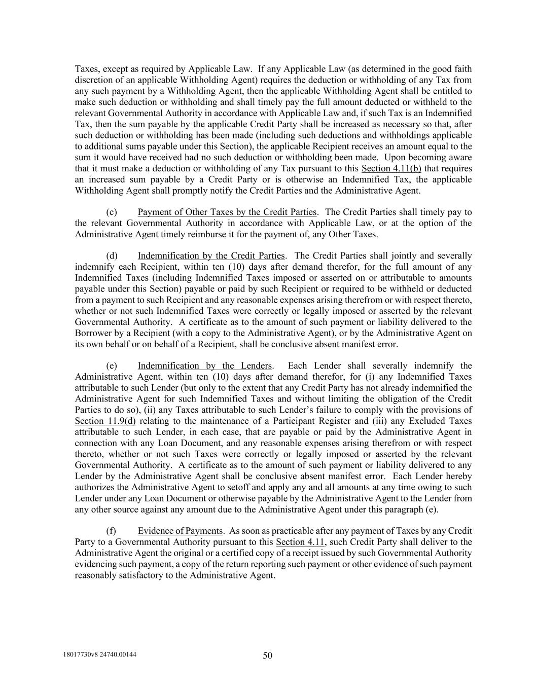 18017730v8 24740.00144 50 Taxes, except as required by Applicable Law. If any Applicable Law (as determined in the good faith discretion of an applicable Withholding Agent) requires the deduction or withholding of any Tax from any such payment by a Withholding Agent, then the applicable Withholding Agent shall be entitled to make such deduction or withholding and shall timely pay the full amount deducted or withheld to the relevant Governmental Authority in accordance with Applicable Law and, if such Tax is an Indemnified Tax, then the sum payable by the applicable Credit Party shall be increased as necessary so that, after such deduction or withholding has been made (including such deductions and withholdings applicable to additional sums payable under this Section), the applicable Recipient receives an amount equal to the sum it would have received had no such deduction or withholding been made. Upon becoming aware that it must make a deduction or withholding of any Tax pursuant to this Section 4.11(b) that requires an increased sum payable by a Credit Party or is otherwise an Indemnified Tax, the applicable Withholding Agent shall promptly notify the Credit Parties and the Administrative Agent. (c) Payment of Other Taxes by the Credit Parties. The Credit Parties shall timely pay to the relevant Governmental Authority in accordance with Applicable Law, or at the option of the Administrative Agent timely reimburse it for the payment of, any Other Taxes. (d) Indemnification by the Credit Parties. The Credit Parties shall jointly and severally indemnify each Recipient, within ten (10) days after demand therefor, for the full amount of any Indemnified Taxes (including Indemnified Taxes imposed or asserted on or attributable to amounts payable under this Section) payable or paid by such Recipient or required to be withheld or deducted from a payment to such Recipient and any reasonable expenses arising therefrom or with respect thereto, whether or not such Indemnified Taxes were correctly or legally imposed or asserted by the relevant Governmental Authority. A certificate as to the amount of such payment or liability delivered to the Borrower by a Recipient (with a copy to the Administrative Agent), or by the Administrative Agent on its own behalf or on behalf of a Recipient, shall be conclusive absent manifest error. (e) Indemnification by the Lenders. Each Lender shall severally indemnify the Administrative Agent, within ten (10) days after demand therefor, for (i) any Indemnified Taxes attributable to such Lender (but only to the extent that any Credit Party has not already indemnified the Administrative Agent for such Indemnified Taxes and without limiting the obligation of the Credit Parties to do so), (ii) any Taxes attributable to such Lender’s failure to comply with the provisions of Section 11.9(d) relating to the maintenance of a Participant Register and (iii) any Excluded Taxes attributable to such Lender, in each case, that are payable or paid by the Administrative Agent in connection with any Loan Document, and any reasonable expenses arising therefrom or with respect thereto, whether or not such Taxes were correctly or legally imposed or asserted by the relevant Governmental Authority. A certificate as to the amount of such payment or liability delivered to any Lender by the Administrative Agent shall be conclusive absent manifest error. Each Lender hereby authorizes the Administrative Agent to setoff and apply any and all amounts at any time owing to such Lender under any Loan Document or otherwise payable by the Administrative Agent to the Lender from any other source against any amount due to the Administrative Agent under this paragraph (e). (f) Evidence of Payments. As soon as practicable after any payment of Taxes by any Credit Party to a Governmental Authority pursuant to this Section 4.11, such Credit Party shall deliver to the Administrative Agent the original or a certified copy of a receipt issued by such Governmental Authority evidencing such payment, a copy of the return reporting such payment or other evidence of such payment reasonably satisfactory to the Administrative Agent.