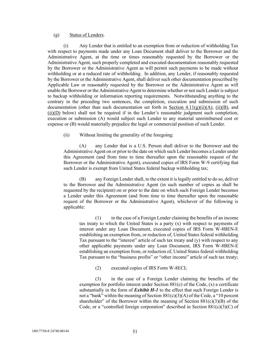 18017730v8 24740.00144 51 (g) Status of Lenders. (i) Any Lender that is entitled to an exemption from or reduction of withholding Tax with respect to payments made under any Loan Document shall deliver to the Borrower and the Administrative Agent, at the time or times reasonably requested by the Borrower or the Administrative Agent, such properly completed and executed documentation reasonably requested by the Borrower or the Administrative Agent as will permit such payments to be made without withholding or at a reduced rate of withholding. In addition, any Lender, if reasonably requested by the Borrower or the Administrative Agent, shall deliver such other documentation prescribed by Applicable Law or reasonably requested by the Borrower or the Administrative Agent as will enable the Borrower or the Administrative Agent to determine whether or not such Lender is subject to backup withholding or information reporting requirements. Notwithstanding anything to the contrary in the preceding two sentences, the completion, execution and submission of such documentation (other than such documentation set forth in Section 4.11(g)(ii)(A), (ii)(B), and (ii)(D) below) shall not be required if in the Lender’s reasonable judgment such completion, execution or submission (A) would subject such Lender to any material unreimbursed cost or expense or (B) would materially prejudice the legal or commercial position of such Lender. (ii) Without limiting the generality of the foregoing: (A) any Lender that is a U.S. Person shall deliver to the Borrower and the Administrative Agent on or prior to the date on which such Lender becomes a Lender under this Agreement (and from time to time thereafter upon the reasonable request of the Borrower or the Administrative Agent), executed copies of IRS Form W-9 certifying that such Lender is exempt from United States federal backup withholding tax; (B) any Foreign Lender shall, to the extent it is legally entitled to do so, deliver to the Borrower and the Administrative Agent (in such number of copies as shall be requested by the recipient) on or prior to the date on which such Foreign Lender becomes a Lender under this Agreement (and from time to time thereafter upon the reasonable request of the Borrower or the Administrative Agent), whichever of the following is applicable: (1) in the case of a Foreign Lender claiming the benefits of an income tax treaty to which the United States is a party (x) with respect to payments of interest under any Loan Document, executed copies of IRS Form W-8BEN-E establishing an exemption from, or reduction of, United States federal withholding Tax pursuant to the “interest” article of such tax treaty and (y) with respect to any other applicable payments under any Loan Document, IRS Form W-8BEN-E establishing an exemption from, or reduction of, United States federal withholding Tax pursuant to the “business profits” or “other income” article of such tax treaty; (2) executed copies of IRS Form W-8ECI; (3) in the case of a Foreign Lender claiming the benefits of the exemption for portfolio interest under Section 881(c) of the Code, (x) a certificate substantially in the form of Exhibit H-1 to the effect that such Foreign Lender is not a “bank” within the meaning of Section 881(c)(3)(A) of the Code, a “10 percent shareholder” of the Borrower within the meaning of Section 881(c)(3)(B) of the Code, or a “controlled foreign corporation” described in Section 881(c)(3)(C) of