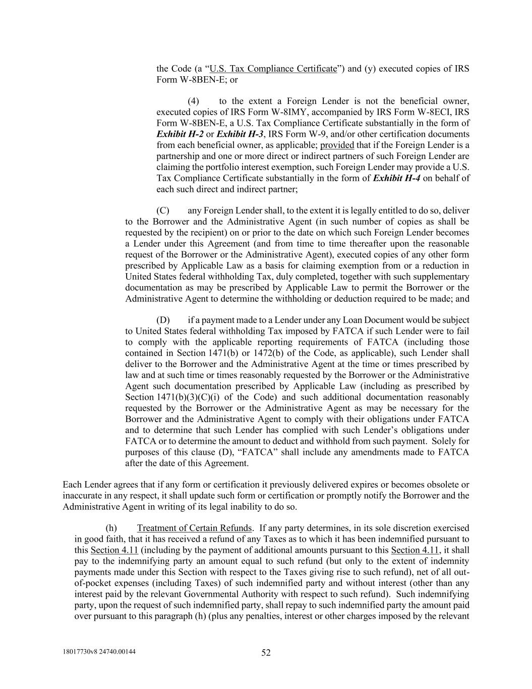 18017730v8 24740.00144 52 the Code (a “U.S. Tax Compliance Certificate”) and (y) executed copies of IRS Form W-8BEN-E; or (4) to the extent a Foreign Lender is not the beneficial owner, executed copies of IRS Form W-8IMY, accompanied by IRS Form W-8ECI, IRS Form W-8BEN-E, a U.S. Tax Compliance Certificate substantially in the form of Exhibit H-2 or Exhibit H-3, IRS Form W-9, and/or other certification documents from each beneficial owner, as applicable; provided that if the Foreign Lender is a partnership and one or more direct or indirect partners of such Foreign Lender are claiming the portfolio interest exemption, such Foreign Lender may provide a U.S. Tax Compliance Certificate substantially in the form of Exhibit H-4 on behalf of each such direct and indirect partner; (C) any Foreign Lender shall, to the extent it is legally entitled to do so, deliver to the Borrower and the Administrative Agent (in such number of copies as shall be requested by the recipient) on or prior to the date on which such Foreign Lender becomes a Lender under this Agreement (and from time to time thereafter upon the reasonable request of the Borrower or the Administrative Agent), executed copies of any other form prescribed by Applicable Law as a basis for claiming exemption from or a reduction in United States federal withholding Tax, duly completed, together with such supplementary documentation as may be prescribed by Applicable Law to permit the Borrower or the Administrative Agent to determine the withholding or deduction required to be made; and (D) if a payment made to a Lender under any Loan Document would be subject to United States federal withholding Tax imposed by FATCA if such Lender were to fail to comply with the applicable reporting requirements of FATCA (including those contained in Section 1471(b) or 1472(b) of the Code, as applicable), such Lender shall deliver to the Borrower and the Administrative Agent at the time or times prescribed by law and at such time or times reasonably requested by the Borrower or the Administrative Agent such documentation prescribed by Applicable Law (including as prescribed by Section 1471(b)(3)(C)(i) of the Code) and such additional documentation reasonably requested by the Borrower or the Administrative Agent as may be necessary for the Borrower and the Administrative Agent to comply with their obligations under FATCA and to determine that such Lender has complied with such Lender’s obligations under FATCA or to determine the amount to deduct and withhold from such payment. Solely for purposes of this clause (D), “FATCA” shall include any amendments made to FATCA after the date of this Agreement. Each Lender agrees that if any form or certification it previously delivered expires or becomes obsolete or inaccurate in any respect, it shall update such form or certification or promptly notify the Borrower and the Administrative Agent in writing of its legal inability to do so. (h) Treatment of Certain Refunds. If any party determines, in its sole discretion exercised in good faith, that it has received a refund of any Taxes as to which it has been indemnified pursuant to this Section 4.11 (including by the payment of additional amounts pursuant to this Section 4.11, it shall pay to the indemnifying party an amount equal to such refund (but only to the extent of indemnity payments made under this Section with respect to the Taxes giving rise to such refund), net of all out- of-pocket expenses (including Taxes) of such indemnified party and without interest (other than any interest paid by the relevant Governmental Authority with respect to such refund). Such indemnifying party, upon the request of such indemnified party, shall repay to such indemnified party the amount paid over pursuant to this paragraph (h) (plus any penalties, interest or other charges imposed by the relevant