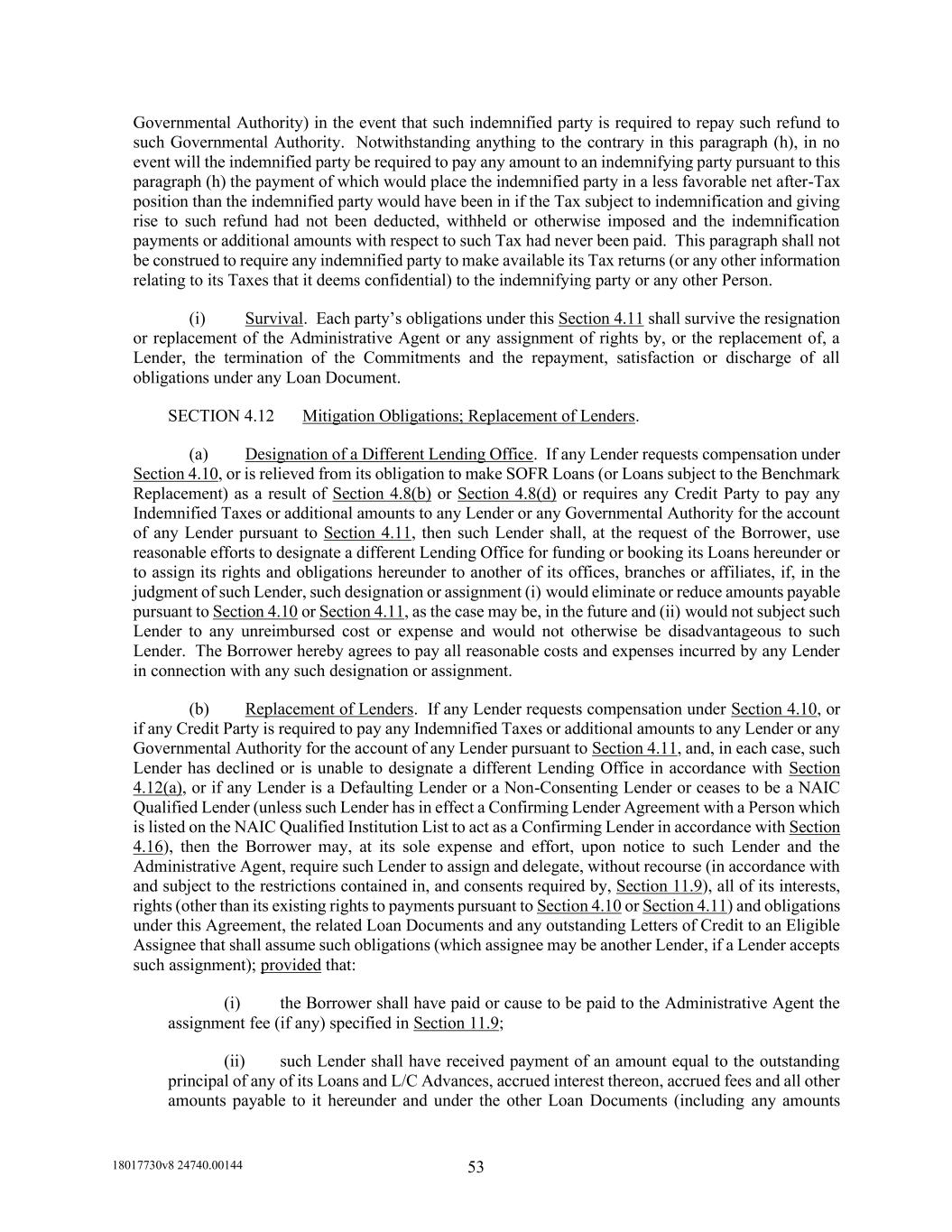 18017730v8 24740.00144 53 Governmental Authority) in the event that such indemnified party is required to repay such refund to such Governmental Authority. Notwithstanding anything to the contrary in this paragraph (h), in no event will the indemnified party be required to pay any amount to an indemnifying party pursuant to this paragraph (h) the payment of which would place the indemnified party in a less favorable net after-Tax position than the indemnified party would have been in if the Tax subject to indemnification and giving rise to such refund had not been deducted, withheld or otherwise imposed and the indemnification payments or additional amounts with respect to such Tax had never been paid. This paragraph shall not be construed to require any indemnified party to make available its Tax returns (or any other information relating to its Taxes that it deems confidential) to the indemnifying party or any other Person. (i) Survival. Each party’s obligations under this Section 4.11 shall survive the resignation or replacement of the Administrative Agent or any assignment of rights by, or the replacement of, a Lender, the termination of the Commitments and the repayment, satisfaction or discharge of all obligations under any Loan Document. SECTION 4.12 Mitigation Obligations; Replacement of Lenders. (a) Designation of a Different Lending Office. If any Lender requests compensation under Section 4.10, or is relieved from its obligation to make SOFR Loans (or Loans subject to the Benchmark Replacement) as a result of Section 4.8(b) or Section 4.8(d) or requires any Credit Party to pay any Indemnified Taxes or additional amounts to any Lender or any Governmental Authority for the account of any Lender pursuant to Section 4.11, then such Lender shall, at the request of the Borrower, use reasonable efforts to designate a different Lending Office for funding or booking its Loans hereunder or to assign its rights and obligations hereunder to another of its offices, branches or affiliates, if, in the judgment of such Lender, such designation or assignment (i) would eliminate or reduce amounts payable pursuant to Section 4.10 or Section 4.11, as the case may be, in the future and (ii) would not subject such Lender to any unreimbursed cost or expense and would not otherwise be disadvantageous to such Lender. The Borrower hereby agrees to pay all reasonable costs and expenses incurred by any Lender in connection with any such designation or assignment. (b) Replacement of Lenders. If any Lender requests compensation under Section 4.10, or if any Credit Party is required to pay any Indemnified Taxes or additional amounts to any Lender or any Governmental Authority for the account of any Lender pursuant to Section 4.11, and, in each case, such Lender has declined or is unable to designate a different Lending Office in accordance with Section 4.12(a), or if any Lender is a Defaulting Lender or a Non-Consenting Lender or ceases to be a NAIC Qualified Lender (unless such Lender has in effect a Confirming Lender Agreement with a Person which is listed on the NAIC Qualified Institution List to act as a Confirming Lender in accordance with Section 4.16), then the Borrower may, at its sole expense and effort, upon notice to such Lender and the Administrative Agent, require such Lender to assign and delegate, without recourse (in accordance with and subject to the restrictions contained in, and consents required by, Section 11.9), all of its interests, rights (other than its existing rights to payments pursuant to Section 4.10 or Section 4.11) and obligations under this Agreement, the related Loan Documents and any outstanding Letters of Credit to an Eligible Assignee that shall assume such obligations (which assignee may be another Lender, if a Lender accepts such assignment); provided that: (i) the Borrower shall have paid or cause to be paid to the Administrative Agent the assignment fee (if any) specified in Section 11.9; (ii) such Lender shall have received payment of an amount equal to the outstanding principal of any of its Loans and L/C Advances, accrued interest thereon, accrued fees and all other amounts payable to it hereunder and under the other Loan Documents (including any amounts