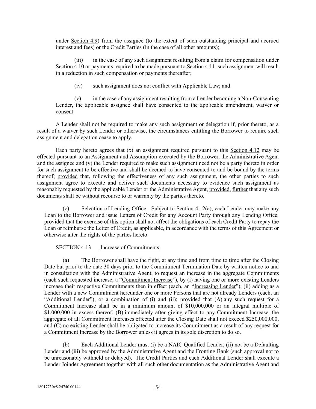 18017730v8 24740.00144 54 under Section 4.9) from the assignee (to the extent of such outstanding principal and accrued interest and fees) or the Credit Parties (in the case of all other amounts); (iii) in the case of any such assignment resulting from a claim for compensation under Section 4.10 or payments required to be made pursuant to Section 4.11, such assignment will result in a reduction in such compensation or payments thereafter; (iv) such assignment does not conflict with Applicable Law; and (v) in the case of any assignment resulting from a Lender becoming a Non-Consenting Lender, the applicable assignee shall have consented to the applicable amendment, waiver or consent. A Lender shall not be required to make any such assignment or delegation if, prior thereto, as a result of a waiver by such Lender or otherwise, the circumstances entitling the Borrower to require such assignment and delegation cease to apply. Each party hereto agrees that (x) an assignment required pursuant to this Section 4.12 may be effected pursuant to an Assignment and Assumption executed by the Borrower, the Administrative Agent and the assignee and (y) the Lender required to make such assignment need not be a party thereto in order for such assignment to be effective and shall be deemed to have consented to and be bound by the terms thereof; provided that, following the effectiveness of any such assignment, the other parties to such assignment agree to execute and deliver such documents necessary to evidence such assignment as reasonably requested by the applicable Lender or the Administrative Agent, provided, further that any such documents shall be without recourse to or warranty by the parties thereto. (c) Selection of Lending Office. Subject to Section 4.12(a), each Lender may make any Loan to the Borrower and issue Letters of Credit for any Account Party through any Lending Office, provided that the exercise of this option shall not affect the obligations of each Credit Party to repay the Loan or reimburse the Letter of Credit, as applicable, in accordance with the terms of this Agreement or otherwise alter the rights of the parties hereto. SECTION 4.13 Increase of Commitments. (a) The Borrower shall have the right, at any time and from time to time after the Closing Date but prior to the date 30 days prior to the Commitment Termination Date by written notice to and in consultation with the Administrative Agent, to request an increase in the aggregate Commitments (each such requested increase, a “Commitment Increase”), by (i) having one or more existing Lenders increase their respective Commitments then in effect (each, an “Increasing Lender”), (ii) adding as a Lender with a new Commitment hereunder one or more Persons that are not already Lenders (each, an “Additional Lender”), or a combination of (i) and (ii); provided that (A) any such request for a Commitment Increase shall be in a minimum amount of $10,000,000 or an integral multiple of $1,000,000 in excess thereof, (B) immediately after giving effect to any Commitment Increase, the aggregate of all Commitment Increases effected after the Closing Date shall not exceed $250,000,000, and (C) no existing Lender shall be obligated to increase its Commitment as a result of any request for a Commitment Increase by the Borrower unless it agrees in its sole discretion to do so. (b) Each Additional Lender must (i) be a NAIC Qualified Lender, (ii) not be a Defaulting Lender and (iii) be approved by the Administrative Agent and the Fronting Bank (such approval not to be unreasonably withheld or delayed). The Credit Parties and each Additional Lender shall execute a Lender Joinder Agreement together with all such other documentation as the Administrative Agent and
