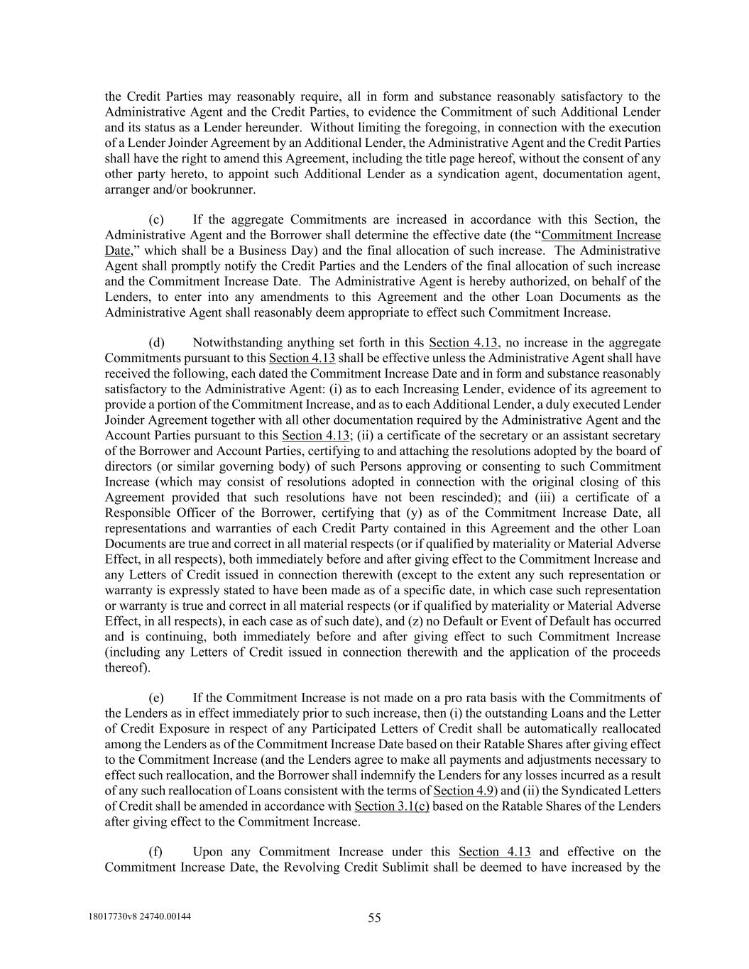 18017730v8 24740.00144 55 the Credit Parties may reasonably require, all in form and substance reasonably satisfactory to the Administrative Agent and the Credit Parties, to evidence the Commitment of such Additional Lender and its status as a Lender hereunder. Without limiting the foregoing, in connection with the execution of a Lender Joinder Agreement by an Additional Lender, the Administrative Agent and the Credit Parties shall have the right to amend this Agreement, including the title page hereof, without the consent of any other party hereto, to appoint such Additional Lender as a syndication agent, documentation agent, arranger and/or bookrunner. (c) If the aggregate Commitments are increased in accordance with this Section, the Administrative Agent and the Borrower shall determine the effective date (the “Commitment Increase Date,” which shall be a Business Day) and the final allocation of such increase. The Administrative Agent shall promptly notify the Credit Parties and the Lenders of the final allocation of such increase and the Commitment Increase Date. The Administrative Agent is hereby authorized, on behalf of the Lenders, to enter into any amendments to this Agreement and the other Loan Documents as the Administrative Agent shall reasonably deem appropriate to effect such Commitment Increase. (d) Notwithstanding anything set forth in this Section 4.13, no increase in the aggregate Commitments pursuant to this Section 4.13 shall be effective unless the Administrative Agent shall have received the following, each dated the Commitment Increase Date and in form and substance reasonably satisfactory to the Administrative Agent: (i) as to each Increasing Lender, evidence of its agreement to provide a portion of the Commitment Increase, and as to each Additional Lender, a duly executed Lender Joinder Agreement together with all other documentation required by the Administrative Agent and the Account Parties pursuant to this Section 4.13; (ii) a certificate of the secretary or an assistant secretary of the Borrower and Account Parties, certifying to and attaching the resolutions adopted by the board of directors (or similar governing body) of such Persons approving or consenting to such Commitment Increase (which may consist of resolutions adopted in connection with the original closing of this Agreement provided that such resolutions have not been rescinded); and (iii) a certificate of a Responsible Officer of the Borrower, certifying that (y) as of the Commitment Increase Date, all representations and warranties of each Credit Party contained in this Agreement and the other Loan Documents are true and correct in all material respects (or if qualified by materiality or Material Adverse Effect, in all respects), both immediately before and after giving effect to the Commitment Increase and any Letters of Credit issued in connection therewith (except to the extent any such representation or warranty is expressly stated to have been made as of a specific date, in which case such representation or warranty is true and correct in all material respects (or if qualified by materiality or Material Adverse Effect, in all respects), in each case as of such date), and (z) no Default or Event of Default has occurred and is continuing, both immediately before and after giving effect to such Commitment Increase (including any Letters of Credit issued in connection therewith and the application of the proceeds thereof). (e) If the Commitment Increase is not made on a pro rata basis with the Commitments of the Lenders as in effect immediately prior to such increase, then (i) the outstanding Loans and the Letter of Credit Exposure in respect of any Participated Letters of Credit shall be automatically reallocated among the Lenders as of the Commitment Increase Date based on their Ratable Shares after giving effect to the Commitment Increase (and the Lenders agree to make all payments and adjustments necessary to effect such reallocation, and the Borrower shall indemnify the Lenders for any losses incurred as a result of any such reallocation of Loans consistent with the terms of Section 4.9) and (ii) the Syndicated Letters of Credit shall be amended in accordance with Section 3.1(c) based on the Ratable Shares of the Lenders after giving effect to the Commitment Increase. (f) Upon any Commitment Increase under this Section 4.13 and effective on the Commitment Increase Date, the Revolving Credit Sublimit shall be deemed to have increased by the