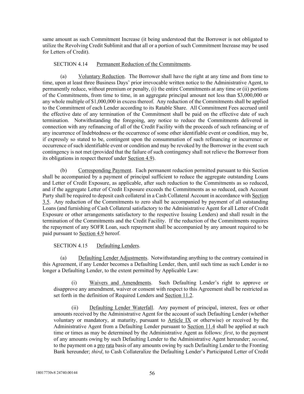18017730v8 24740.00144 56 same amount as such Commitment Increase (it being understood that the Borrower is not obligated to utilize the Revolving Credit Sublimit and that all or a portion of such Commitment Increase may be used for Letters of Credit). SECTION 4.14 Permanent Reduction of the Commitments. (a) Voluntary Reduction. The Borrower shall have the right at any time and from time to time, upon at least three Business Days’ prior irrevocable written notice to the Administrative Agent, to permanently reduce, without premium or penalty, (i) the entire Commitments at any time or (ii) portions of the Commitments, from time to time, in an aggregate principal amount not less than $3,000,000 or any whole multiple of $1,000,000 in excess thereof. Any reduction of the Commitments shall be applied to the Commitment of each Lender according to its Ratable Share. All Commitment Fees accrued until the effective date of any termination of the Commitment shall be paid on the effective date of such termination. Notwithstanding the foregoing, any notice to reduce the Commitments delivered in connection with any refinancing of all of the Credit Facility with the proceeds of such refinancing or of any incurrence of Indebtedness or the occurrence of some other identifiable event or condition, may be, if expressly so stated to be, contingent upon the consummation of such refinancing or incurrence or occurrence of such identifiable event or condition and may be revoked by the Borrower in the event such contingency is not met (provided that the failure of such contingency shall not relieve the Borrower from its obligations in respect thereof under Section 4.9). (b) Corresponding Payment. Each permanent reduction permitted pursuant to this Section shall be accompanied by a payment of principal sufficient to reduce the aggregate outstanding Loans and Letter of Credit Exposure, as applicable, after such reduction to the Commitments as so reduced, and if the aggregate Letter of Credit Exposure exceeds the Commitments as so reduced, each Account Party shall be required to deposit cash collateral in a Cash Collateral Account in accordance with Section 3.5. Any reduction of the Commitments to zero shall be accompanied by payment of all outstanding Loans (and furnishing of Cash Collateral satisfactory to the Administrative Agent for all Letter of Credit Exposure or other arrangements satisfactory to the respective Issuing Lenders) and shall result in the termination of the Commitments and the Credit Facility. If the reduction of the Commitments requires the repayment of any SOFR Loan, such repayment shall be accompanied by any amount required to be paid pursuant to Section 4.9 hereof. SECTION 4.15 Defaulting Lenders. (a) Defaulting Lender Adjustments. Notwithstanding anything to the contrary contained in this Agreement, if any Lender becomes a Defaulting Lender, then, until such time as such Lender is no longer a Defaulting Lender, to the extent permitted by Applicable Law: (i) Waivers and Amendments. Such Defaulting Lender’s right to approve or disapprove any amendment, waiver or consent with respect to this Agreement shall be restricted as set forth in the definition of Required Lenders and Section 11.2. (ii) Defaulting Lender Waterfall. Any payment of principal, interest, fees or other amounts received by the Administrative Agent for the account of such Defaulting Lender (whether voluntary or mandatory, at maturity, pursuant to Article IX or otherwise) or received by the Administrative Agent from a Defaulting Lender pursuant to Section 11.4 shall be applied at such time or times as may be determined by the Administrative Agent as follows: first, to the payment of any amounts owing by such Defaulting Lender to the Administrative Agent hereunder; second, to the payment on a pro rata basis of any amounts owing by such Defaulting Lender to the Fronting Bank hereunder; third, to Cash Collateralize the Defaulting Lender’s Participated Letter of Credit