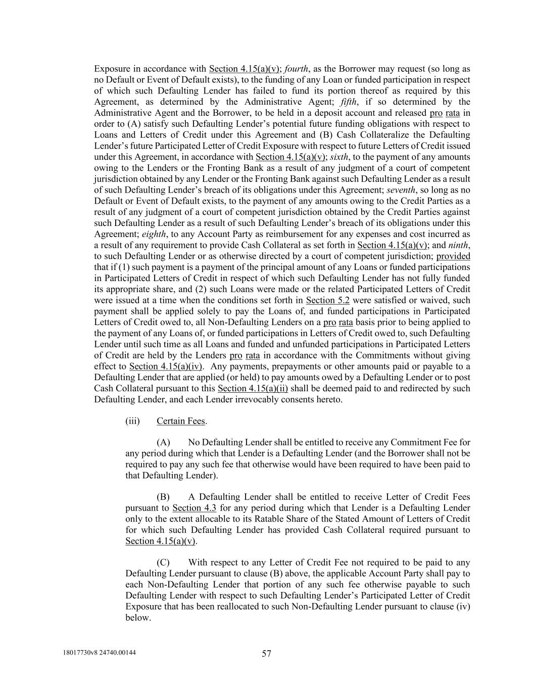 18017730v8 24740.00144 57 Exposure in accordance with Section 4.15(a)(v); fourth, as the Borrower may request (so long as no Default or Event of Default exists), to the funding of any Loan or funded participation in respect of which such Defaulting Lender has failed to fund its portion thereof as required by this Agreement, as determined by the Administrative Agent; fifth, if so determined by the Administrative Agent and the Borrower, to be held in a deposit account and released pro rata in order to (A) satisfy such Defaulting Lender’s potential future funding obligations with respect to Loans and Letters of Credit under this Agreement and (B) Cash Collateralize the Defaulting Lender’s future Participated Letter of Credit Exposure with respect to future Letters of Credit issued under this Agreement, in accordance with Section 4.15(a)(v); sixth, to the payment of any amounts owing to the Lenders or the Fronting Bank as a result of any judgment of a court of competent jurisdiction obtained by any Lender or the Fronting Bank against such Defaulting Lender as a result of such Defaulting Lender’s breach of its obligations under this Agreement; seventh, so long as no Default or Event of Default exists, to the payment of any amounts owing to the Credit Parties as a result of any judgment of a court of competent jurisdiction obtained by the Credit Parties against such Defaulting Lender as a result of such Defaulting Lender’s breach of its obligations under this Agreement; eighth, to any Account Party as reimbursement for any expenses and cost incurred as a result of any requirement to provide Cash Collateral as set forth in Section 4.15(a)(v); and ninth, to such Defaulting Lender or as otherwise directed by a court of competent jurisdiction; provided that if (1) such payment is a payment of the principal amount of any Loans or funded participations in Participated Letters of Credit in respect of which such Defaulting Lender has not fully funded its appropriate share, and (2) such Loans were made or the related Participated Letters of Credit were issued at a time when the conditions set forth in Section 5.2 were satisfied or waived, such payment shall be applied solely to pay the Loans of, and funded participations in Participated Letters of Credit owed to, all Non-Defaulting Lenders on a pro rata basis prior to being applied to the payment of any Loans of, or funded participations in Letters of Credit owed to, such Defaulting Lender until such time as all Loans and funded and unfunded participations in Participated Letters of Credit are held by the Lenders pro rata in accordance with the Commitments without giving effect to Section 4.15(a)(iv). Any payments, prepayments or other amounts paid or payable to a Defaulting Lender that are applied (or held) to pay amounts owed by a Defaulting Lender or to post Cash Collateral pursuant to this Section 4.15(a)(ii) shall be deemed paid to and redirected by such Defaulting Lender, and each Lender irrevocably consents hereto. (iii) Certain Fees. (A) No Defaulting Lender shall be entitled to receive any Commitment Fee for any period during which that Lender is a Defaulting Lender (and the Borrower shall not be required to pay any such fee that otherwise would have been required to have been paid to that Defaulting Lender). (B) A Defaulting Lender shall be entitled to receive Letter of Credit Fees pursuant to Section 4.3 for any period during which that Lender is a Defaulting Lender only to the extent allocable to its Ratable Share of the Stated Amount of Letters of Credit for which such Defaulting Lender has provided Cash Collateral required pursuant to Section 4.15(a)(v). (C) With respect to any Letter of Credit Fee not required to be paid to any Defaulting Lender pursuant to clause (B) above, the applicable Account Party shall pay to each Non-Defaulting Lender that portion of any such fee otherwise payable to such Defaulting Lender with respect to such Defaulting Lender’s Participated Letter of Credit Exposure that has been reallocated to such Non-Defaulting Lender pursuant to clause (iv) below.