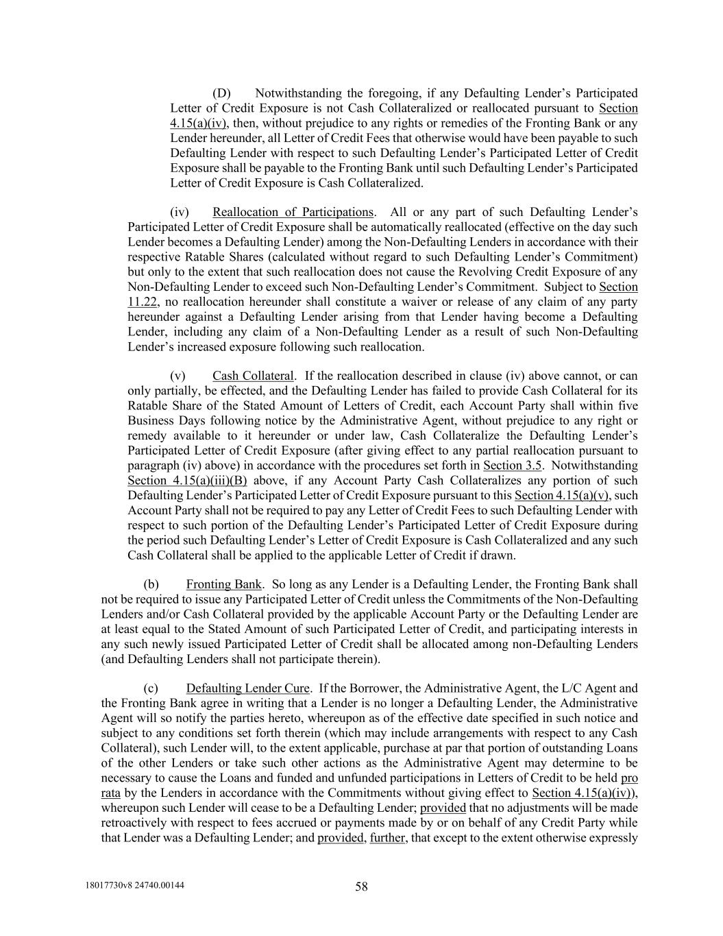 18017730v8 24740.00144 58 (D) Notwithstanding the foregoing, if any Defaulting Lender’s Participated Letter of Credit Exposure is not Cash Collateralized or reallocated pursuant to Section 4.15(a)(iv), then, without prejudice to any rights or remedies of the Fronting Bank or any Lender hereunder, all Letter of Credit Fees that otherwise would have been payable to such Defaulting Lender with respect to such Defaulting Lender’s Participated Letter of Credit Exposure shall be payable to the Fronting Bank until such Defaulting Lender’s Participated Letter of Credit Exposure is Cash Collateralized. (iv) Reallocation of Participations. All or any part of such Defaulting Lender’s Participated Letter of Credit Exposure shall be automatically reallocated (effective on the day such Lender becomes a Defaulting Lender) among the Non-Defaulting Lenders in accordance with their respective Ratable Shares (calculated without regard to such Defaulting Lender’s Commitment) but only to the extent that such reallocation does not cause the Revolving Credit Exposure of any Non-Defaulting Lender to exceed such Non-Defaulting Lender’s Commitment. Subject to Section 11.22, no reallocation hereunder shall constitute a waiver or release of any claim of any party hereunder against a Defaulting Lender arising from that Lender having become a Defaulting Lender, including any claim of a Non-Defaulting Lender as a result of such Non-Defaulting Lender’s increased exposure following such reallocation. (v) Cash Collateral. If the reallocation described in clause (iv) above cannot, or can only partially, be effected, and the Defaulting Lender has failed to provide Cash Collateral for its Ratable Share of the Stated Amount of Letters of Credit, each Account Party shall within five Business Days following notice by the Administrative Agent, without prejudice to any right or remedy available to it hereunder or under law, Cash Collateralize the Defaulting Lender’s Participated Letter of Credit Exposure (after giving effect to any partial reallocation pursuant to paragraph (iv) above) in accordance with the procedures set forth in Section 3.5. Notwithstanding Section 4.15(a)(iii)(B) above, if any Account Party Cash Collateralizes any portion of such Defaulting Lender’s Participated Letter of Credit Exposure pursuant to this Section 4.15(a)(v), such Account Party shall not be required to pay any Letter of Credit Fees to such Defaulting Lender with respect to such portion of the Defaulting Lender’s Participated Letter of Credit Exposure during the period such Defaulting Lender’s Letter of Credit Exposure is Cash Collateralized and any such Cash Collateral shall be applied to the applicable Letter of Credit if drawn. (b) Fronting Bank. So long as any Lender is a Defaulting Lender, the Fronting Bank shall not be required to issue any Participated Letter of Credit unless the Commitments of the Non-Defaulting Lenders and/or Cash Collateral provided by the applicable Account Party or the Defaulting Lender are at least equal to the Stated Amount of such Participated Letter of Credit, and participating interests in any such newly issued Participated Letter of Credit shall be allocated among non-Defaulting Lenders (and Defaulting Lenders shall not participate therein). (c) Defaulting Lender Cure. If the Borrower, the Administrative Agent, the L/C Agent and the Fronting Bank agree in writing that a Lender is no longer a Defaulting Lender, the Administrative Agent will so notify the parties hereto, whereupon as of the effective date specified in such notice and subject to any conditions set forth therein (which may include arrangements with respect to any Cash Collateral), such Lender will, to the extent applicable, purchase at par that portion of outstanding Loans of the other Lenders or take such other actions as the Administrative Agent may determine to be necessary to cause the Loans and funded and unfunded participations in Letters of Credit to be held pro rata by the Lenders in accordance with the Commitments without giving effect to Section 4.15(a)(iv)), whereupon such Lender will cease to be a Defaulting Lender; provided that no adjustments will be made retroactively with respect to fees accrued or payments made by or on behalf of any Credit Party while that Lender was a Defaulting Lender; and provided, further, that except to the extent otherwise expressly