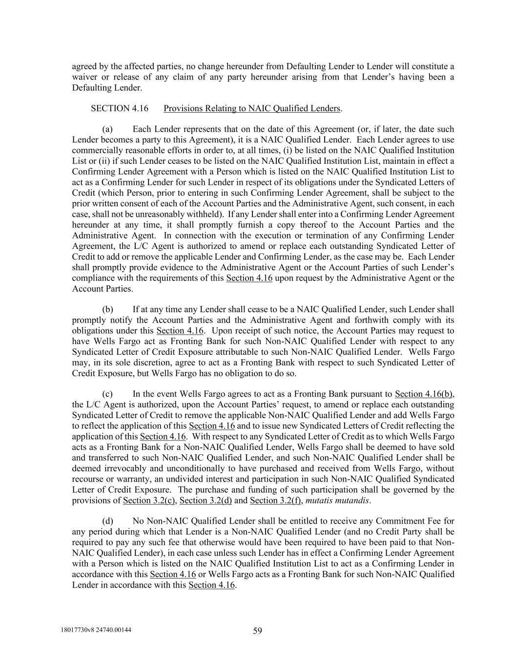 18017730v8 24740.00144 59 agreed by the affected parties, no change hereunder from Defaulting Lender to Lender will constitute a waiver or release of any claim of any party hereunder arising from that Lender’s having been a Defaulting Lender. SECTION 4.16 Provisions Relating to NAIC Qualified Lenders. (a) Each Lender represents that on the date of this Agreement (or, if later, the date such Lender becomes a party to this Agreement), it is a NAIC Qualified Lender. Each Lender agrees to use commercially reasonable efforts in order to, at all times, (i) be listed on the NAIC Qualified Institution List or (ii) if such Lender ceases to be listed on the NAIC Qualified Institution List, maintain in effect a Confirming Lender Agreement with a Person which is listed on the NAIC Qualified Institution List to act as a Confirming Lender for such Lender in respect of its obligations under the Syndicated Letters of Credit (which Person, prior to entering in such Confirming Lender Agreement, shall be subject to the prior written consent of each of the Account Parties and the Administrative Agent, such consent, in each case, shall not be unreasonably withheld). If any Lender shall enter into a Confirming Lender Agreement hereunder at any time, it shall promptly furnish a copy thereof to the Account Parties and the Administrative Agent. In connection with the execution or termination of any Confirming Lender Agreement, the L/C Agent is authorized to amend or replace each outstanding Syndicated Letter of Credit to add or remove the applicable Lender and Confirming Lender, as the case may be. Each Lender shall promptly provide evidence to the Administrative Agent or the Account Parties of such Lender’s compliance with the requirements of this Section 4.16 upon request by the Administrative Agent or the Account Parties. (b) If at any time any Lender shall cease to be a NAIC Qualified Lender, such Lender shall promptly notify the Account Parties and the Administrative Agent and forthwith comply with its obligations under this Section 4.16. Upon receipt of such notice, the Account Parties may request to have Wells Fargo act as Fronting Bank for such Non-NAIC Qualified Lender with respect to any Syndicated Letter of Credit Exposure attributable to such Non-NAIC Qualified Lender. Wells Fargo may, in its sole discretion, agree to act as a Fronting Bank with respect to such Syndicated Letter of Credit Exposure, but Wells Fargo has no obligation to do so. (c) In the event Wells Fargo agrees to act as a Fronting Bank pursuant to Section 4.16(b), the L/C Agent is authorized, upon the Account Parties’ request, to amend or replace each outstanding Syndicated Letter of Credit to remove the applicable Non-NAIC Qualified Lender and add Wells Fargo to reflect the application of this Section 4.16 and to issue new Syndicated Letters of Credit reflecting the application of this Section 4.16. With respect to any Syndicated Letter of Credit as to which Wells Fargo acts as a Fronting Bank for a Non-NAIC Qualified Lender, Wells Fargo shall be deemed to have sold and transferred to such Non-NAIC Qualified Lender, and such Non-NAIC Qualified Lender shall be deemed irrevocably and unconditionally to have purchased and received from Wells Fargo, without recourse or warranty, an undivided interest and participation in such Non-NAIC Qualified Syndicated Letter of Credit Exposure. The purchase and funding of such participation shall be governed by the provisions of Section 3.2(c), Section 3.2(d) and Section 3.2(f), mutatis mutandis. (d) No Non-NAIC Qualified Lender shall be entitled to receive any Commitment Fee for any period during which that Lender is a Non-NAIC Qualified Lender (and no Credit Party shall be required to pay any such fee that otherwise would have been required to have been paid to that Non- NAIC Qualified Lender), in each case unless such Lender has in effect a Confirming Lender Agreement with a Person which is listed on the NAIC Qualified Institution List to act as a Confirming Lender in accordance with this Section 4.16 or Wells Fargo acts as a Fronting Bank for such Non-NAIC Qualified Lender in accordance with this Section 4.16.