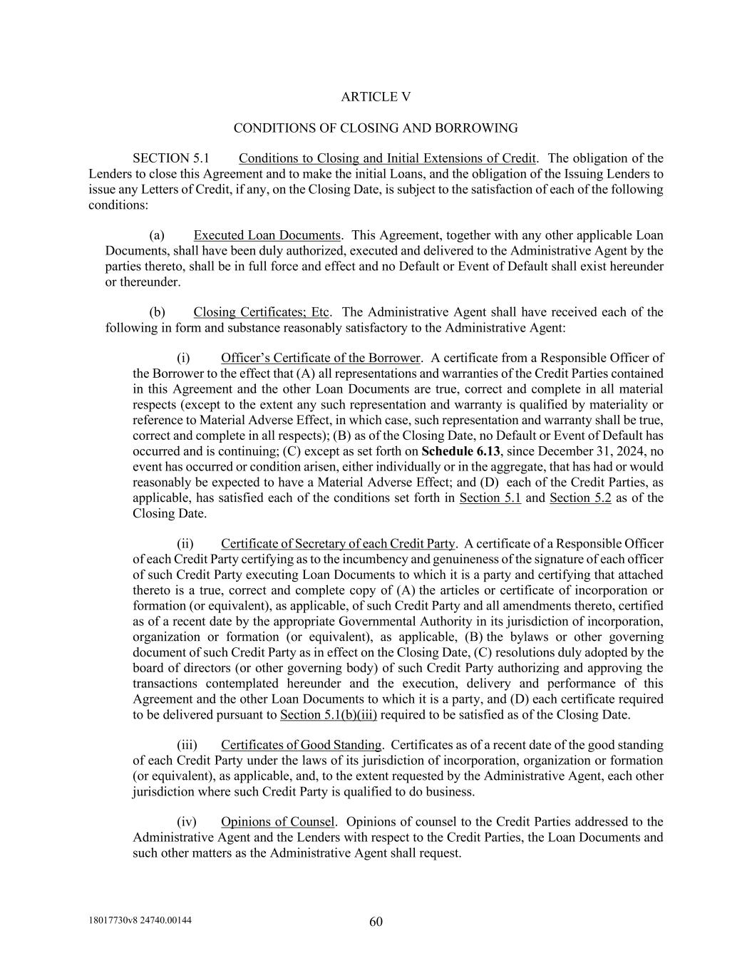 18017730v8 24740.00144 60 ARTICLE V CONDITIONS OF CLOSING AND BORROWING SECTION 5.1 Conditions to Closing and Initial Extensions of Credit. The obligation of the Lenders to close this Agreement and to make the initial Loans, and the obligation of the Issuing Lenders to issue any Letters of Credit, if any, on the Closing Date, is subject to the satisfaction of each of the following conditions: (a) Executed Loan Documents. This Agreement, together with any other applicable Loan Documents, shall have been duly authorized, executed and delivered to the Administrative Agent by the parties thereto, shall be in full force and effect and no Default or Event of Default shall exist hereunder or thereunder. (b) Closing Certificates; Etc. The Administrative Agent shall have received each of the following in form and substance reasonably satisfactory to the Administrative Agent: (i) Officer’s Certificate of the Borrower. A certificate from a Responsible Officer of the Borrower to the effect that (A) all representations and warranties of the Credit Parties contained in this Agreement and the other Loan Documents are true, correct and complete in all material respects (except to the extent any such representation and warranty is qualified by materiality or reference to Material Adverse Effect, in which case, such representation and warranty shall be true, correct and complete in all respects); (B) as of the Closing Date, no Default or Event of Default has occurred and is continuing; (C) except as set forth on Schedule 6.13, since December 31, 2024, no event has occurred or condition arisen, either individually or in the aggregate, that has had or would reasonably be expected to have a Material Adverse Effect; and (D) each of the Credit Parties, as applicable, has satisfied each of the conditions set forth in Section 5.1 and Section 5.2 as of the Closing Date. (ii) Certificate of Secretary of each Credit Party. A certificate of a Responsible Officer of each Credit Party certifying as to the incumbency and genuineness of the signature of each officer of such Credit Party executing Loan Documents to which it is a party and certifying that attached thereto is a true, correct and complete copy of (A) the articles or certificate of incorporation or formation (or equivalent), as applicable, of such Credit Party and all amendments thereto, certified as of a recent date by the appropriate Governmental Authority in its jurisdiction of incorporation, organization or formation (or equivalent), as applicable, (B) the bylaws or other governing document of such Credit Party as in effect on the Closing Date, (C) resolutions duly adopted by the board of directors (or other governing body) of such Credit Party authorizing and approving the transactions contemplated hereunder and the execution, delivery and performance of this Agreement and the other Loan Documents to which it is a party, and (D) each certificate required to be delivered pursuant to Section 5.1(b)(iii) required to be satisfied as of the Closing Date. (iii) Certificates of Good Standing. Certificates as of a recent date of the good standing of each Credit Party under the laws of its jurisdiction of incorporation, organization or formation (or equivalent), as applicable, and, to the extent requested by the Administrative Agent, each other jurisdiction where such Credit Party is qualified to do business. (iv) Opinions of Counsel. Opinions of counsel to the Credit Parties addressed to the Administrative Agent and the Lenders with respect to the Credit Parties, the Loan Documents and such other matters as the Administrative Agent shall request.