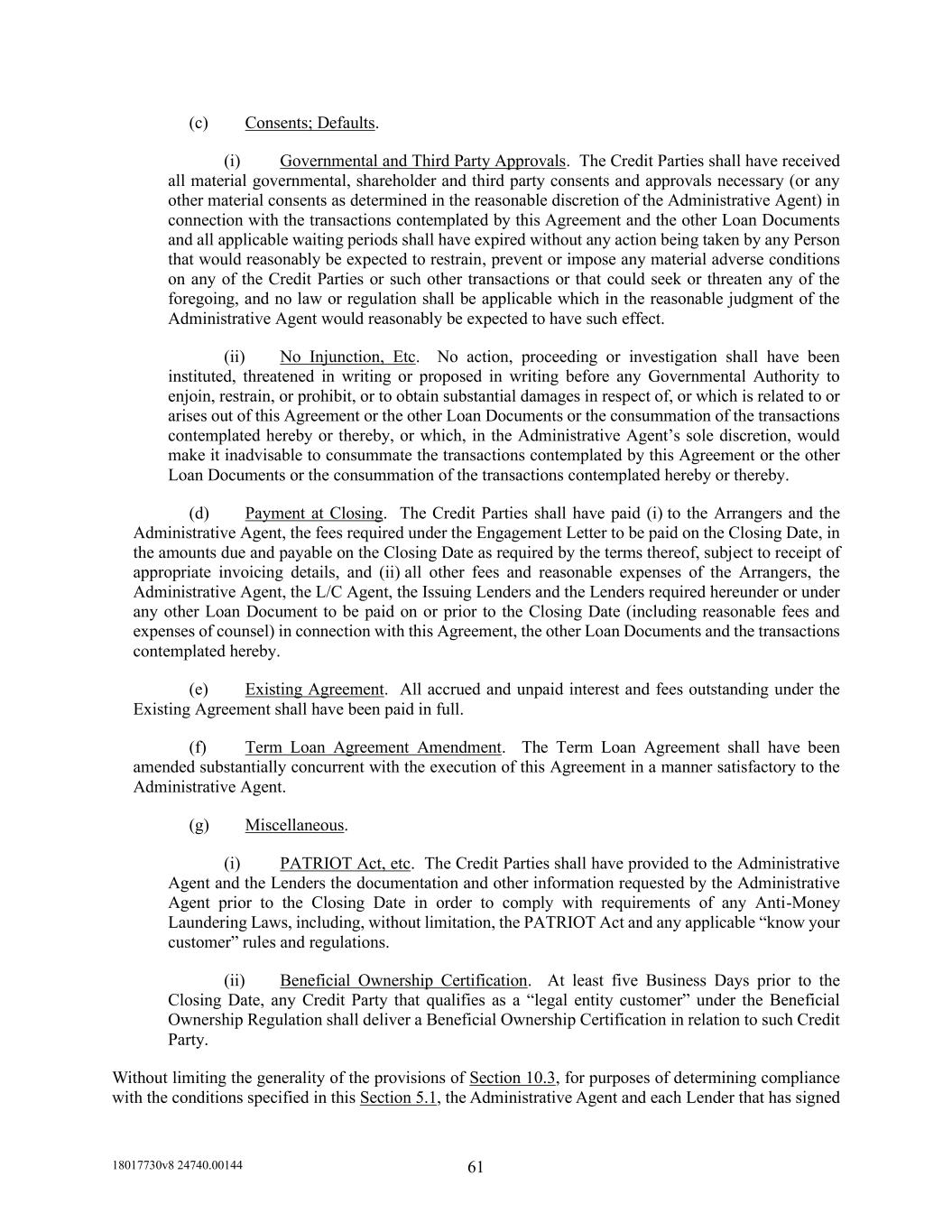 18017730v8 24740.00144 61 (c) Consents; Defaults. (i) Governmental and Third Party Approvals. The Credit Parties shall have received all material governmental, shareholder and third party consents and approvals necessary (or any other material consents as determined in the reasonable discretion of the Administrative Agent) in connection with the transactions contemplated by this Agreement and the other Loan Documents and all applicable waiting periods shall have expired without any action being taken by any Person that would reasonably be expected to restrain, prevent or impose any material adverse conditions on any of the Credit Parties or such other transactions or that could seek or threaten any of the foregoing, and no law or regulation shall be applicable which in the reasonable judgment of the Administrative Agent would reasonably be expected to have such effect. (ii) No Injunction, Etc. No action, proceeding or investigation shall have been instituted, threatened in writing or proposed in writing before any Governmental Authority to enjoin, restrain, or prohibit, or to obtain substantial damages in respect of, or which is related to or arises out of this Agreement or the other Loan Documents or the consummation of the transactions contemplated hereby or thereby, or which, in the Administrative Agent’s sole discretion, would make it inadvisable to consummate the transactions contemplated by this Agreement or the other Loan Documents or the consummation of the transactions contemplated hereby or thereby. (d) Payment at Closing. The Credit Parties shall have paid (i) to the Arrangers and the Administrative Agent, the fees required under the Engagement Letter to be paid on the Closing Date, in the amounts due and payable on the Closing Date as required by the terms thereof, subject to receipt of appropriate invoicing details, and (ii) all other fees and reasonable expenses of the Arrangers, the Administrative Agent, the L/C Agent, the Issuing Lenders and the Lenders required hereunder or under any other Loan Document to be paid on or prior to the Closing Date (including reasonable fees and expenses of counsel) in connection with this Agreement, the other Loan Documents and the transactions contemplated hereby. (e) Existing Agreement. All accrued and unpaid interest and fees outstanding under the Existing Agreement shall have been paid in full. (f) Term Loan Agreement Amendment. The Term Loan Agreement shall have been amended substantially concurrent with the execution of this Agreement in a manner satisfactory to the Administrative Agent. (g) Miscellaneous. (i) PATRIOT Act, etc. The Credit Parties shall have provided to the Administrative Agent and the Lenders the documentation and other information requested by the Administrative Agent prior to the Closing Date in order to comply with requirements of any Anti-Money Laundering Laws, including, without limitation, the PATRIOT Act and any applicable “know your customer” rules and regulations. (ii) Beneficial Ownership Certification. At least five Business Days prior to the Closing Date, any Credit Party that qualifies as a “legal entity customer” under the Beneficial Ownership Regulation shall deliver a Beneficial Ownership Certification in relation to such Credit Party. Without limiting the generality of the provisions of Section 10.3, for purposes of determining compliance with the conditions specified in this Section 5.1, the Administrative Agent and each Lender that has signed