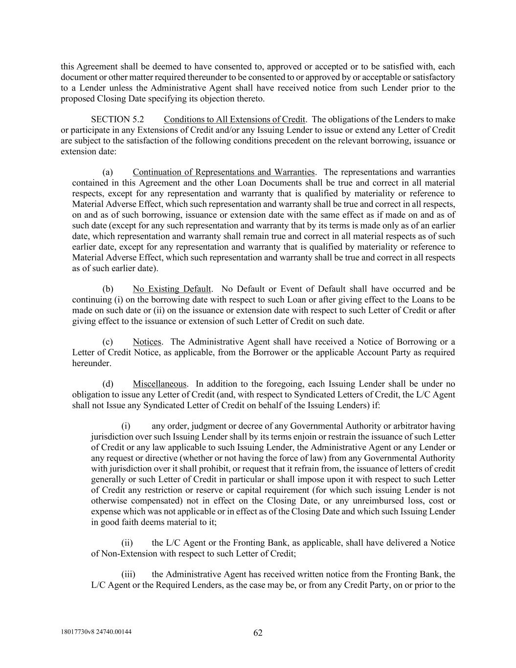 18017730v8 24740.00144 62 this Agreement shall be deemed to have consented to, approved or accepted or to be satisfied with, each document or other matter required thereunder to be consented to or approved by or acceptable or satisfactory to a Lender unless the Administrative Agent shall have received notice from such Lender prior to the proposed Closing Date specifying its objection thereto. SECTION 5.2 Conditions to All Extensions of Credit. The obligations of the Lenders to make or participate in any Extensions of Credit and/or any Issuing Lender to issue or extend any Letter of Credit are subject to the satisfaction of the following conditions precedent on the relevant borrowing, issuance or extension date: (a) Continuation of Representations and Warranties. The representations and warranties contained in this Agreement and the other Loan Documents shall be true and correct in all material respects, except for any representation and warranty that is qualified by materiality or reference to Material Adverse Effect, which such representation and warranty shall be true and correct in all respects, on and as of such borrowing, issuance or extension date with the same effect as if made on and as of such date (except for any such representation and warranty that by its terms is made only as of an earlier date, which representation and warranty shall remain true and correct in all material respects as of such earlier date, except for any representation and warranty that is qualified by materiality or reference to Material Adverse Effect, which such representation and warranty shall be true and correct in all respects as of such earlier date). (b) No Existing Default. No Default or Event of Default shall have occurred and be continuing (i) on the borrowing date with respect to such Loan or after giving effect to the Loans to be made on such date or (ii) on the issuance or extension date with respect to such Letter of Credit or after giving effect to the issuance or extension of such Letter of Credit on such date. (c) Notices. The Administrative Agent shall have received a Notice of Borrowing or a Letter of Credit Notice, as applicable, from the Borrower or the applicable Account Party as required hereunder. (d) Miscellaneous. In addition to the foregoing, each Issuing Lender shall be under no obligation to issue any Letter of Credit (and, with respect to Syndicated Letters of Credit, the L/C Agent shall not Issue any Syndicated Letter of Credit on behalf of the Issuing Lenders) if: (i) any order, judgment or decree of any Governmental Authority or arbitrator having jurisdiction over such Issuing Lender shall by its terms enjoin or restrain the issuance of such Letter of Credit or any law applicable to such Issuing Lender, the Administrative Agent or any Lender or any request or directive (whether or not having the force of law) from any Governmental Authority with jurisdiction over it shall prohibit, or request that it refrain from, the issuance of letters of credit generally or such Letter of Credit in particular or shall impose upon it with respect to such Letter of Credit any restriction or reserve or capital requirement (for which such issuing Lender is not otherwise compensated) not in effect on the Closing Date, or any unreimbursed loss, cost or expense which was not applicable or in effect as of the Closing Date and which such Issuing Lender in good faith deems material to it; (ii) the L/C Agent or the Fronting Bank, as applicable, shall have delivered a Notice of Non-Extension with respect to such Letter of Credit; (iii) the Administrative Agent has received written notice from the Fronting Bank, the L/C Agent or the Required Lenders, as the case may be, or from any Credit Party, on or prior to the