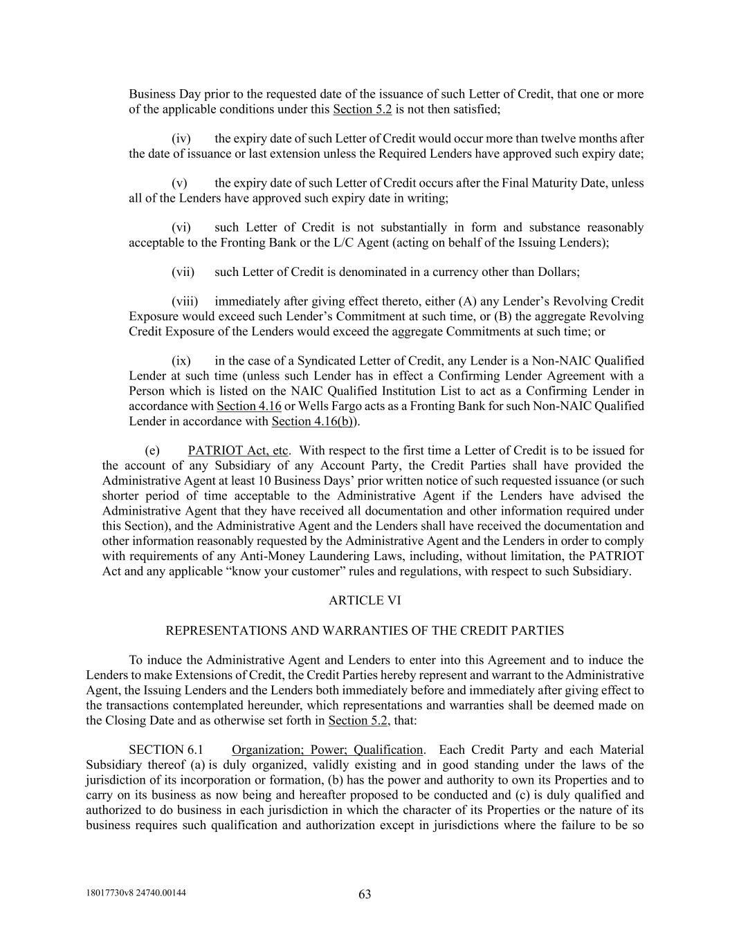 18017730v8 24740.00144 63 Business Day prior to the requested date of the issuance of such Letter of Credit, that one or more of the applicable conditions under this Section 5.2 is not then satisfied; (iv) the expiry date of such Letter of Credit would occur more than twelve months after the date of issuance or last extension unless the Required Lenders have approved such expiry date; (v) the expiry date of such Letter of Credit occurs after the Final Maturity Date, unless all of the Lenders have approved such expiry date in writing; (vi) such Letter of Credit is not substantially in form and substance reasonably acceptable to the Fronting Bank or the L/C Agent (acting on behalf of the Issuing Lenders); (vii) such Letter of Credit is denominated in a currency other than Dollars; (viii) immediately after giving effect thereto, either (A) any Lender’s Revolving Credit Exposure would exceed such Lender’s Commitment at such time, or (B) the aggregate Revolving Credit Exposure of the Lenders would exceed the aggregate Commitments at such time; or (ix) in the case of a Syndicated Letter of Credit, any Lender is a Non-NAIC Qualified Lender at such time (unless such Lender has in effect a Confirming Lender Agreement with a Person which is listed on the NAIC Qualified Institution List to act as a Confirming Lender in accordance with Section 4.16 or Wells Fargo acts as a Fronting Bank for such Non-NAIC Qualified Lender in accordance with Section 4.16(b)). (e) PATRIOT Act, etc. With respect to the first time a Letter of Credit is to be issued for the account of any Subsidiary of any Account Party, the Credit Parties shall have provided the Administrative Agent at least 10 Business Days’ prior written notice of such requested issuance (or such shorter period of time acceptable to the Administrative Agent if the Lenders have advised the Administrative Agent that they have received all documentation and other information required under this Section), and the Administrative Agent and the Lenders shall have received the documentation and other information reasonably requested by the Administrative Agent and the Lenders in order to comply with requirements of any Anti-Money Laundering Laws, including, without limitation, the PATRIOT Act and any applicable “know your customer” rules and regulations, with respect to such Subsidiary. ARTICLE VI REPRESENTATIONS AND WARRANTIES OF THE CREDIT PARTIES To induce the Administrative Agent and Lenders to enter into this Agreement and to induce the Lenders to make Extensions of Credit, the Credit Parties hereby represent and warrant to the Administrative Agent, the Issuing Lenders and the Lenders both immediately before and immediately after giving effect to the transactions contemplated hereunder, which representations and warranties shall be deemed made on the Closing Date and as otherwise set forth in Section 5.2, that: SECTION 6.1 Organization; Power; Qualification. Each Credit Party and each Material Subsidiary thereof (a) is duly organized, validly existing and in good standing under the laws of the jurisdiction of its incorporation or formation, (b) has the power and authority to own its Properties and to carry on its business as now being and hereafter proposed to be conducted and (c) is duly qualified and authorized to do business in each jurisdiction in which the character of its Properties or the nature of its business requires such qualification and authorization except in jurisdictions where the failure to be so