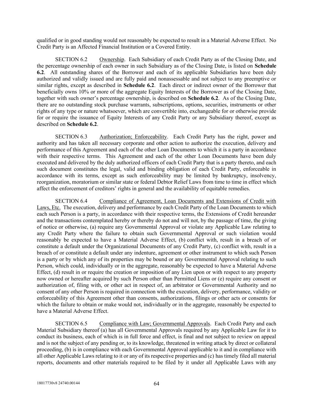 18017730v8 24740.00144 64 qualified or in good standing would not reasonably be expected to result in a Material Adverse Effect. No Credit Party is an Affected Financial Institution or a Covered Entity. SECTION 6.2 Ownership. Each Subsidiary of each Credit Party as of the Closing Date, and the percentage ownership of each owner in such Subsidiary as of the Closing Date, is listed on Schedule 6.2. All outstanding shares of the Borrower and each of its applicable Subsidiaries have been duly authorized and validly issued and are fully paid and nonassessable and not subject to any preemptive or similar rights, except as described in Schedule 6.2. Each direct or indirect owner of the Borrower that beneficially owns 10% or more of the aggregate Equity Interests of the Borrower as of the Closing Date, together with such owner’s percentage ownership, is described on Schedule 6.2. As of the Closing Date, there are no outstanding stock purchase warrants, subscriptions, options, securities, instruments or other rights of any type or nature whatsoever, which are convertible into, exchangeable for or otherwise provide for or require the issuance of Equity Interests of any Credit Party or any Subsidiary thereof, except as described on Schedule 6.2. SECTION 6.3 Authorization; Enforceability. Each Credit Party has the right, power and authority and has taken all necessary corporate and other action to authorize the execution, delivery and performance of this Agreement and each of the other Loan Documents to which it is a party in accordance with their respective terms. This Agreement and each of the other Loan Documents have been duly executed and delivered by the duly authorized officers of each Credit Party that is a party thereto, and each such document constitutes the legal, valid and binding obligation of each Credit Party, enforceable in accordance with its terms, except as such enforceability may be limited by bankruptcy, insolvency, reorganization, moratorium or similar state or federal Debtor Relief Laws from time to time in effect which affect the enforcement of creditors’ rights in general and the availability of equitable remedies. SECTION 6.4 Compliance of Agreement, Loan Documents and Extensions of Credit with Laws, Etc. The execution, delivery and performance by each Credit Party of the Loan Documents to which each such Person is a party, in accordance with their respective terms, the Extensions of Credit hereunder and the transactions contemplated hereby or thereby do not and will not, by the passage of time, the giving of notice or otherwise, (a) require any Governmental Approval or violate any Applicable Law relating to any Credit Party where the failure to obtain such Governmental Approval or such violation would reasonably be expected to have a Material Adverse Effect, (b) conflict with, result in a breach of or constitute a default under the Organizational Documents of any Credit Party, (c) conflict with, result in a breach of or constitute a default under any indenture, agreement or other instrument to which such Person is a party or by which any of its properties may be bound or any Governmental Approval relating to such Person, which could, individually or in the aggregate, reasonably be expected to have a Material Adverse Effect, (d) result in or require the creation or imposition of any Lien upon or with respect to any property now owned or hereafter acquired by such Person other than Permitted Liens or (e) require any consent or authorization of, filing with, or other act in respect of, an arbitrator or Governmental Authority and no consent of any other Person is required in connection with the execution, delivery, performance, validity or enforceability of this Agreement other than consents, authorizations, filings or other acts or consents for which the failure to obtain or make would not, individually or in the aggregate, reasonably be expected to have a Material Adverse Effect. SECTION 6.5 Compliance with Law; Governmental Approvals. Each Credit Party and each Material Subsidiary thereof (a) has all Governmental Approvals required by any Applicable Law for it to conduct its business, each of which is in full force and effect, is final and not subject to review on appeal and is not the subject of any pending or, to its knowledge, threatened in writing attack by direct or collateral proceeding, (b) is in compliance with each Governmental Approval applicable to it and in compliance with all other Applicable Laws relating to it or any of its respective properties and (c) has timely filed all material reports, documents and other materials required to be filed by it under all Applicable Laws with any
