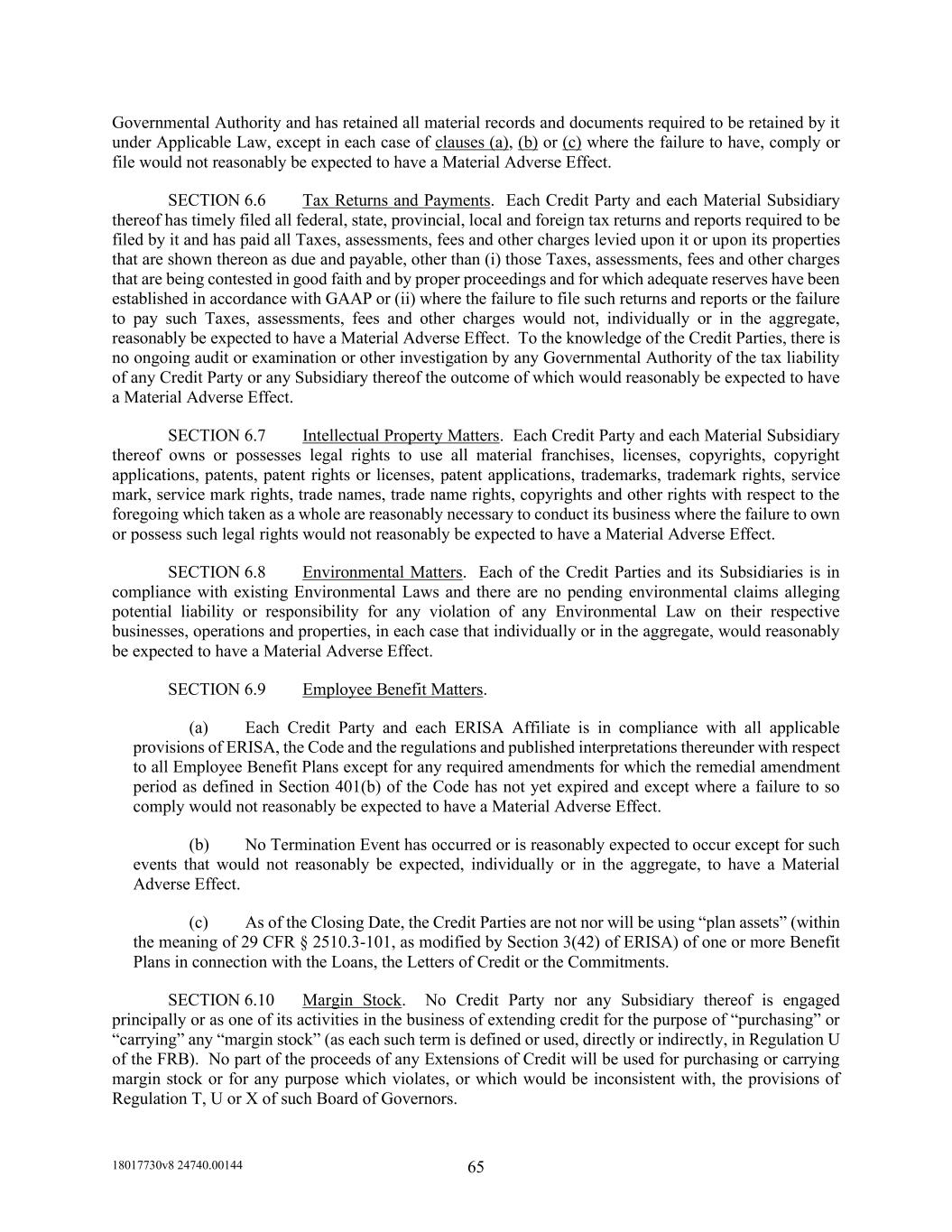 18017730v8 24740.00144 65 Governmental Authority and has retained all material records and documents required to be retained by it under Applicable Law, except in each case of clauses (a), (b) or (c) where the failure to have, comply or file would not reasonably be expected to have a Material Adverse Effect. SECTION 6.6 Tax Returns and Payments. Each Credit Party and each Material Subsidiary thereof has timely filed all federal, state, provincial, local and foreign tax returns and reports required to be filed by it and has paid all Taxes, assessments, fees and other charges levied upon it or upon its properties that are shown thereon as due and payable, other than (i) those Taxes, assessments, fees and other charges that are being contested in good faith and by proper proceedings and for which adequate reserves have been established in accordance with GAAP or (ii) where the failure to file such returns and reports or the failure to pay such Taxes, assessments, fees and other charges would not, individually or in the aggregate, reasonably be expected to have a Material Adverse Effect. To the knowledge of the Credit Parties, there is no ongoing audit or examination or other investigation by any Governmental Authority of the tax liability of any Credit Party or any Subsidiary thereof the outcome of which would reasonably be expected to have a Material Adverse Effect. SECTION 6.7 Intellectual Property Matters. Each Credit Party and each Material Subsidiary thereof owns or possesses legal rights to use all material franchises, licenses, copyrights, copyright applications, patents, patent rights or licenses, patent applications, trademarks, trademark rights, service mark, service mark rights, trade names, trade name rights, copyrights and other rights with respect to the foregoing which taken as a whole are reasonably necessary to conduct its business where the failure to own or possess such legal rights would not reasonably be expected to have a Material Adverse Effect. SECTION 6.8 Environmental Matters. Each of the Credit Parties and its Subsidiaries is in compliance with existing Environmental Laws and there are no pending environmental claims alleging potential liability or responsibility for any violation of any Environmental Law on their respective businesses, operations and properties, in each case that individually or in the aggregate, would reasonably be expected to have a Material Adverse Effect. SECTION 6.9 Employee Benefit Matters. (a) Each Credit Party and each ERISA Affiliate is in compliance with all applicable provisions of ERISA, the Code and the regulations and published interpretations thereunder with respect to all Employee Benefit Plans except for any required amendments for which the remedial amendment period as defined in Section 401(b) of the Code has not yet expired and except where a failure to so comply would not reasonably be expected to have a Material Adverse Effect. (b) No Termination Event has occurred or is reasonably expected to occur except for such events that would not reasonably be expected, individually or in the aggregate, to have a Material Adverse Effect. (c) As of the Closing Date, the Credit Parties are not nor will be using “plan assets” (within the meaning of 29 CFR § 2510.3-101, as modified by Section 3(42) of ERISA) of one or more Benefit Plans in connection with the Loans, the Letters of Credit or the Commitments. SECTION 6.10 Margin Stock. No Credit Party nor any Subsidiary thereof is engaged principally or as one of its activities in the business of extending credit for the purpose of “purchasing” or “carrying” any “margin stock” (as each such term is defined or used, directly or indirectly, in Regulation U of the FRB). No part of the proceeds of any Extensions of Credit will be used for purchasing or carrying margin stock or for any purpose which violates, or which would be inconsistent with, the provisions of Regulation T, U or X of such Board of Governors.
