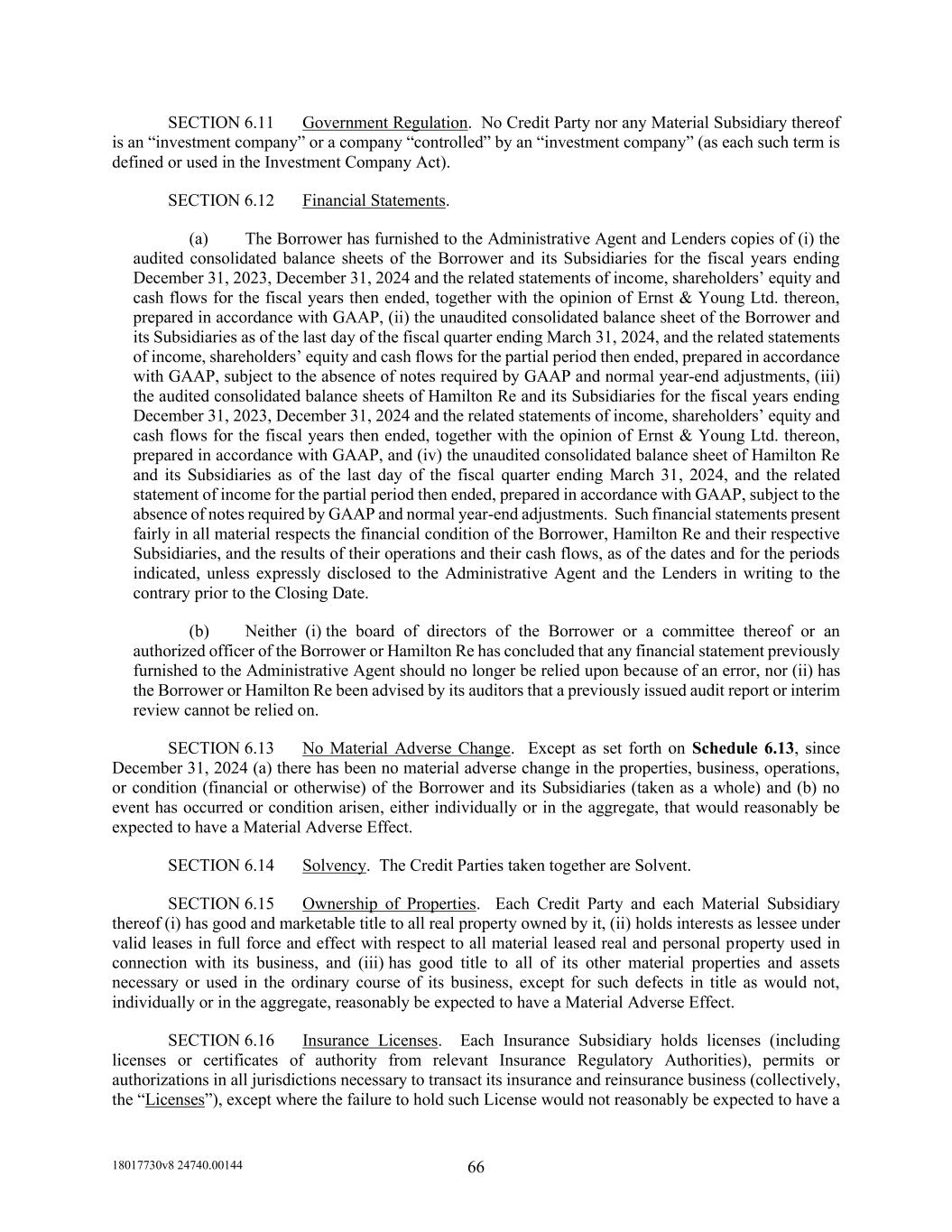 18017730v8 24740.00144 66 SECTION 6.11 Government Regulation. No Credit Party nor any Material Subsidiary thereof is an “investment company” or a company “controlled” by an “investment company” (as each such term is defined or used in the Investment Company Act). SECTION 6.12 Financial Statements. (a) The Borrower has furnished to the Administrative Agent and Lenders copies of (i) the audited consolidated balance sheets of the Borrower and its Subsidiaries for the fiscal years ending December 31, 2023, December 31, 2024 and the related statements of income, shareholders’ equity and cash flows for the fiscal years then ended, together with the opinion of Ernst & Young Ltd. thereon, prepared in accordance with GAAP, (ii) the unaudited consolidated balance sheet of the Borrower and its Subsidiaries as of the last day of the fiscal quarter ending March 31, 2024, and the related statements of income, shareholders’ equity and cash flows for the partial period then ended, prepared in accordance with GAAP, subject to the absence of notes required by GAAP and normal year-end adjustments, (iii) the audited consolidated balance sheets of Hamilton Re and its Subsidiaries for the fiscal years ending December 31, 2023, December 31, 2024 and the related statements of income, shareholders’ equity and cash flows for the fiscal years then ended, together with the opinion of Ernst & Young Ltd. thereon, prepared in accordance with GAAP, and (iv) the unaudited consolidated balance sheet of Hamilton Re and its Subsidiaries as of the last day of the fiscal quarter ending March 31, 2024, and the related statement of income for the partial period then ended, prepared in accordance with GAAP, subject to the absence of notes required by GAAP and normal year-end adjustments. Such financial statements present fairly in all material respects the financial condition of the Borrower, Hamilton Re and their respective Subsidiaries, and the results of their operations and their cash flows, as of the dates and for the periods indicated, unless expressly disclosed to the Administrative Agent and the Lenders in writing to the contrary prior to the Closing Date. (b) Neither (i) the board of directors of the Borrower or a committee thereof or an authorized officer of the Borrower or Hamilton Re has concluded that any financial statement previously furnished to the Administrative Agent should no longer be relied upon because of an error, nor (ii) has the Borrower or Hamilton Re been advised by its auditors that a previously issued audit report or interim review cannot be relied on. SECTION 6.13 No Material Adverse Change. Except as set forth on Schedule 6.13, since December 31, 2024 (a) there has been no material adverse change in the properties, business, operations, or condition (financial or otherwise) of the Borrower and its Subsidiaries (taken as a whole) and (b) no event has occurred or condition arisen, either individually or in the aggregate, that would reasonably be expected to have a Material Adverse Effect. SECTION 6.14 Solvency. The Credit Parties taken together are Solvent. SECTION 6.15 Ownership of Properties. Each Credit Party and each Material Subsidiary thereof (i) has good and marketable title to all real property owned by it, (ii) holds interests as lessee under valid leases in full force and effect with respect to all material leased real and personal property used in connection with its business, and (iii) has good title to all of its other material properties and assets necessary or used in the ordinary course of its business, except for such defects in title as would not, individually or in the aggregate, reasonably be expected to have a Material Adverse Effect. SECTION 6.16 Insurance Licenses. Each Insurance Subsidiary holds licenses (including licenses or certificates of authority from relevant Insurance Regulatory Authorities), permits or authorizations in all jurisdictions necessary to transact its insurance and reinsurance business (collectively, the “Licenses”), except where the failure to hold such License would not reasonably be expected to have a
