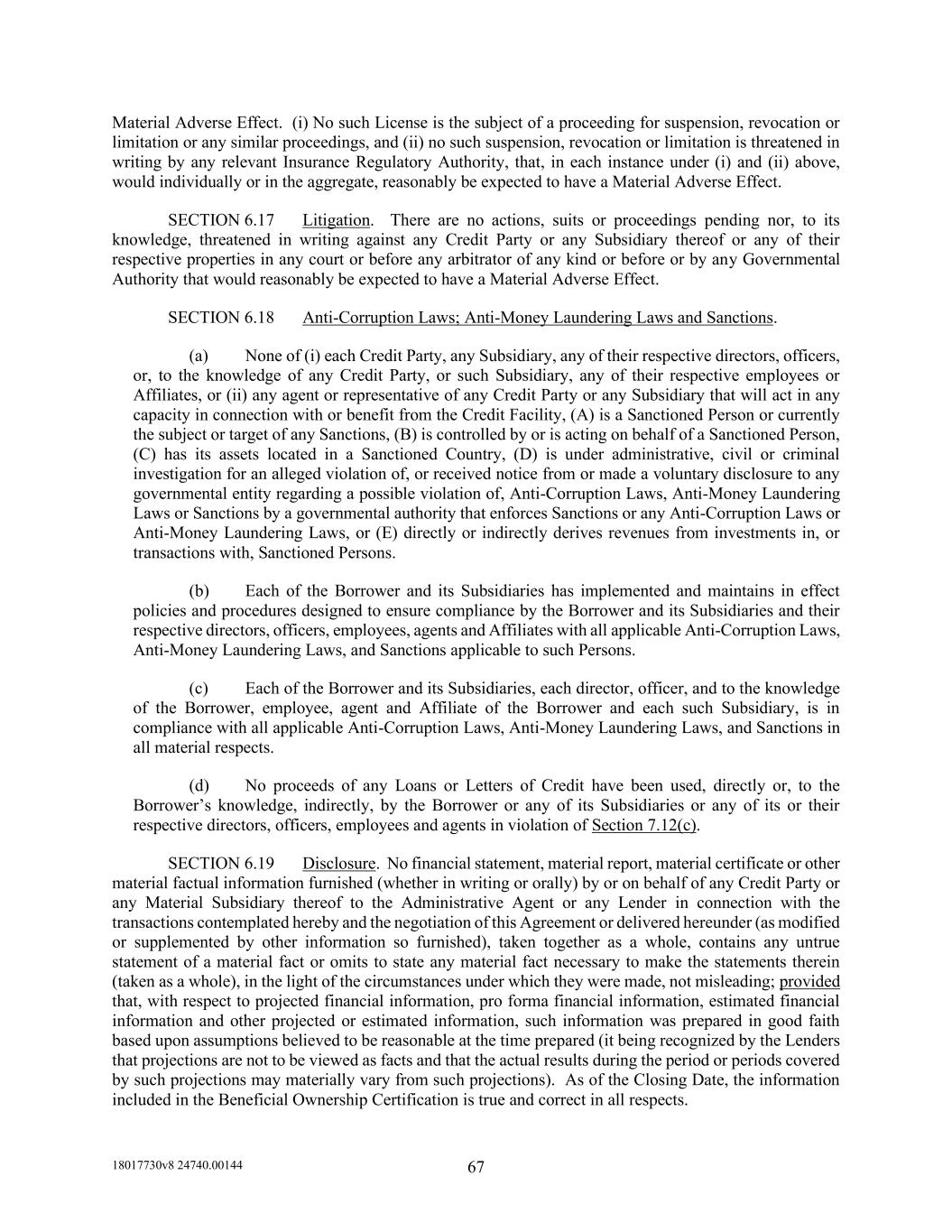 18017730v8 24740.00144 67 Material Adverse Effect. (i) No such License is the subject of a proceeding for suspension, revocation or limitation or any similar proceedings, and (ii) no such suspension, revocation or limitation is threatened in writing by any relevant Insurance Regulatory Authority, that, in each instance under (i) and (ii) above, would individually or in the aggregate, reasonably be expected to have a Material Adverse Effect. SECTION 6.17 Litigation. There are no actions, suits or proceedings pending nor, to its knowledge, threatened in writing against any Credit Party or any Subsidiary thereof or any of their respective properties in any court or before any arbitrator of any kind or before or by any Governmental Authority that would reasonably be expected to have a Material Adverse Effect. SECTION 6.18 Anti-Corruption Laws; Anti-Money Laundering Laws and Sanctions. (a) None of (i) each Credit Party, any Subsidiary, any of their respective directors, officers, or, to the knowledge of any Credit Party, or such Subsidiary, any of their respective employees or Affiliates, or (ii) any agent or representative of any Credit Party or any Subsidiary that will act in any capacity in connection with or benefit from the Credit Facility, (A) is a Sanctioned Person or currently the subject or target of any Sanctions, (B) is controlled by or is acting on behalf of a Sanctioned Person, (C) has its assets located in a Sanctioned Country, (D) is under administrative, civil or criminal investigation for an alleged violation of, or received notice from or made a voluntary disclosure to any governmental entity regarding a possible violation of, Anti-Corruption Laws, Anti-Money Laundering Laws or Sanctions by a governmental authority that enforces Sanctions or any Anti-Corruption Laws or Anti-Money Laundering Laws, or (E) directly or indirectly derives revenues from investments in, or transactions with, Sanctioned Persons. (b) Each of the Borrower and its Subsidiaries has implemented and maintains in effect policies and procedures designed to ensure compliance by the Borrower and its Subsidiaries and their respective directors, officers, employees, agents and Affiliates with all applicable Anti-Corruption Laws, Anti-Money Laundering Laws, and Sanctions applicable to such Persons. (c) Each of the Borrower and its Subsidiaries, each director, officer, and to the knowledge of the Borrower, employee, agent and Affiliate of the Borrower and each such Subsidiary, is in compliance with all applicable Anti-Corruption Laws, Anti-Money Laundering Laws, and Sanctions in all material respects. (d) No proceeds of any Loans or Letters of Credit have been used, directly or, to the Borrower’s knowledge, indirectly, by the Borrower or any of its Subsidiaries or any of its or their respective directors, officers, employees and agents in violation of Section 7.12(c). SECTION 6.19 Disclosure. No financial statement, material report, material certificate or other material factual information furnished (whether in writing or orally) by or on behalf of any Credit Party or any Material Subsidiary thereof to the Administrative Agent or any Lender in connection with the transactions contemplated hereby and the negotiation of this Agreement or delivered hereunder (as modified or supplemented by other information so furnished), taken together as a whole, contains any untrue statement of a material fact or omits to state any material fact necessary to make the statements therein (taken as a whole), in the light of the circumstances under which they were made, not misleading; provided that, with respect to projected financial information, pro forma financial information, estimated financial information and other projected or estimated information, such information was prepared in good faith based upon assumptions believed to be reasonable at the time prepared (it being recognized by the Lenders that projections are not to be viewed as facts and that the actual results during the period or periods covered by such projections may materially vary from such projections). As of the Closing Date, the information included in the Beneficial Ownership Certification is true and correct in all respects.