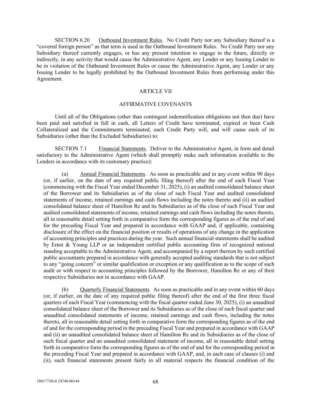 18017730v8 24740.00144 68 SECTION 6.20 Outbound Investment Rules. No Credit Party nor any Subsidiary thereof is a “covered foreign person” as that term is used in the Outbound Investment Rules. No Credit Party nor any Subsidiary thereof currently engages, or has any present intention to engage in the future, directly or indirectly, in any activity that would cause the Administrative Agent, any Lender or any Issuing Lender to be in violation of the Outbound Investment Rules or cause the Administrative Agent, any Lender or any Issuing Lender to be legally prohibited by the Outbound Investment Rules from performing under this Agreement. ARTICLE VII AFFIRMATIVE COVENANTS Until all of the Obligations (other than contingent indemnification obligations not then due) have been paid and satisfied in full in cash, all Letters of Credit have terminated, expired or been Cash Collateralized and the Commitments terminated, each Credit Party will, and will cause each of its Subsidiaries (other than the Excluded Subsidiaries) to: SECTION 7.1 Financial Statements. Deliver to the Administrative Agent, in form and detail satisfactory to the Administrative Agent (which shall promptly make such information available to the Lenders in accordance with its customary practice): (a) Annual Financial Statements. As soon as practicable and in any event within 90 days (or, if earlier, on the date of any required public filing thereof) after the end of each Fiscal Year (commencing with the Fiscal Year ended December 31, 2025), (i) an audited consolidated balance sheet of the Borrower and its Subsidiaries as of the close of such Fiscal Year and audited consolidated statements of income, retained earnings and cash flows including the notes thereto and (ii) an audited consolidated balance sheet of Hamilton Re and its Subsidiaries as of the close of such Fiscal Year and audited consolidated statements of income, retained earnings and cash flows including the notes thereto, all in reasonable detail setting forth in comparative form the corresponding figures as of the end of and for the preceding Fiscal Year and prepared in accordance with GAAP and, if applicable, containing disclosure of the effect on the financial position or results of operations of any change in the application of accounting principles and practices during the year. Such annual financial statements shall be audited by Ernst & Young LLP or an independent certified public accounting firm of recognized national standing acceptable to the Administrative Agent, and accompanied by a report thereon by such certified public accountants prepared in accordance with generally accepted auditing standards that is not subject to any “going concern” or similar qualification or exception or any qualification as to the scope of such audit or with respect to accounting principles followed by the Borrower, Hamilton Re or any of their respective Subsidiaries not in accordance with GAAP. (b) Quarterly Financial Statements. As soon as practicable and in any event within 60 days (or, if earlier, on the date of any required public filing thereof) after the end of the first three fiscal quarters of each Fiscal Year (commencing with the fiscal quarter ended June 30, 2025), (i) an unaudited consolidated balance sheet of the Borrower and its Subsidiaries as of the close of such fiscal quarter and unaudited consolidated statements of income, retained earnings and cash flows, including the notes thereto, all in reasonable detail setting forth in comparative form the corresponding figures as of the end of and for the corresponding period in the preceding Fiscal Year and prepared in accordance with GAAP and (ii) an unaudited consolidated balance sheet of Hamilton Re and its Subsidiaries as of the close of such fiscal quarter and an unaudited consolidated statement of income, all in reasonable detail setting forth in comparative form the corresponding figures as of the end of and for the corresponding period in the preceding Fiscal Year and prepared in accordance with GAAP, and, in each case of clauses (i) and (ii), such financial statements present fairly in all material respects the financial condition of the