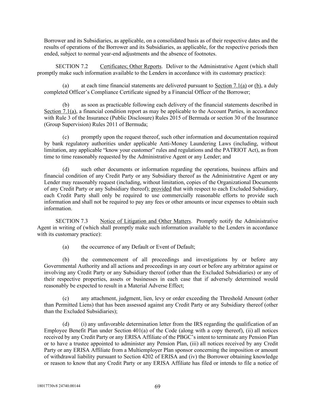 18017730v8 24740.00144 69 Borrower and its Subsidiaries, as applicable, on a consolidated basis as of their respective dates and the results of operations of the Borrower and its Subsidiaries, as applicable, for the respective periods then ended, subject to normal year-end adjustments and the absence of footnotes. SECTION 7.2 Certificates; Other Reports. Deliver to the Administrative Agent (which shall promptly make such information available to the Lenders in accordance with its customary practice): (a) at each time financial statements are delivered pursuant to Section 7.1(a) or (b), a duly completed Officer’s Compliance Certificate signed by a Financial Officer of the Borrower; (b) as soon as practicable following each delivery of the financial statements described in Section 7.1(a), a financial condition report as may be applicable to the Account Parties, in accordance with Rule 3 of the Insurance (Public Disclosure) Rules 2015 of Bermuda or section 30 of the Insurance (Group Supervision) Rules 2011 of Bermuda; (c) promptly upon the request thereof, such other information and documentation required by bank regulatory authorities under applicable Anti-Money Laundering Laws (including, without limitation, any applicable “know your customer” rules and regulations and the PATRIOT Act), as from time to time reasonably requested by the Administrative Agent or any Lender; and (d) such other documents or information regarding the operations, business affairs and financial condition of any Credit Party or any Subsidiary thereof as the Administrative Agent or any Lender may reasonably request (including, without limitation, copies of the Organizational Documents of any Credit Party or any Subsidiary thereof); provided that with respect to each Excluded Subsidiary, each Credit Party shall only be required to use commercially reasonable efforts to provide such information and shall not be required to pay any fees or other amounts or incur expenses to obtain such information. SECTION 7.3 Notice of Litigation and Other Matters. Promptly notify the Administrative Agent in writing of (which shall promptly make such information available to the Lenders in accordance with its customary practice): (a) the occurrence of any Default or Event of Default; (b) the commencement of all proceedings and investigations by or before any Governmental Authority and all actions and proceedings in any court or before any arbitrator against or involving any Credit Party or any Subsidiary thereof (other than the Excluded Subsidiaries) or any of their respective properties, assets or businesses in each case that if adversely determined would reasonably be expected to result in a Material Adverse Effect; (c) any attachment, judgment, lien, levy or order exceeding the Threshold Amount (other than Permitted Liens) that has been assessed against any Credit Party or any Subsidiary thereof (other than the Excluded Subsidiaries); (d) (i) any unfavorable determination letter from the IRS regarding the qualification of an Employee Benefit Plan under Section 401(a) of the Code (along with a copy thereof), (ii) all notices received by any Credit Party or any ERISA Affiliate of the PBGC’s intent to terminate any Pension Plan or to have a trustee appointed to administer any Pension Plan, (iii) all notices received by any Credit Party or any ERISA Affiliate from a Multiemployer Plan sponsor concerning the imposition or amount of withdrawal liability pursuant to Section 4202 of ERISA and (iv) the Borrower obtaining knowledge or reason to know that any Credit Party or any ERISA Affiliate has filed or intends to file a notice of